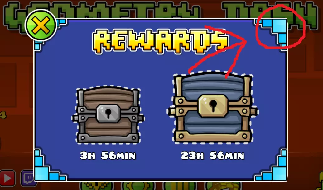 Number One Fan!(头号粉丝!) 在Facebook上为《几何冲刺》点赞 在每日标签页中点击免费按钮,那里会有包含这些奖励的宝箱(我没有免费按钮,因为已经全部领取了)