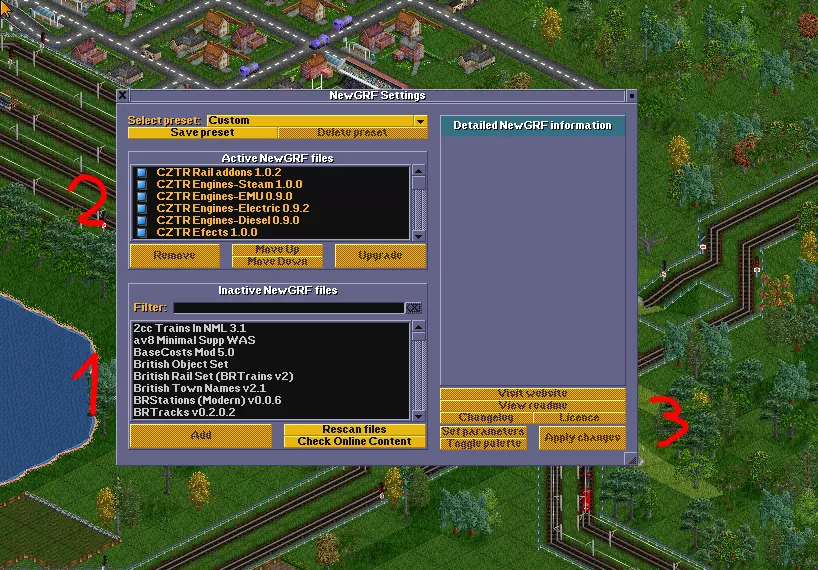 1. 【非活动NewGRF文件】- 不会加载到游戏中的模组 2. 【活动NewGRF文件】- 会加载到游戏中的模组 3. 【应用更改】- 应用您所做的任何修改