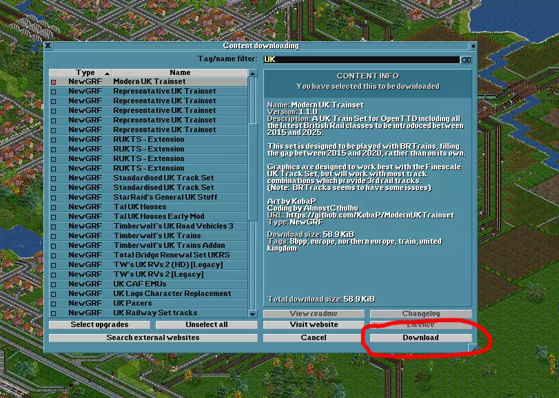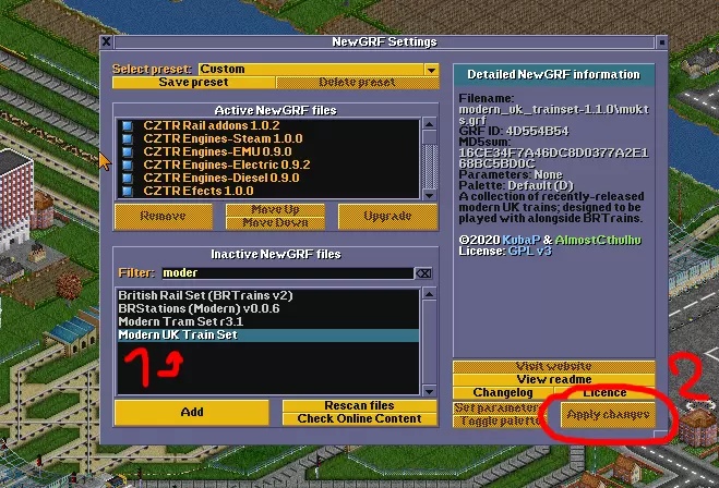 1. 双击你下载的模组,该模组应显示在“活动NewGRF文件”中 2. 应用更改