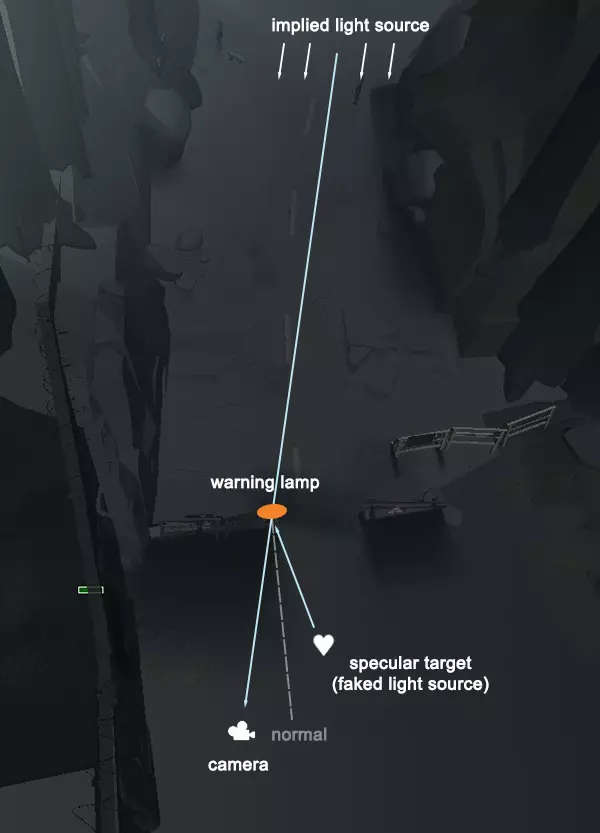 此警示灯的半透明效果是通过高光贴花模拟实现的。这种自定义贴花由两个部分组成:贴花本身(用于投射效果的可缩放体积)和目标点(指示产生高光的光源位置的对象)。 在这个案例中,我将目标点放置在前景,这样当背景中的明亮区域经过灯具后方时,贴花效果就会逐渐显现。最终呈现出的效果是,一个完全不透明的物体看起来像是有部分背光穿透了它。
