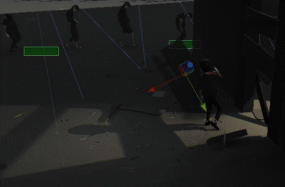 你看到的随木板移动的大型蓝色线框是AO贴花。从掉落的混凝土块到生物本身,所有物体都放置了多个此类AO贴花,以营造这种接地效果。数码管计数器