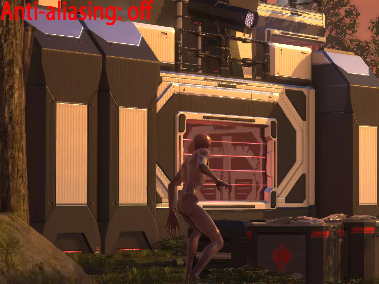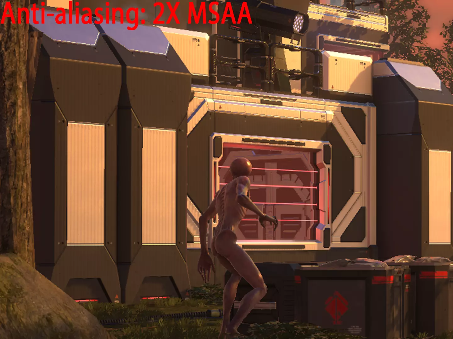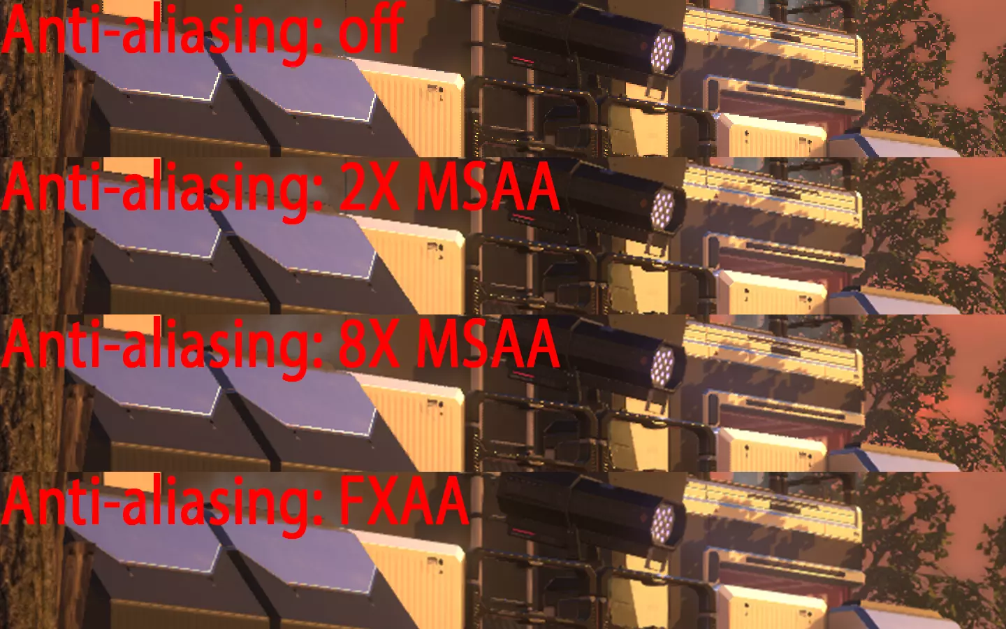 其他性能测试详情: - 禁用【屏幕空间反射】本身可提升5-10%的性能,具体取决于其他已启用的选项。该选项会改善反射和光照的显示效果。 - 阴影质量从【最高】降至【高】→ 帧率无提升 - 阴影质量从【高】降至【中】→ 帧率提升约25% - 阴影质量从【中】降至【低】→ 帧率提升约5% - 将【景深】从【散景】切换为【简单】可提升约10%的性能,且视觉质量差异不大 - 将【景深】从【简单】切换为【禁用】无性能提升 - 将【贴花】从【所有贴花】切换为【所有静态贴花】,在基础视角下可提升10-15%的性能 - 降低【绘制距离】的效果因地图而异将其降至“中等”可带来小幅性能提升,但会明显缩短物体以完整细节模型和纹理渲染的距离。将其降至“低”可显著提升性能(25%或更高),但这通常会导致非常明显的模型突然加载现象,应尽可能避免。 禁用“高分辨率半透明”“ bloom”“镜头污渍”和“次表面散射”在我的测试中几乎没有性能提升,因此你可以放心开启它们。“高分辨率半透明”和“次表面散射”可能仅在我未测试的特定场景中使用;“ bloom”和“镜头污渍”对性能没有影响,纯粹取决于用户偏好。- 将最高纹理过滤选项(16倍各向异性过滤)调整为最低选项(双线性过滤)仅能带来约2%的性能提升,且会显著降低纹理的显示效果。除非使用的是极低配置的显卡,否则没有理由将纹理过滤设置低于8倍各向异性过滤。 抗锯齿 以下是《幽浮2》中不同抗锯齿选项的200%裁剪截图对比: 无抗锯齿