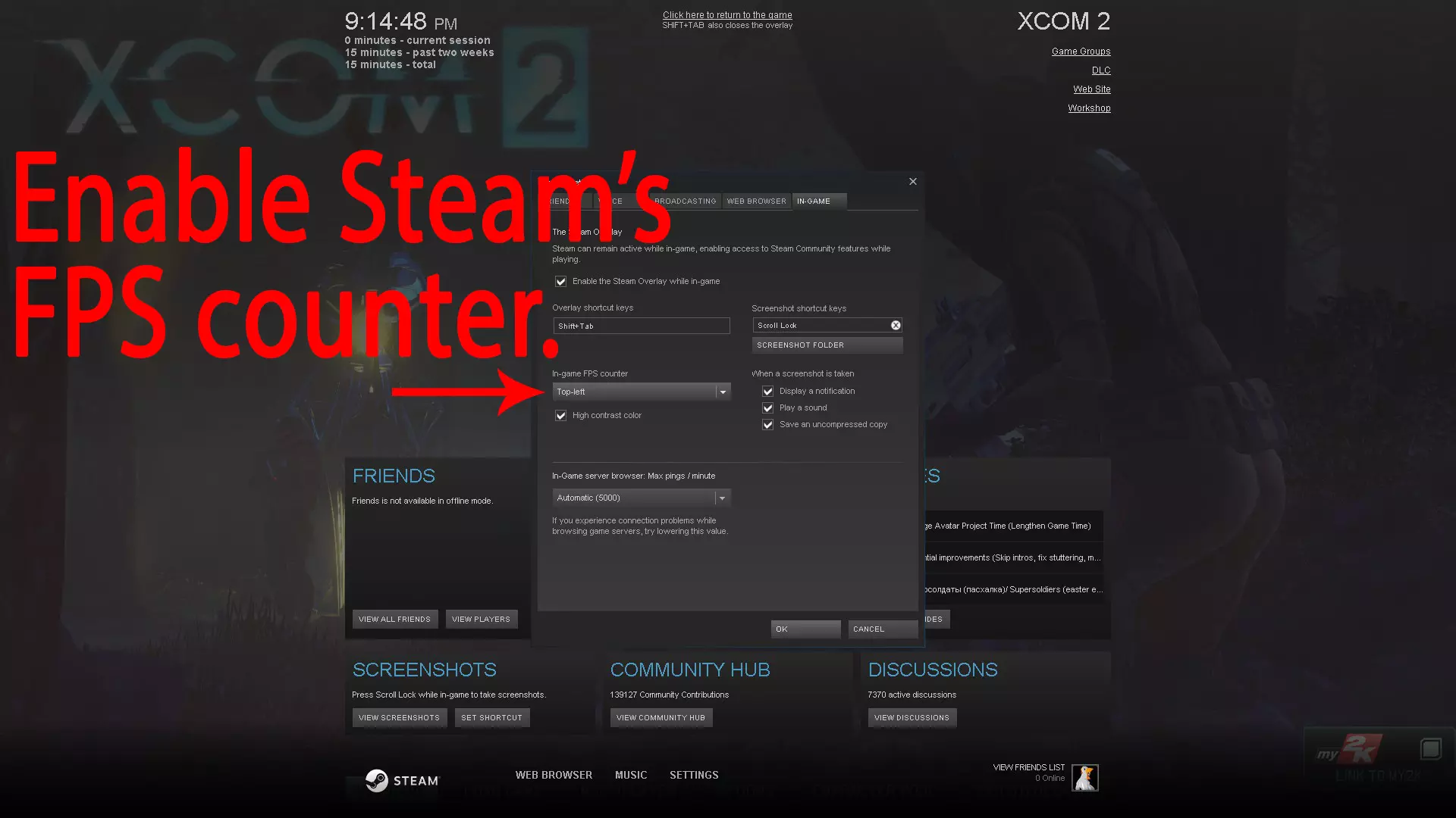 通过几个简单步骤让《幽浮2》运行更流畅。 帧率平滑 禁用“帧率平滑”可以显著提升整体性能,但代价是帧率稳定性会降低。 启用Steam内置的FPS计数器,这样我们就能快速看到效果。