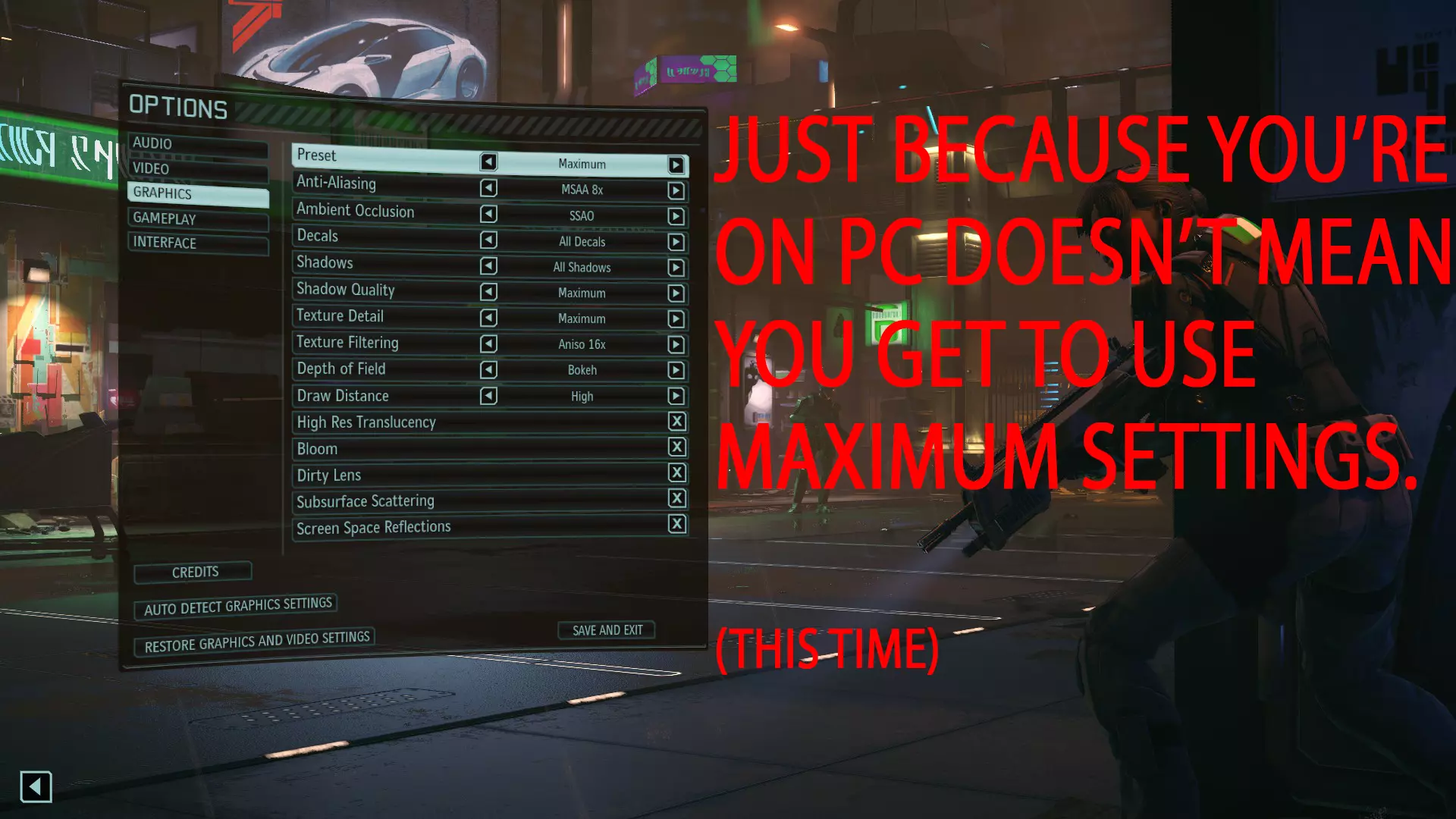 我们在PC上玩到的几乎所有“3A”游戏都是性能不足的主机移植版,这使得人们习惯了在最高设置下获得完美性能。不过,《幽浮2》是一款PC独占游戏,针对PC平台的开发者通常会加入可选的“超高”设置,这些设置带来的视觉提升非常小,但却会显著消耗性能。一开始很难分辨哪些设置重要,哪些不重要。这正是我下一部分要讲的内容。 当要求自动检测适合你硬件的设置时,《幽浮2》的目标是最低40 FPS,而不是我们大多数人通常期望的最低60 FPS。“可接受”的帧率取决于用户偏好,并且通常会因游戏类型而异。有些人更喜欢30帧搭配更高的画面质量,而非60帧搭配较低的画面质量;另一些人则坚持认为任何低于144帧的情况都是对他们权利的侵犯。由于《幽浮2》是一款节奏相对较慢的游戏,较低的帧率可能不会那么令人难以接受。合理的画面设置