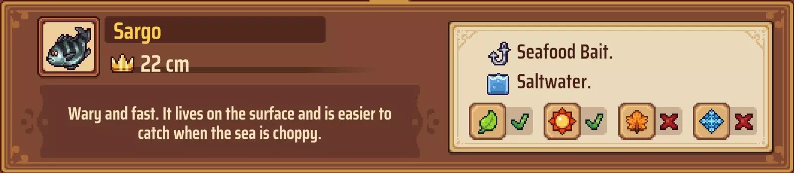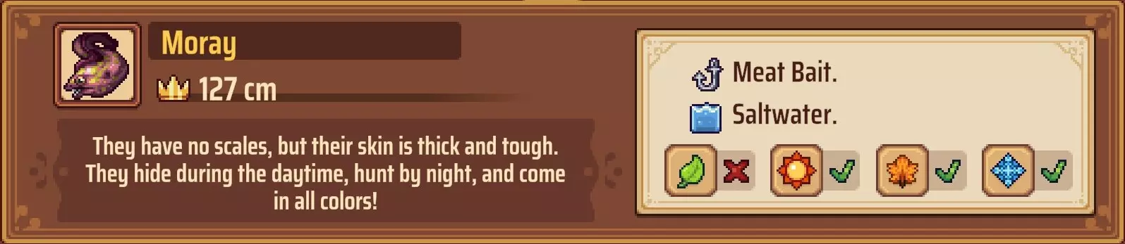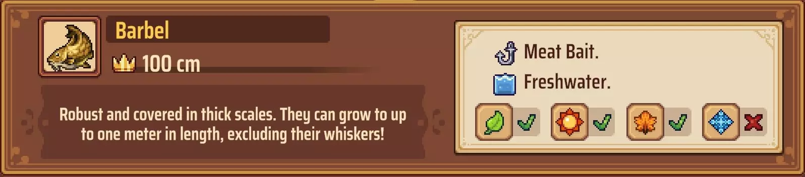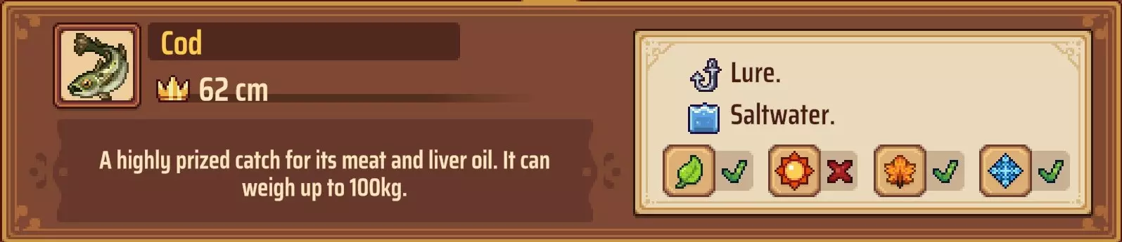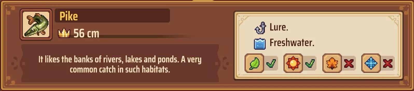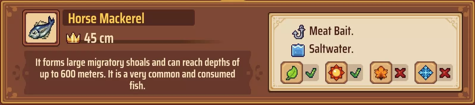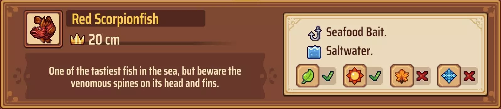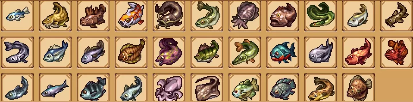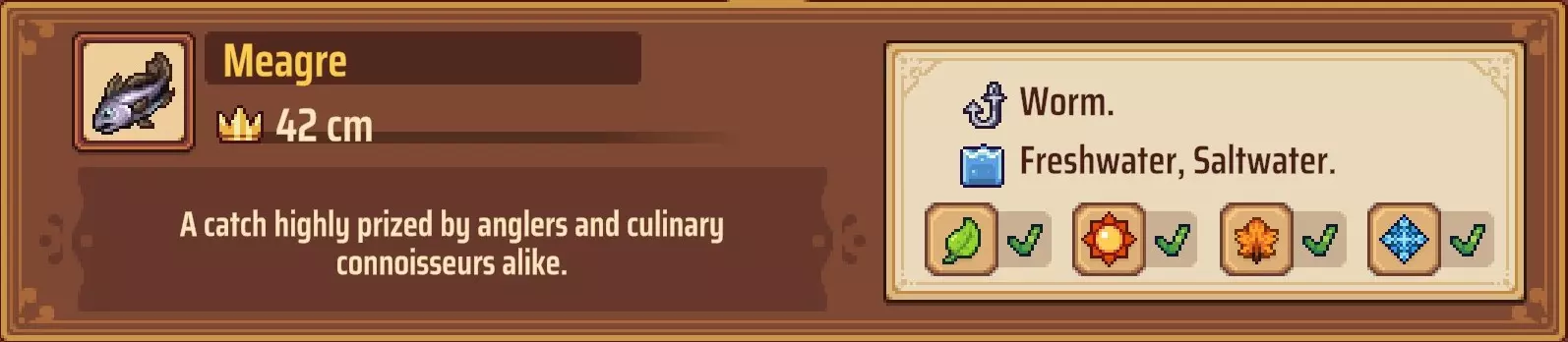 【成就:Reel Pro】捕获10种不同类型的鱼: 这个成就和下一个成就是同类型任务的两个难度;你可以自己探索(通过更换地点、鱼饵和季节)来尝试找到所有可能的鱼类,或者如果你需要帮助了解某些鱼类的生成条件,可以参考下一个成就中列出的清单。