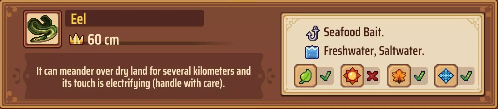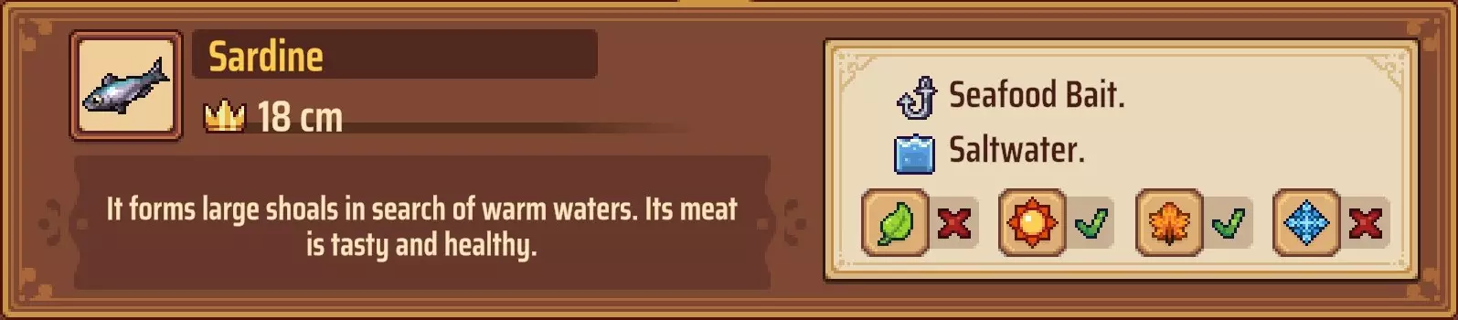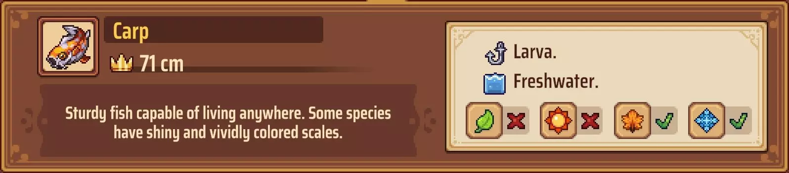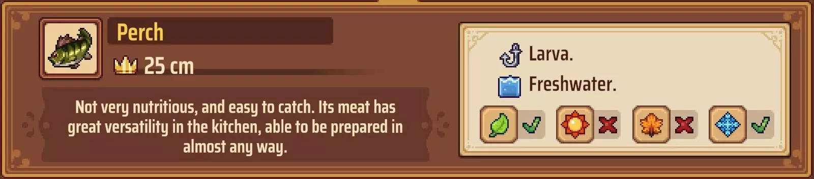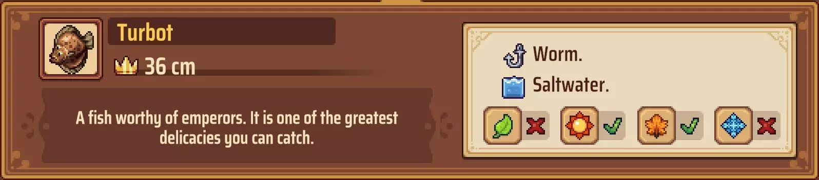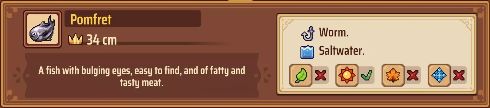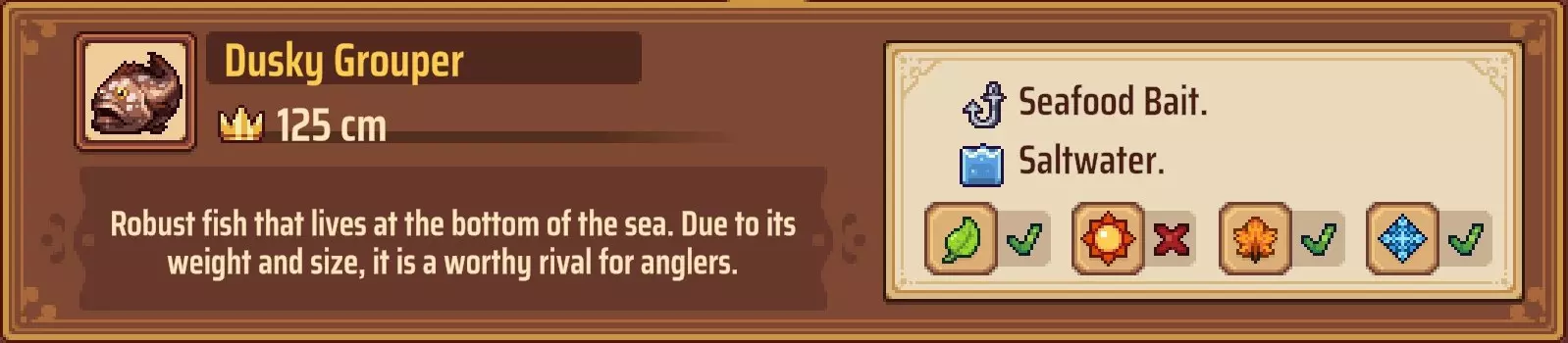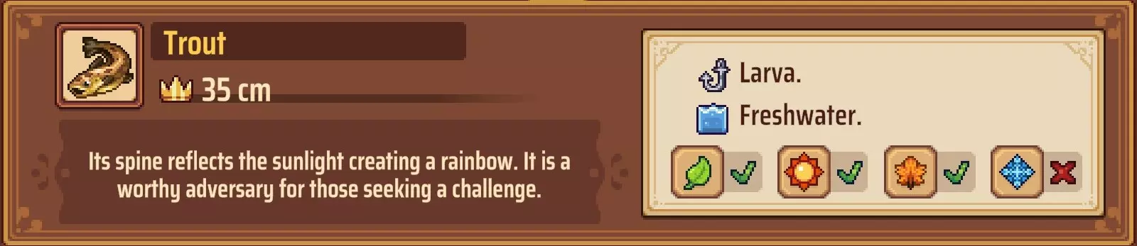 【成就:Reel Pro】捕获10种不同类型的鱼: 这个成就和下一个成就是同类型任务的两个难度;你可以自己探索(通过更换地点、鱼饵和季节)来尝试找到所有可能的鱼类,或者如果你需要帮助了解某些鱼类的生成条件,可以参考下一个成就中列出的清单。