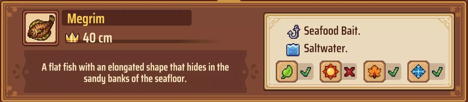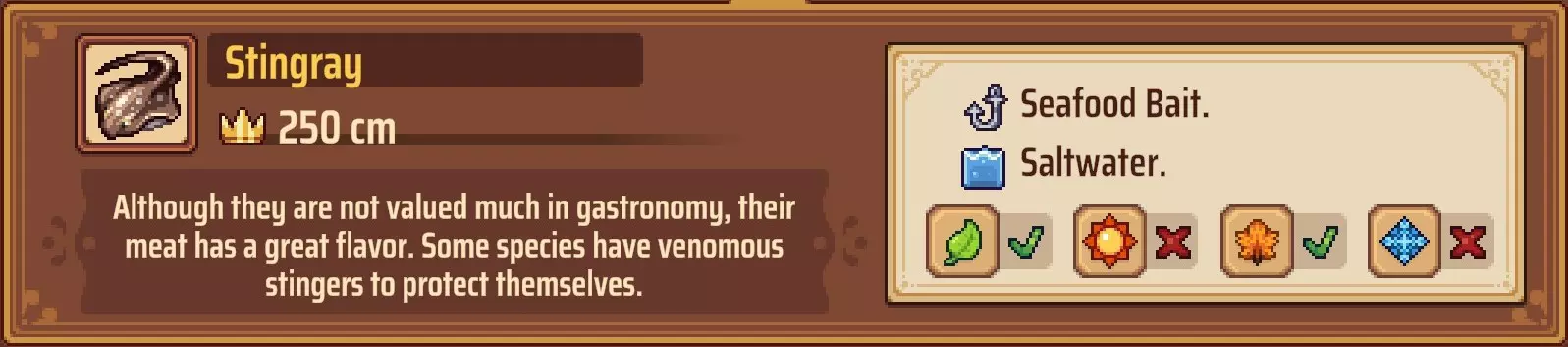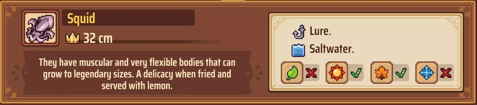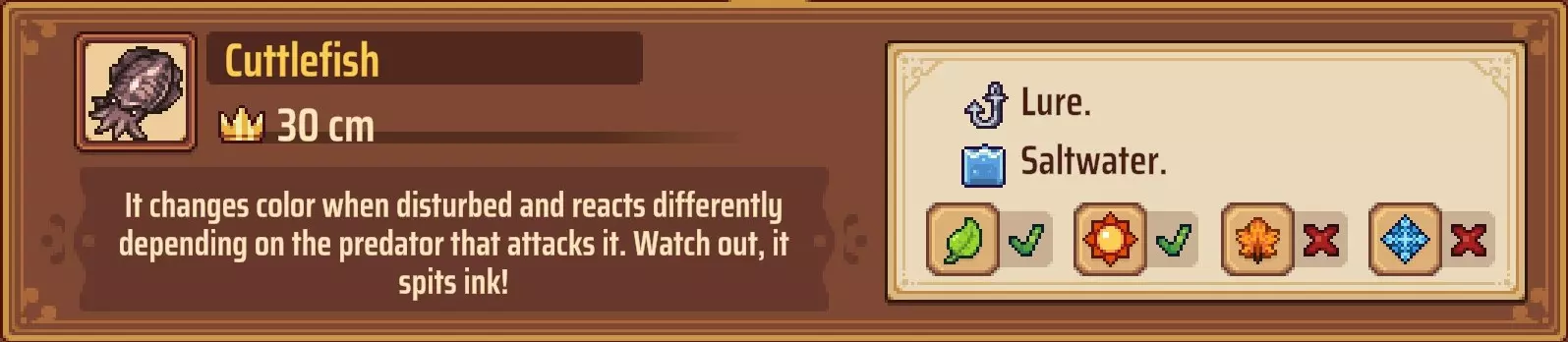 海鲜诱饵:与之前的诱饵相同,可以从Hikari处购买,也可以在制作站制作。制作材料为海鲜,你可以在海滩上标有“X”的位置采集海鲜,或者在海滩西侧区域找到一些大岩石,每天可以从那里采集贻贝。和肉类诱饵一样,每块海鲜可以制作5个诱饵。