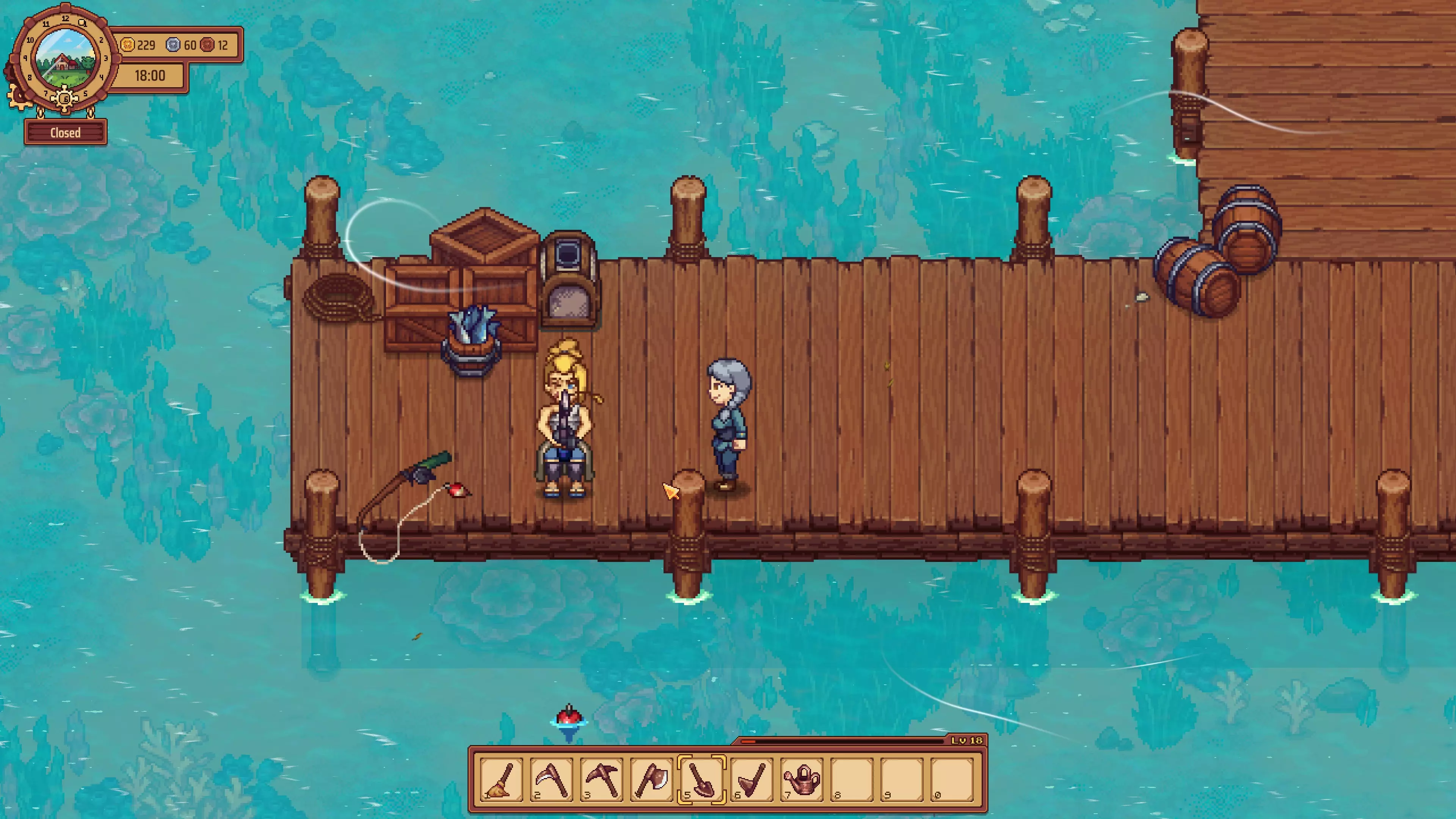 【成就:Hot Rod】获取你的第一根鱼竿 前往酒馆的最南端,接着到森林的西南方向,再往农场的南边走去,就能到达海滩区域。在这里,你会看到一个码头,有个金发女孩正在钓鱼,她就是光。上前和她简短对话后离开,你会发现她头顶出现对话气泡,示意你回去。之后,她会让你拿走她左边的旧鱼竿,成就会自动解锁。随后,她会教你如何钓鱼。