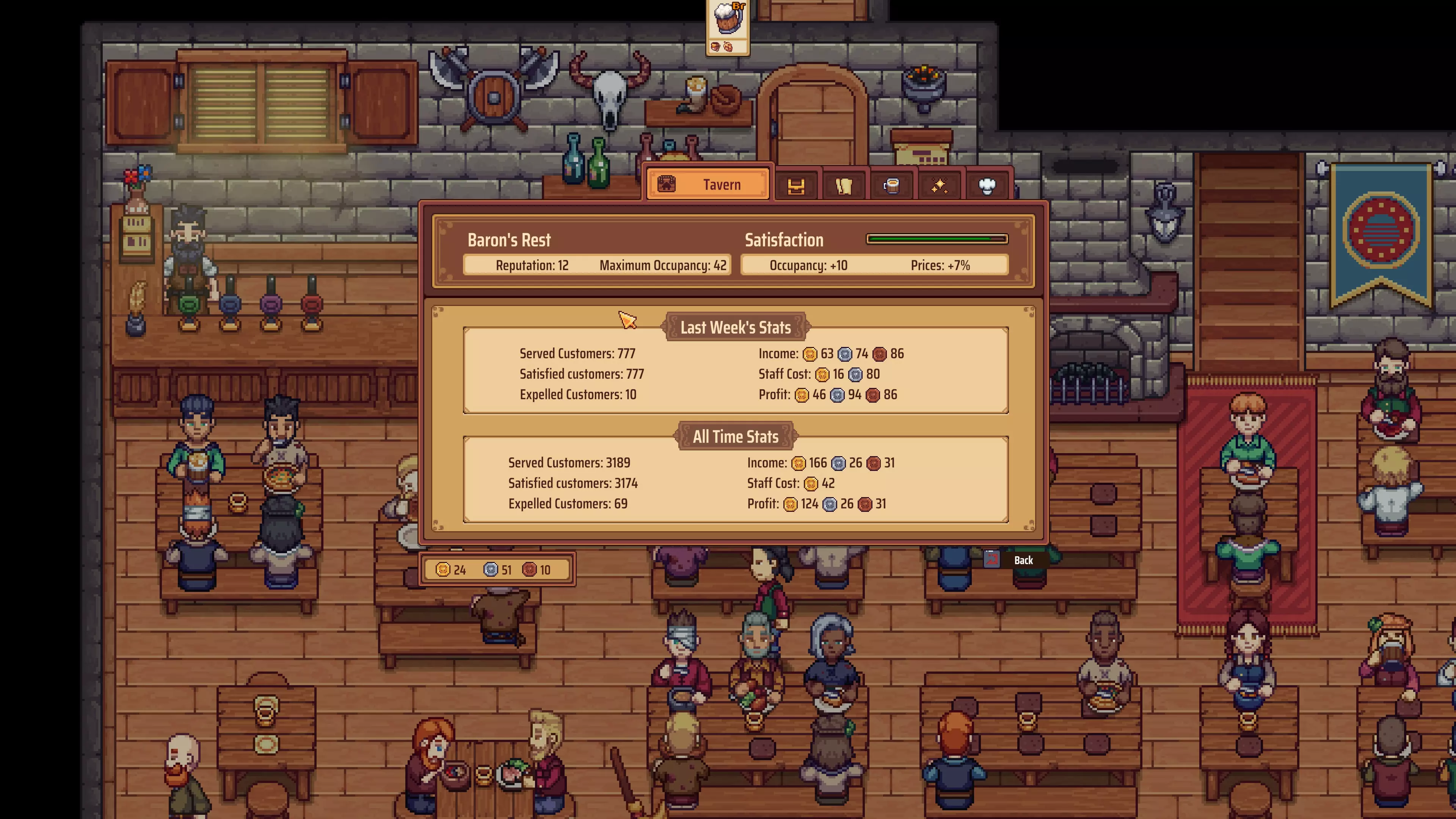 Do you have a reservation?: 在你的酒馆中同时拥有50名顾客。 这无疑是需要花费大量时间才能完成的成就。你需要提升最大顾客容量(通过将声望等级提升至至少18级,并提高顾客总体满意度),然后在建造模式中扩建空间供顾客就座,添加更多桌椅和装饰。强烈建议雇佣员工来管理人群。所以不要放弃!
