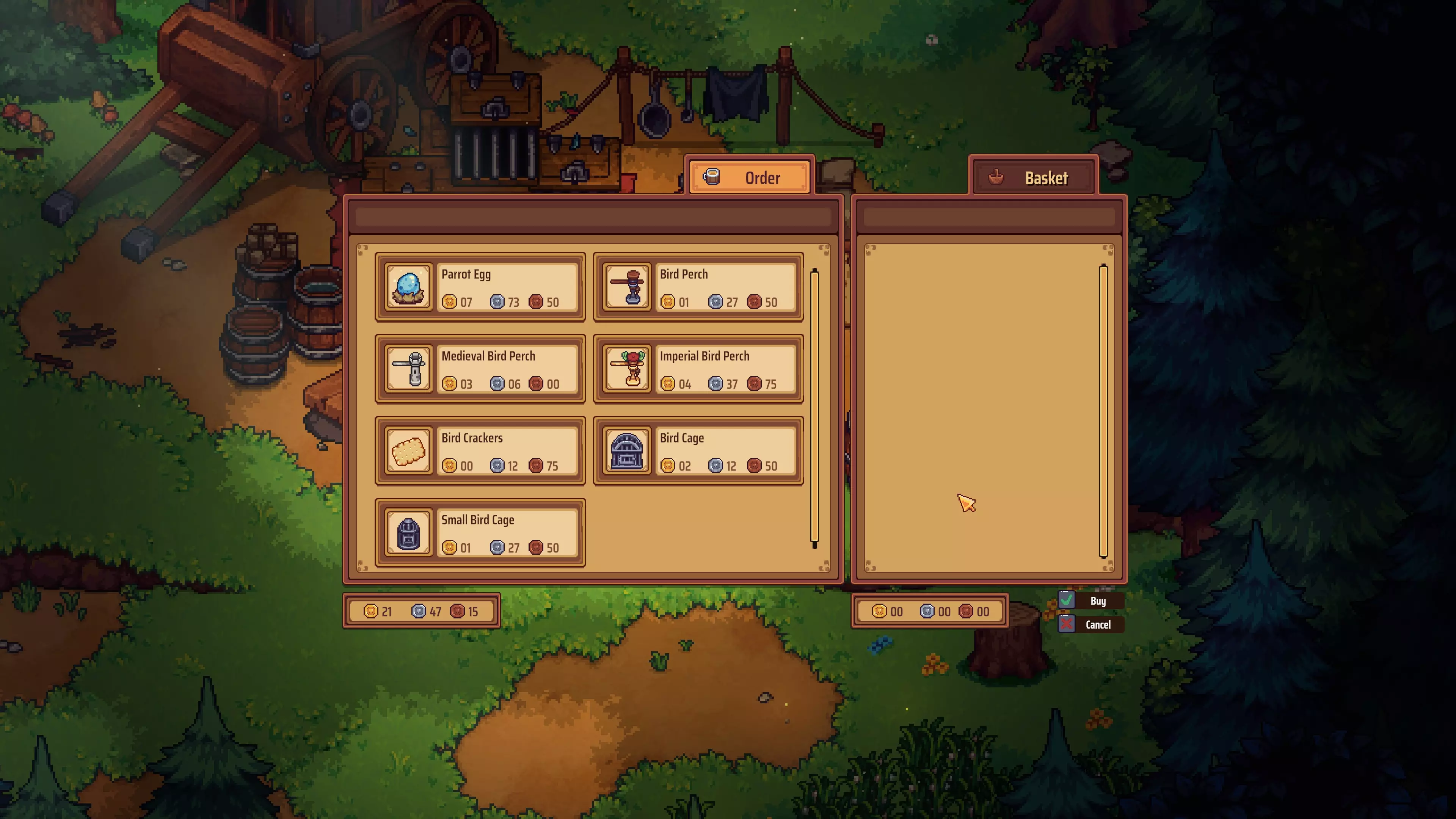 当你到达第23天并找到克劳利后,可以和他进行简短对话,之后就能进入他的商店(上方图片显示了商店库存,但价格可能与你的不同,因为玩家的经验技术投资可以降低购买价格)。在这里你需要购买三样东西:一个鹦鹉蛋(约8金币)、20份鸟食饼干(每份约15银币,不过建议多买几份,以防不小心在错误的时间喂了一两只),以及一个鸟栖木(木质栖木约2金币,中世纪栖木约4金币,皇家栖木约5金币)。这就是为什么我强烈建议你在去商店之前存15到20枚金币。 注意:最便宜的栖木就能满足需求,不过如果你买最贵的那种,看起来会更好。 你必须把这个蛋放在快捷栏物品栏里,然后正常行走和完成任务;最终,它会孵化成一只鸟(你可以给它命名,并把它放在你之前必须在酒馆里放置的鸟舍里)。
