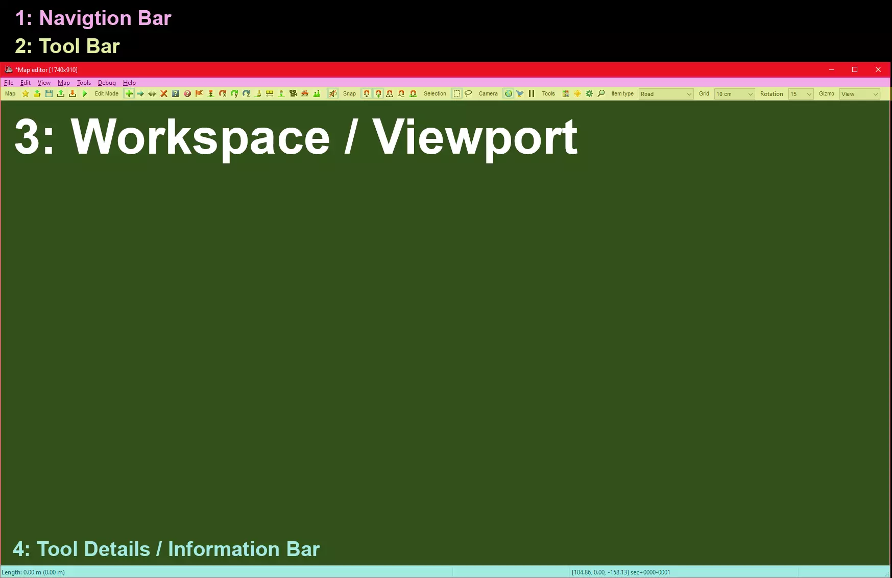 A tutorial written by someone who has no idea what they are doing in an attempt to help people with getting into mapping in American Truck Simulator. Introduction and Author's Notes At the time of writing I am running ATS version 1.46 with a VERY modded game. I do NOT have any map mods however so I'm not sure how this would effect things like Reforma, C2C, and other map mods and thus cannot help you if you are having issues with any of these. I should also mention that I have multiple monitors and I use all 3. Trying to manage documentation, the map editor, Photoshop, spotify, and other nonsense is a PAIN with just on monitor. If you can save yourself the headache use at least 2 monitors, preferably 3, otherwise be prepared to do a lot of Alt + Tab. For the purpose of being as thorough as possible, I'm going to include information in this guide that DID NOT work for me just in case they DO work for someone else. I'll try to provide links to the relevant sources when possible. With that said, a lot of the information I'll be including here can be found in other places online Things like The SCS Forums and Reddit can be useful, but seem to have pretty partial information or are straight up outdated. I will try and keep up with the guide as much as I can, but be warned I'm only writing this guide because I got fed up with scouring the internet for bits and piece of information on the map editor. In other words, this is my attempt to stitch the collective knowledge on the map editor together in an organized and comprehensive guide. Lastly, to keep things as organized as possible without cluttering up sections of the guide with links, I'll be linking to different resources like Wikipedia, using superscript numbered references. TL:DR Forgive me if the guide is messy, its hard trying to create a guide. I'll do my best to keep this as relevant and organized as possible. Quick Links and References [1] SCS Software Forum[forum.scssoft.com] [2] SCS Software Map Editor Wiki[modding.scssoft.com] Setup and The Dev Console First things first: We need to get access to the map editor. This is what most guides well tell you to do and apparently SHOULD just work. Make sure your game is NOT RUNNING. Find and Edit config.cfg. Should be located in 'Documents/American Tuck Simulator/' On line 107 and 162, Change both values of "uset g_developer" and "uset g_console"' to '1'. Save. Open your game and click tilde, "~ / ` ". Type 'edit' in the console to open the map editor. Profit?Now if your as lucky as I am, Your map editor didn't open. Don't panic yet. Try this: Close your game again. Go to your steam library and right click on American Truck Simulator. Open properties and in the 'Launch Parameters' type '-edit' Close the properties menu and run the game again. You should launch into the map editor.Now at this point, if it STILL doesn't open. You can panic. Cause I don't know how to help you. try asking for help on the SCS Forums.[forum.scssoft.com] Now the very last step. (Not sure if you can do this before hand, I'm sure you can but this is just me playing it safe.) Open you game directory, not the Documents/.American Truck Sim, but the actual game directory in your steamapps folder. and create two folders. First one is 'base', and the second folder should be called 'map'. You'll know you did it right if your file structure look something like "steamapps/common/American Truck Simulator/base/map/" FORGETTING THIS STEP WILL SCREW YOU, SO DO IT The Map Editor If you've made it here, Congrats! This is where the magic happens. This is also where my knowledge about everything gets exponentially worse. Luckily, I'm really good at using google and the internet as a whole and can send you off in the right direction. Here is a link[modding.scssoft.com] if you want to teach yourself the map editor and whatnot. You can also get to the documentation by clicking on Help > Online Documentation in the map editor itself and it'll open via the steam overlay. For a super basic quick start guide you can check this website out too.[scsmoddingguide.github.io] I'm not sure how updated any of the information is here though so if you choose to follow that guide, you are on your own. I WOULD recommend giving it a look still as I am using it to help me learn the map editor for the firs time. Navigation and TerminologyAlright... this is the part where I tell you you're kinda on your own... sorta. I can't make a map for you obviously. But I can explain what certain tools do, and how to use them. So lets get some terminology down. (I'm going to use the correct names for things when I can, but for other things, I'll call them what I wanna call them.) 1: Navigation Bar Used to change views, manage files, debug stuff, change options, stuff like that. 2: Tool Bar This is the "meat" of the map editor, its how you add things to the map, delete them, use placement tools, and change the properties of things displayed on the workspace / viewport. 3: Workspace / Viewport it lets you... view things. Its where you click to place stuff, select things you've placed, and gives you a visual representation of your map. 4: Tool Details / Information Bar. Contextual information. It changes based on what tool you have active or what you have selected.
