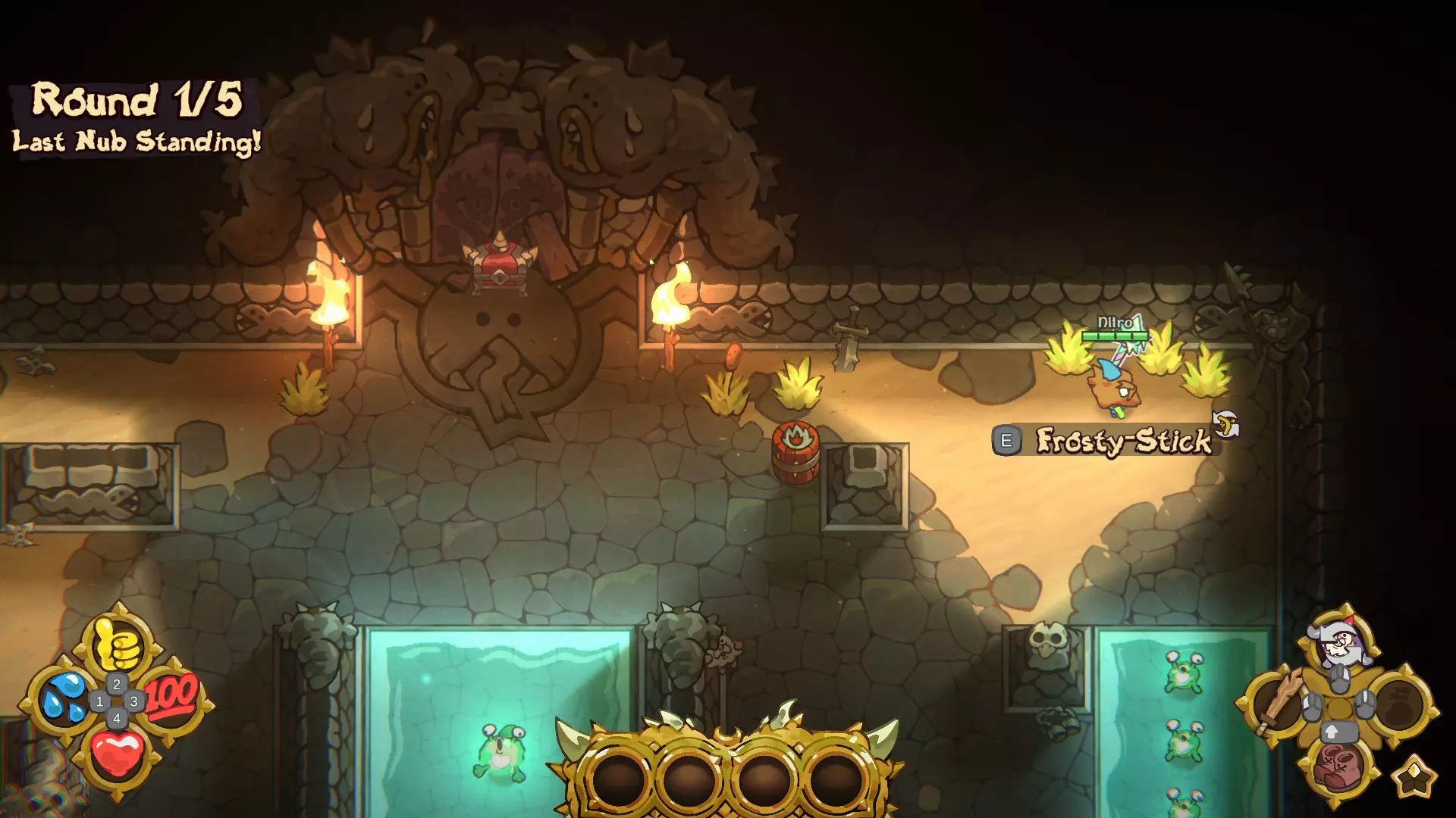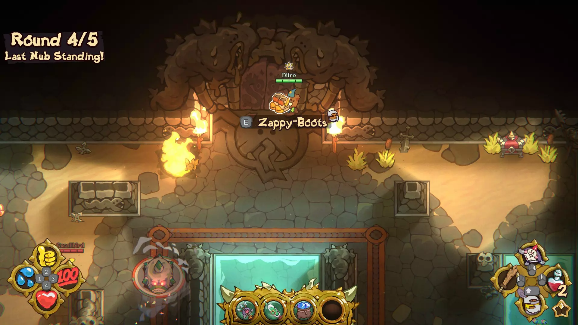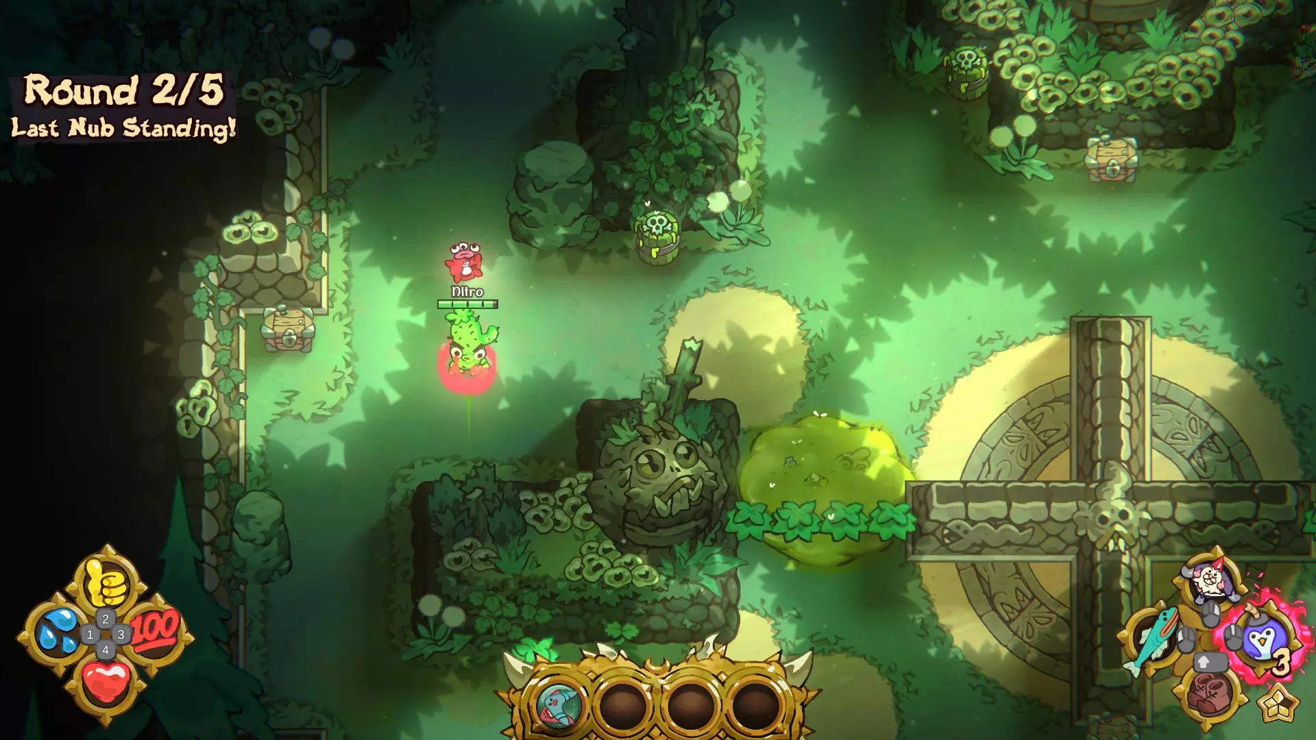 被动技能在每回合结束时解锁,你可以从3个技能中选择1个。如果不进行选择,系统将自动为你挑选1个。你最多可获得4个被动技能。每位玩家可选择的技能各不相同,因此你可能会看到其他玩家拥有你未曾见过的技能。 剑类技能: 【大姐的穿刺利器】:每回合开始时,装备一把随机的剑。 【恶心挥砍】:你的所有近战攻击都会使目标中毒。 远程技能: 【砰砰的步行法杖】:每回合开始时,装备一把随机的法杖。 【老爹的投掷痛击】:每回合开始时,装备一把随机的投掷武器。 【老妈的射击利器】:每回合开始时,装备一把随机的弓。 【多重射击】:你的弓会额外射出两个小矮人。 【双重投掷】:你可以额外投掷一个回旋镖。恶心尖刺 你的所有非魔法远程攻击都会施加中毒效果。 移动能力: 疾跑之足 增加25%额外移动速度 奶奶的迅捷靴 每回合开始时,装备电击靴。 滑雪轰鸣 使用移动能力时,有几率掉落一枚爆炸炸弹。 怒跑 生命值越低,移动速度越高。 生命能力: 腹部坚韧 初始额外获得50点生命值。 冰冻治愈 冰冻状态下,你的 healing 速度极快。 冰冻回溯 首次即将死亡时,生命值会重置为50点并进入冰冻状态(从星星处复活后重置)。 小啜一口 击杀玩家后,你会恢复至满血,但会中毒。 喘息治愈 在数秒内未受到伤害后,开始恢复生命值。快乐猛击 你造成的近战伤害的50%将转化为生命值。 胸部技能: 宝箱探测器 灌木丛有几率生成宝箱。 额外奖励 每收集一组奖励,你将获得1次额外充能。 额外礼物 你打开的每个宝箱都包含额外战利品。 物品技能: 不再弱小 你可以将物体扔得更远。 小弟的砰砰炸弹 每回合开始时,装备一整组砰砰炸弹。 防御技能: 全面格挡 你受到的伤害减少20%。 炸弹格挡 你受到的爆炸伤害减少50%。 闪光格挡 你受到的魔法伤害减少50%。 砰砰格挡 你受到的非魔法远程伤害减少50%。