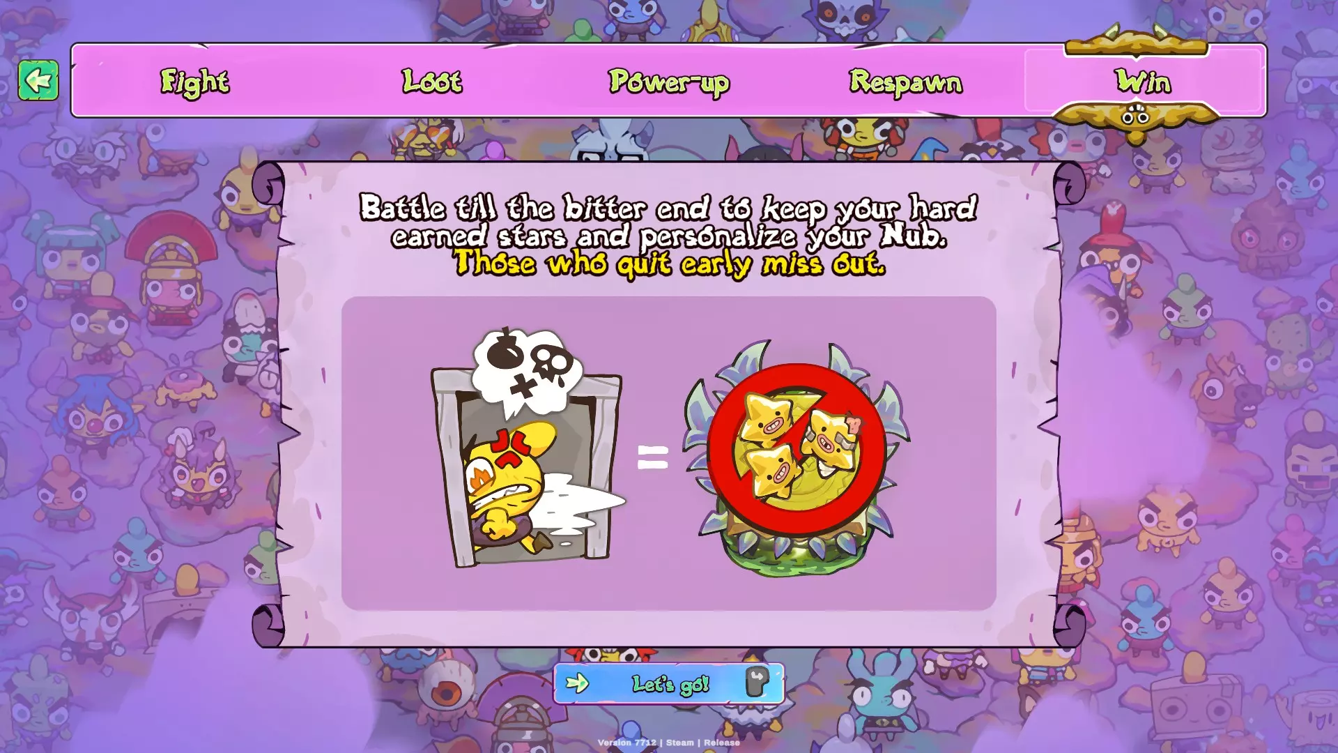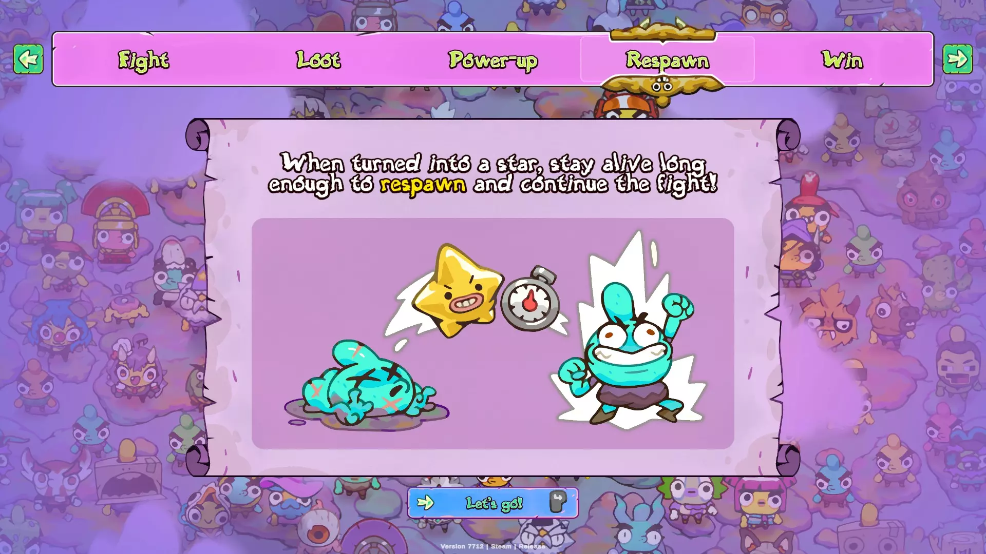 游戏目标是获取尽可能多的星星以获得第一名。 获取星星的方式只有两种: 1. 夺取被击败敌人掉落的星星。该星星会四处移动,若行动不够迅速它便会逃脱,并最终以一半生命值复活。 2. 收集小型星星碎片。集齐5个碎片即可合成1颗星星。这些碎片可从地图上的特定位置获取(并非所有地图的固定刷新点都有),也可从宝箱和灌木丛中获得。此外,还有一种被动技能能让你从宝箱中获取碎片。需要注意的是,回合结束时未集齐的碎片不会保留到下一轮,因此必须在同一回合内集齐5个碎片,否则碎片数量将重置为0。 生命值