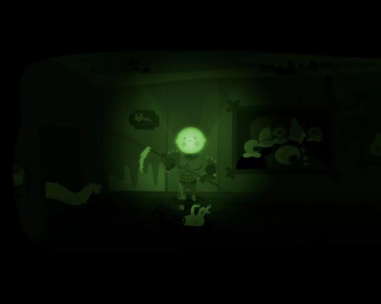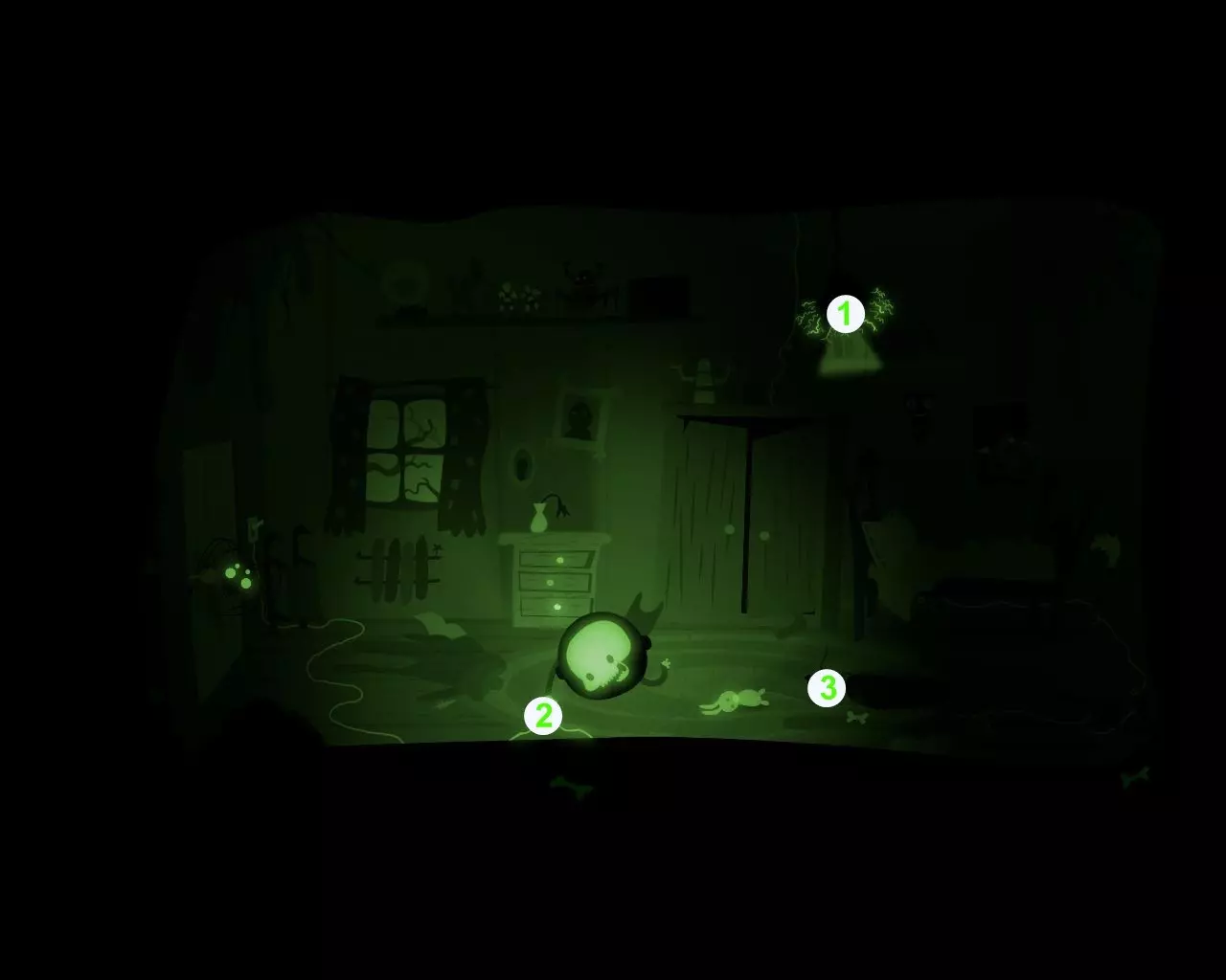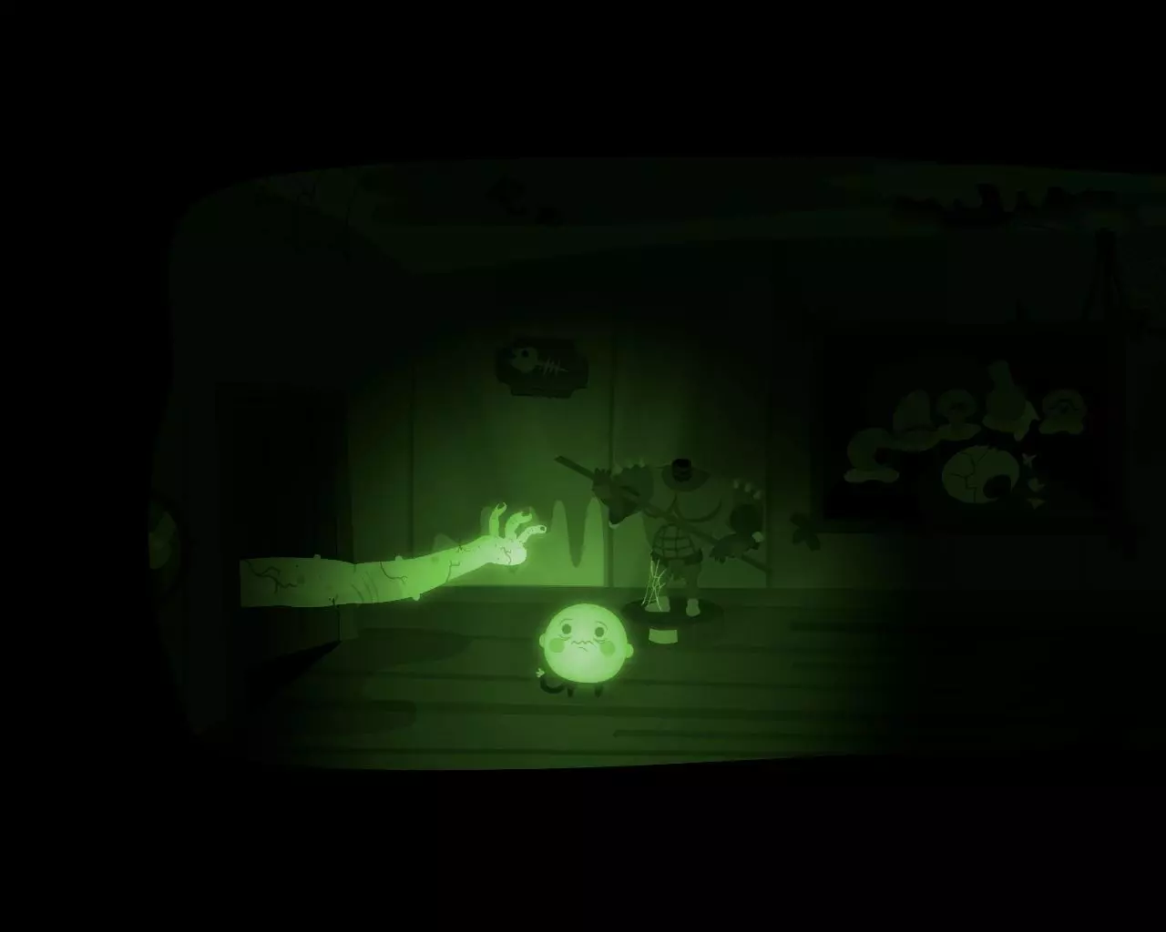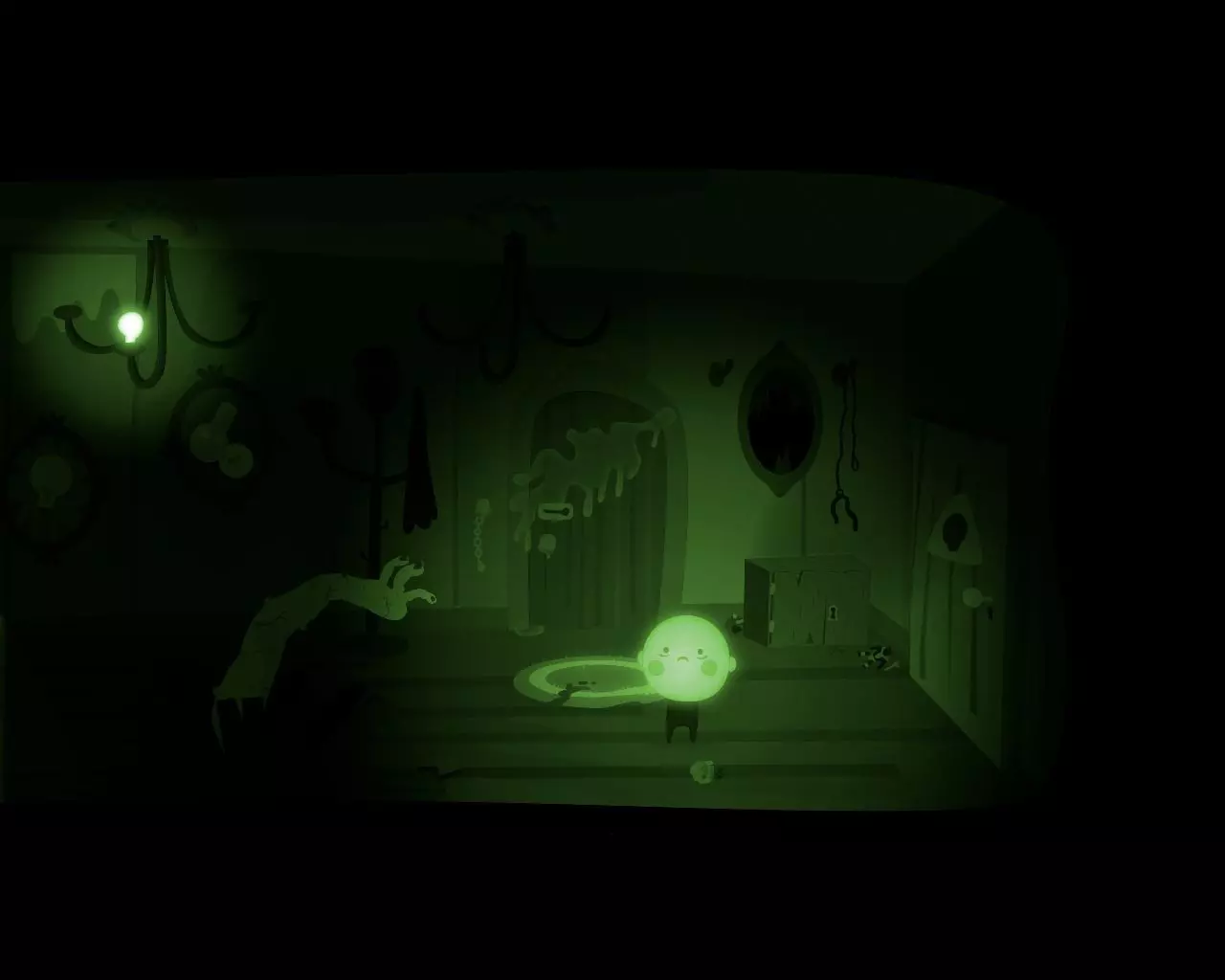 一条不知从何而来的巨大手臂挡住了穿过走廊的路。 点击天花板上的吊灯。 男孩的脑袋(灯泡)会与身体分离并挂在吊灯上。 抓住吊灯向左移动。