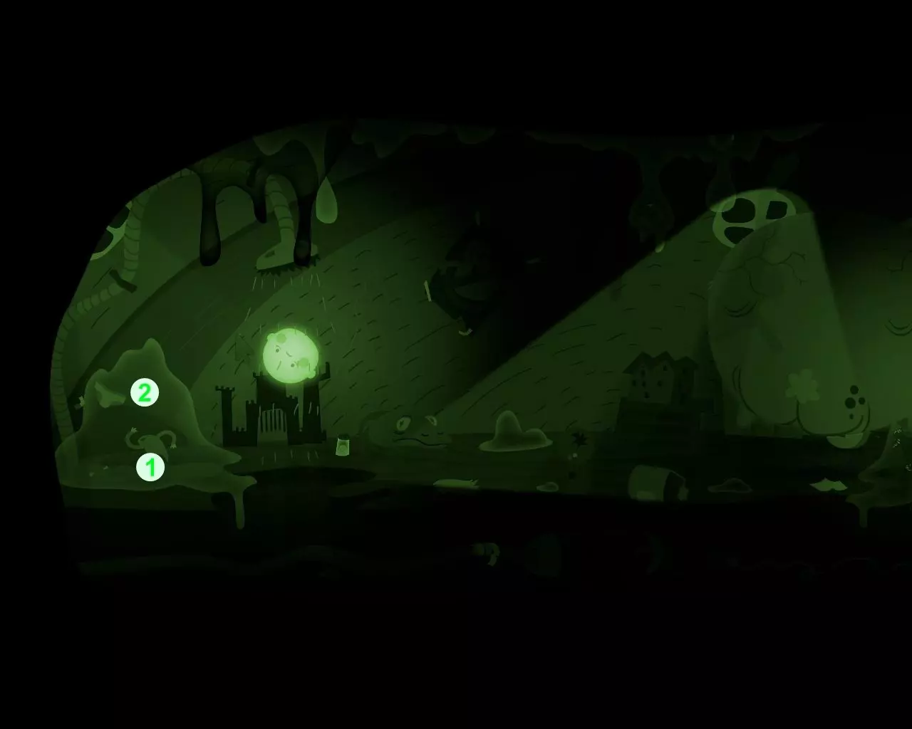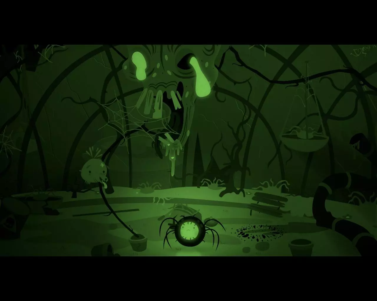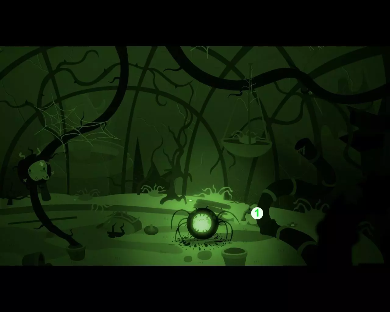 等待蜘蛛出现在悬挂的杯子下方,杯子里有男孩。向下跳,进入蜘蛛体内。获取【克兰尼克1】。 现在男孩拥有蜘蛛的所有技能,可以垂直移动了。 沿着蛛丝向上爬,唤醒会吐出毒液的巨大头骨。