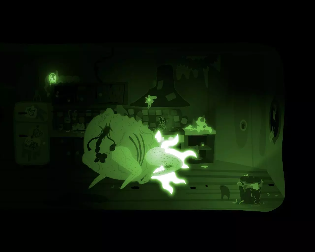 药片掉进酸液中并溶解。怪物开始感到剧烈的烧心。