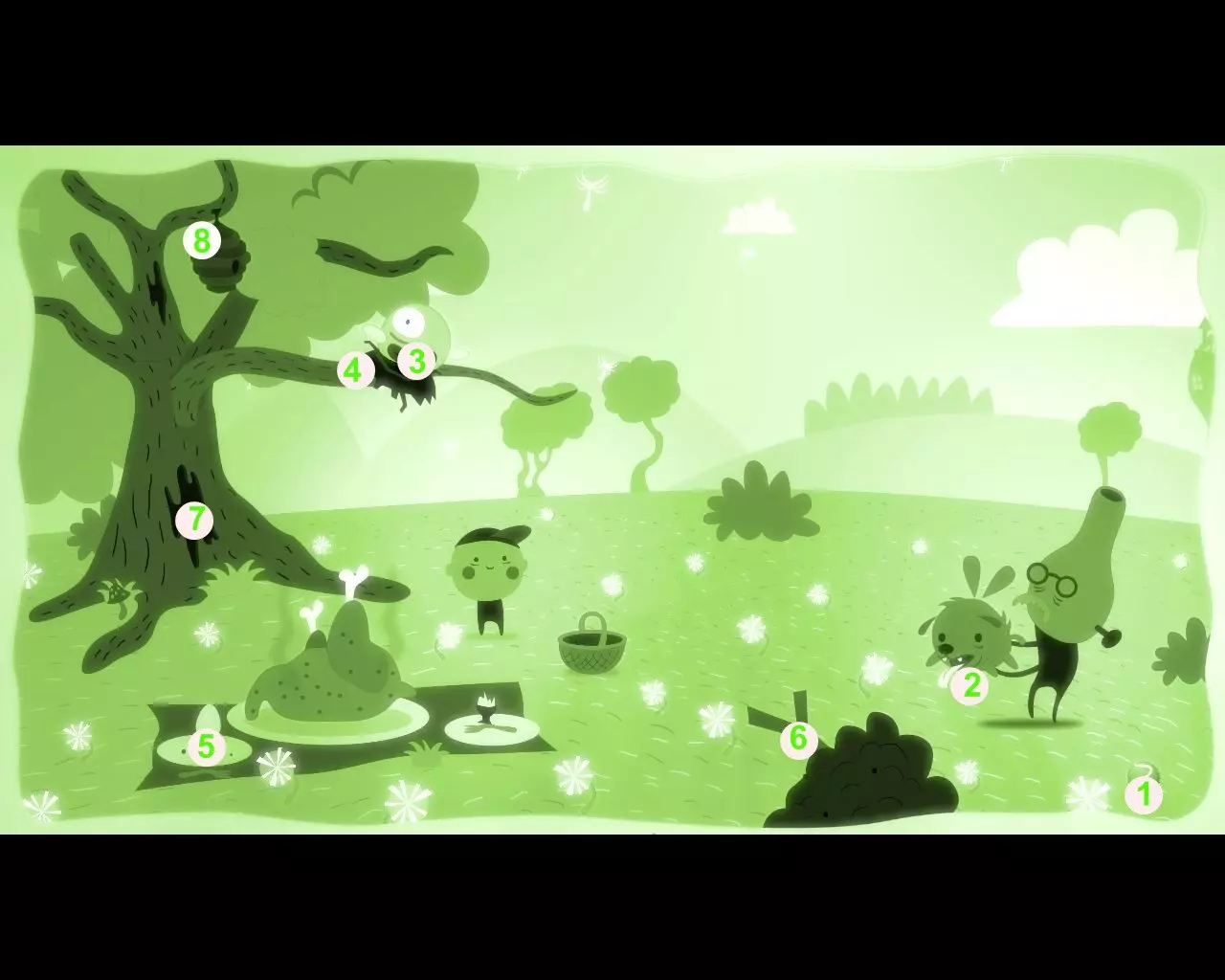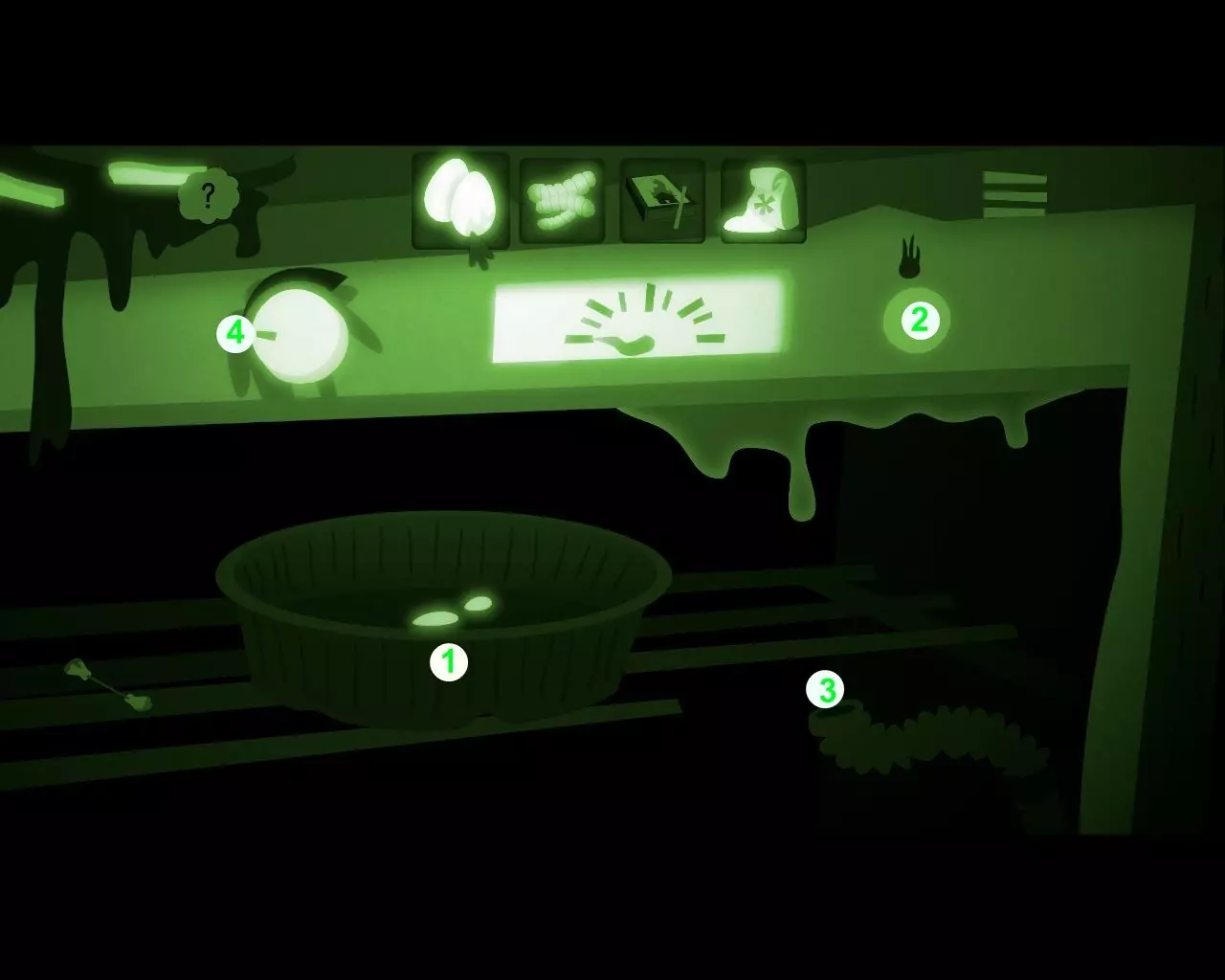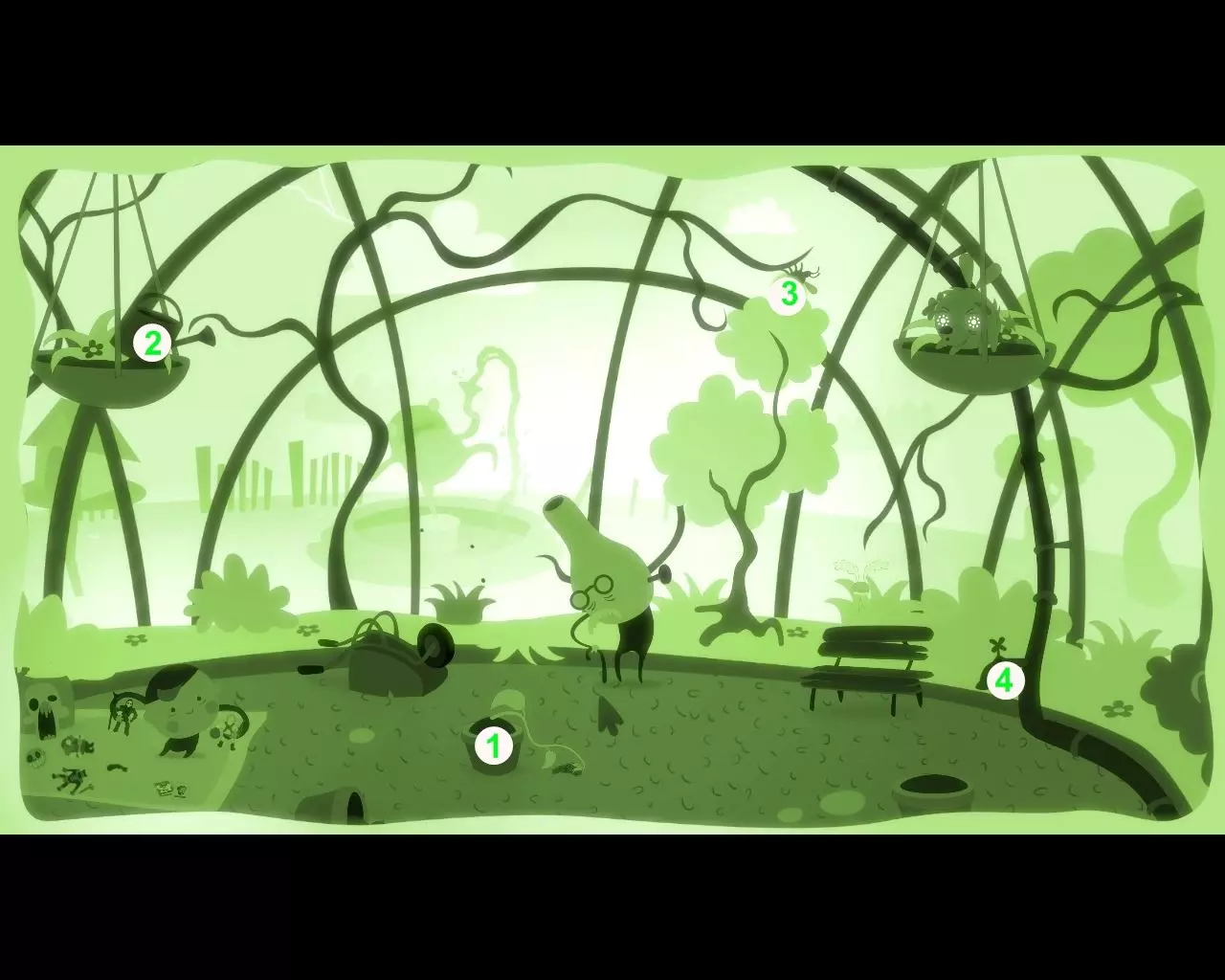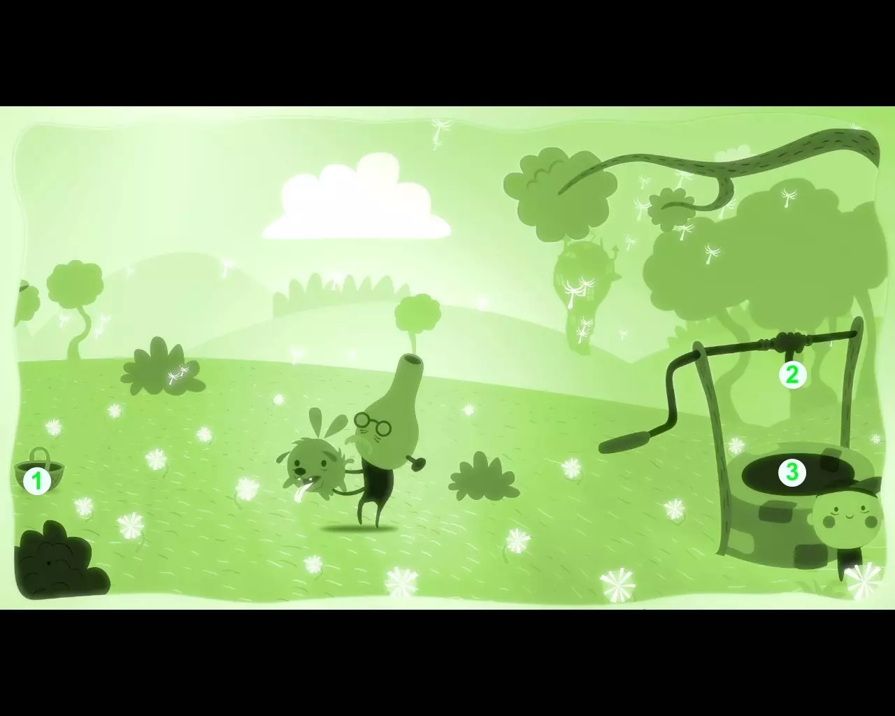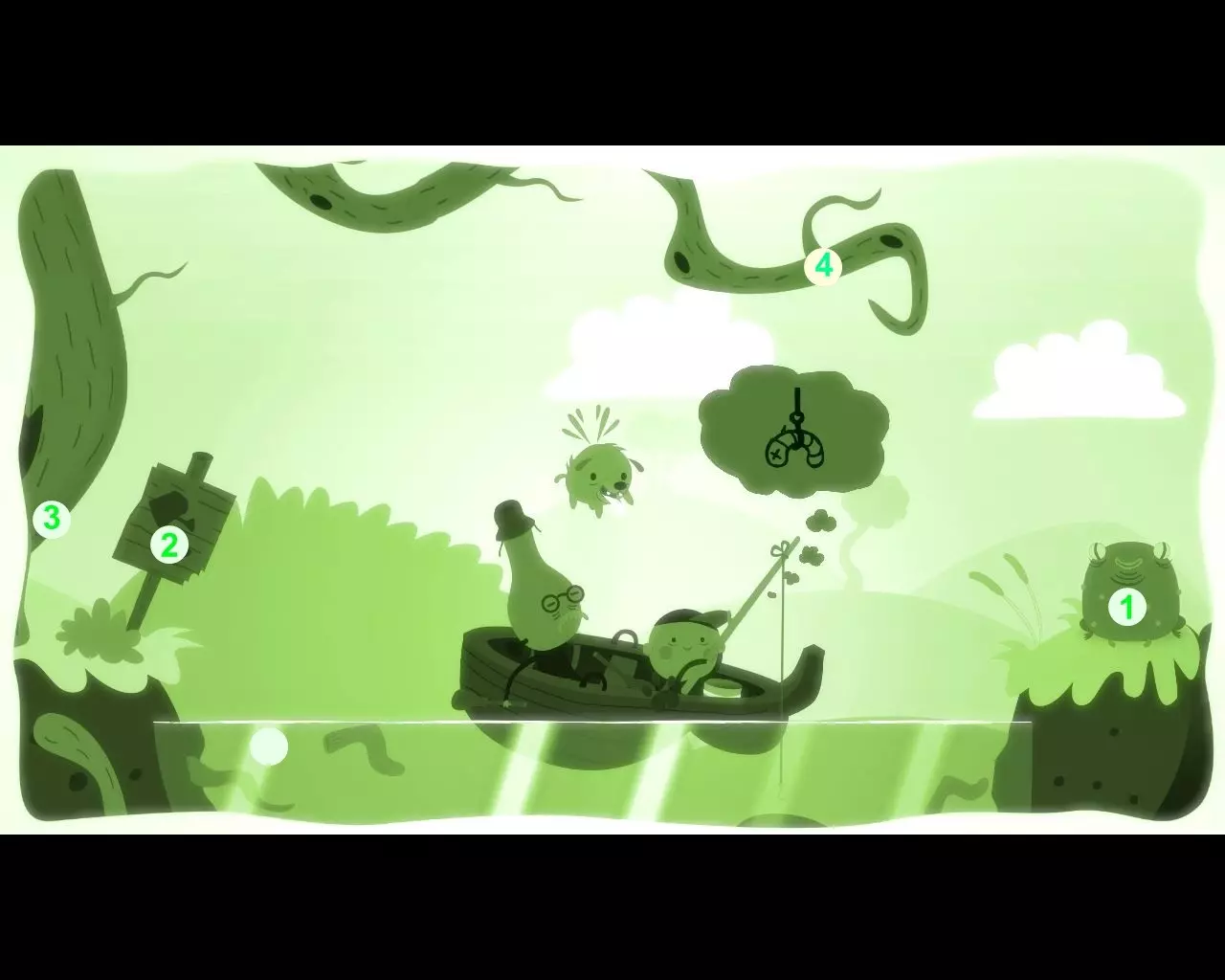 要正常钓鱼,当然需要用蚯蚓当诱饵。 操控飞行的狗。 青蛙1无法钻进地下,而地下有美味的蚯蚓。 注意海报2,上面写着给树浇水会让果实生长。点击树上的树洞3。 狗“浇水”后,树枝4上方出现了一个飞行的果实。 把果实“赶”向青蛙。 青蛙吃掉果实后变胖了。我们从湖里取水,“浇灌”树木,把成熟的果实推向青蛙。重复这些动作,直到膨胀的青蛙飞向天空。下到地下,把蚯蚓甩到鱼钩上。