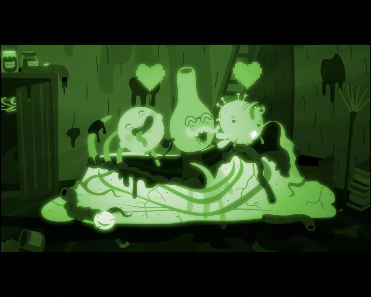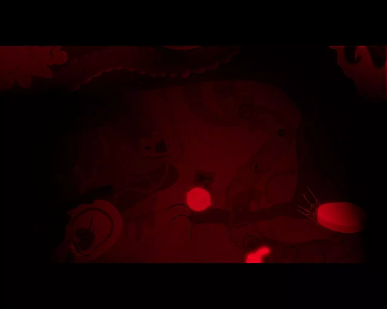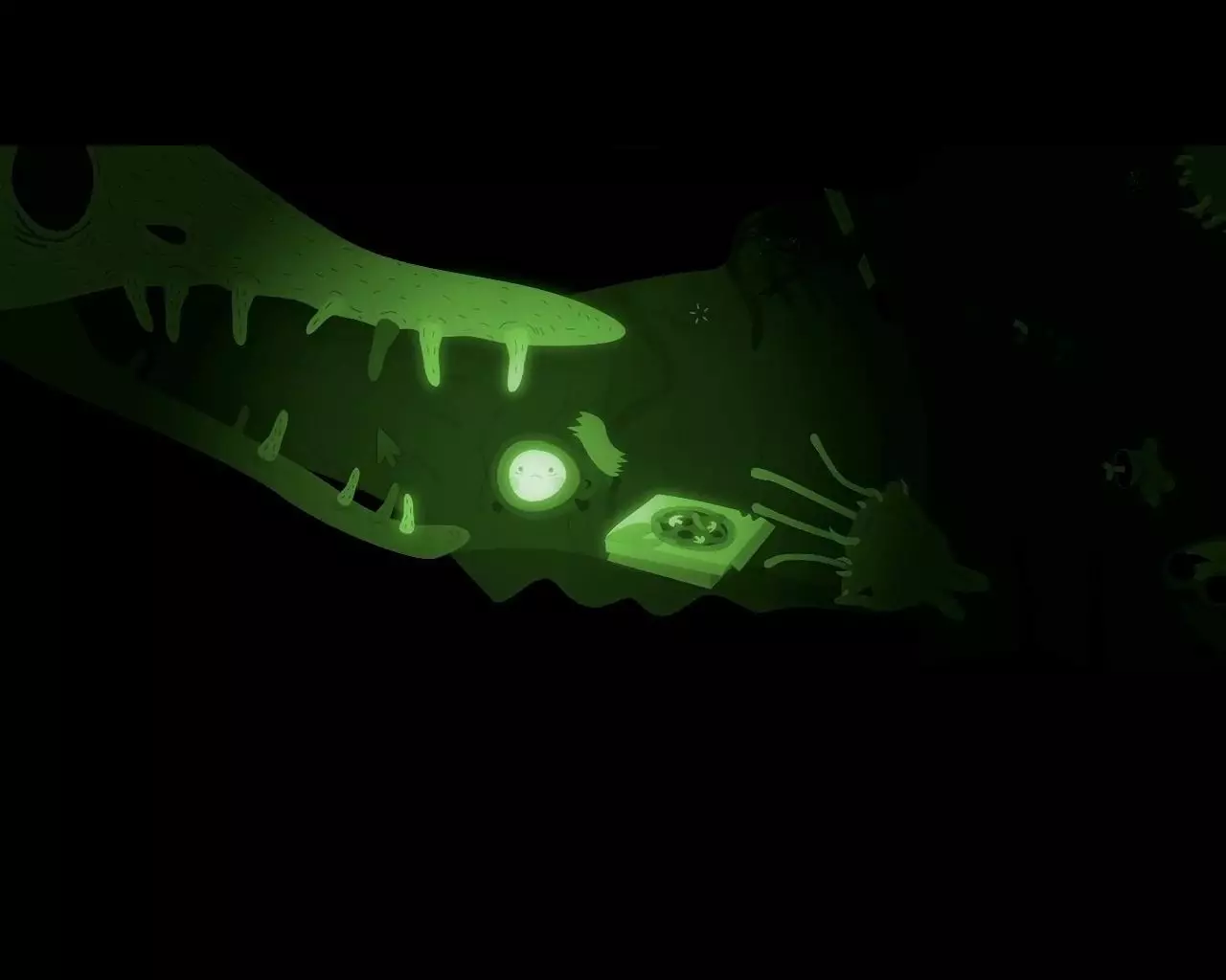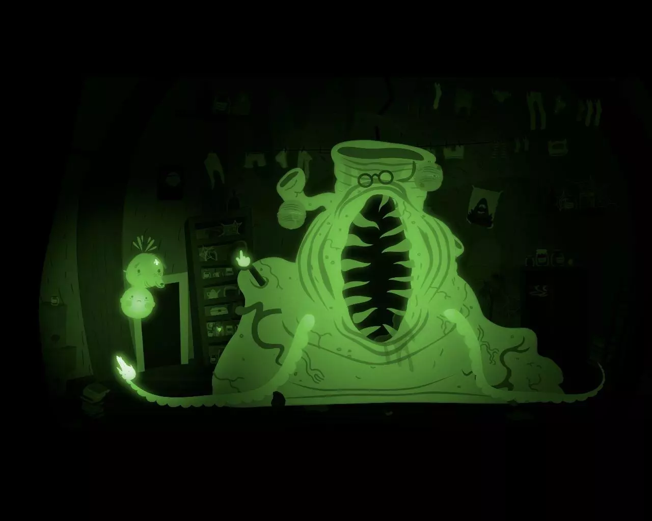 将男孩放在滴落的液体下方,让液体覆盖他。然后向左移动,飞行微生物群不会对被液体覆盖的男孩做出反应。点击左侧肠道的下方开口。再次回到房间。现在怪物试图将男孩和狗吸入体内。