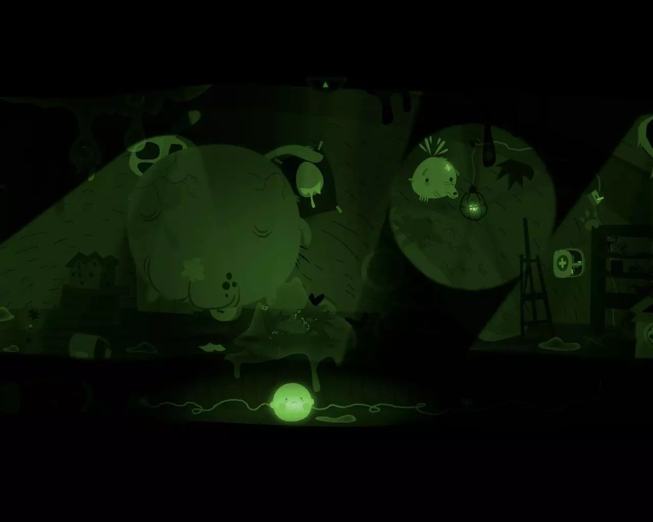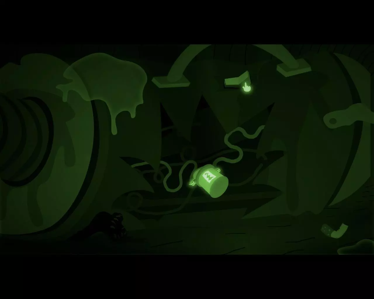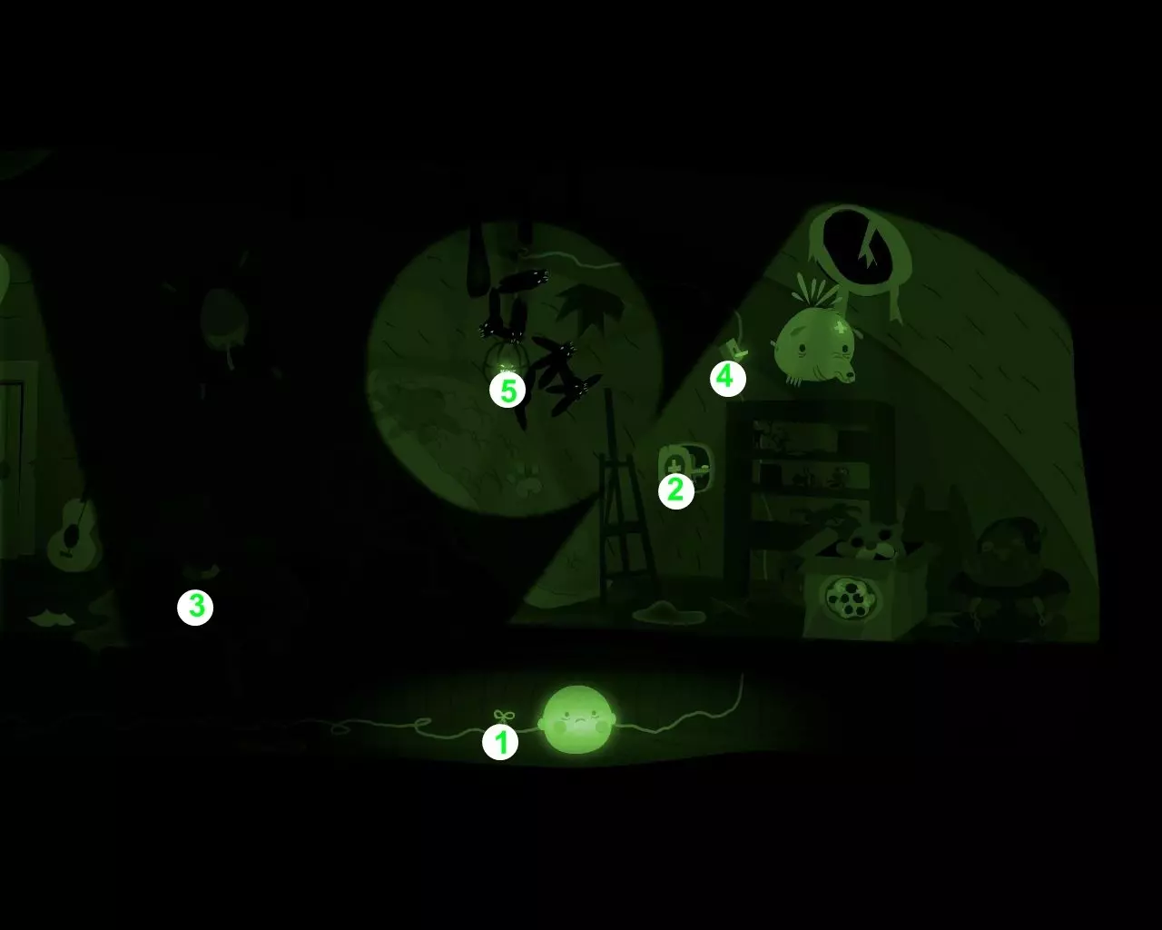 1. 用男孩的头连接断线处。 2. 让狗打开急救箱,取出创可贴。创可贴粘到狗爪上,狗一挥爪将其甩进唾液堆里。 3. 用开关打开灯。 4. 对着蝙蝠吠叫,让它们飞向灯泡。 5. 控制男孩向左移动,停在唾液堆下方,捡起创可贴。