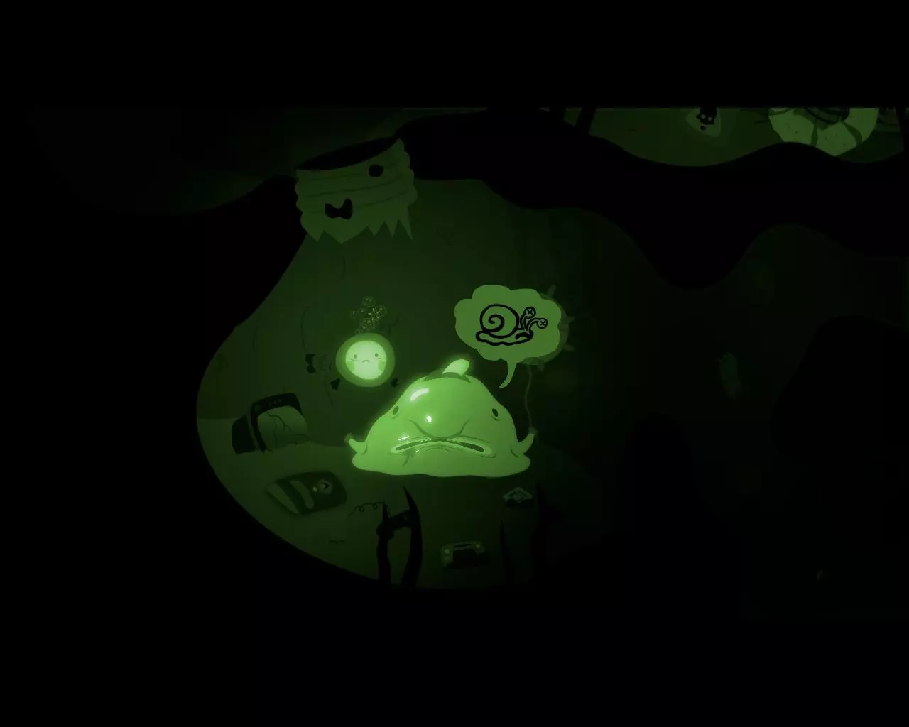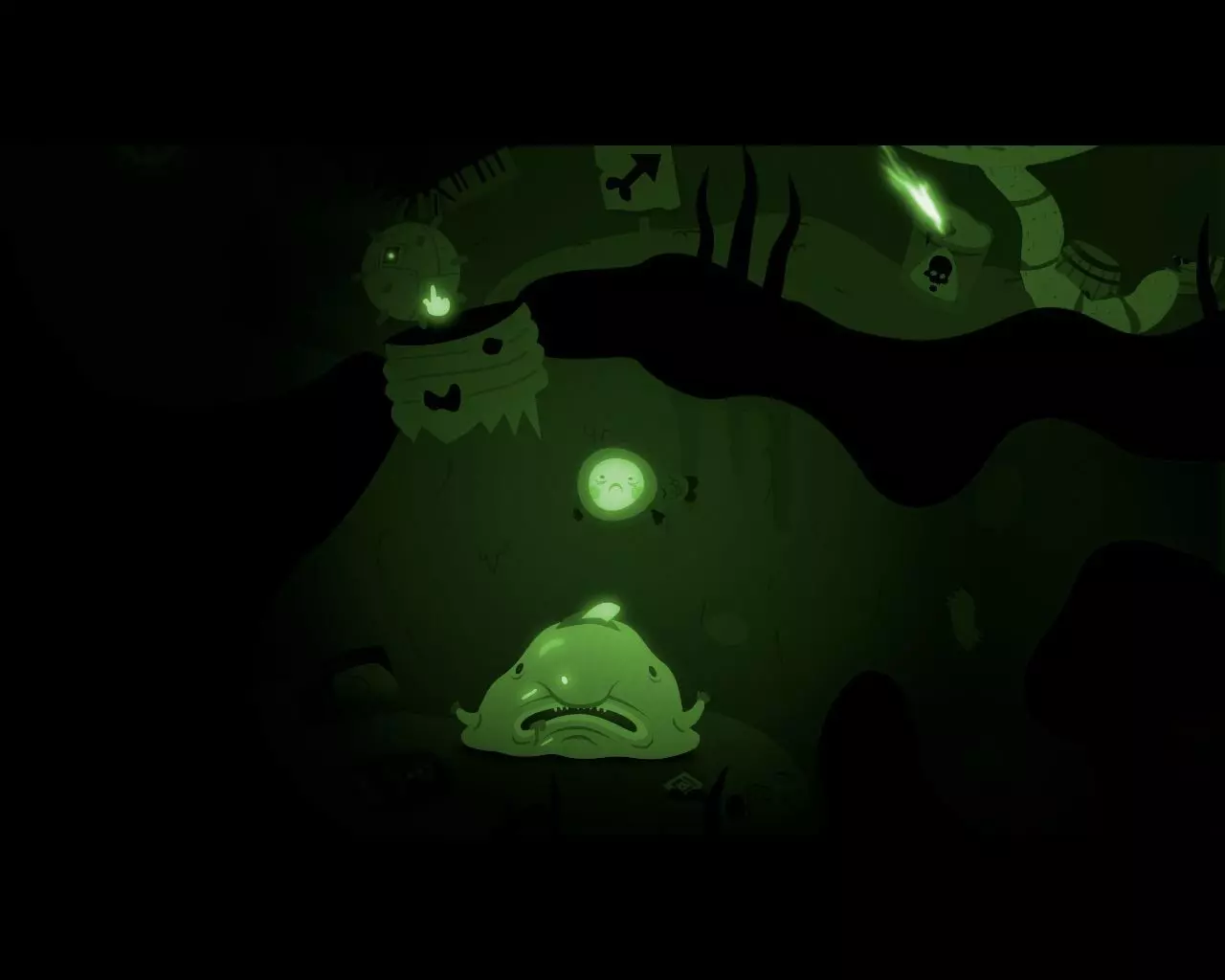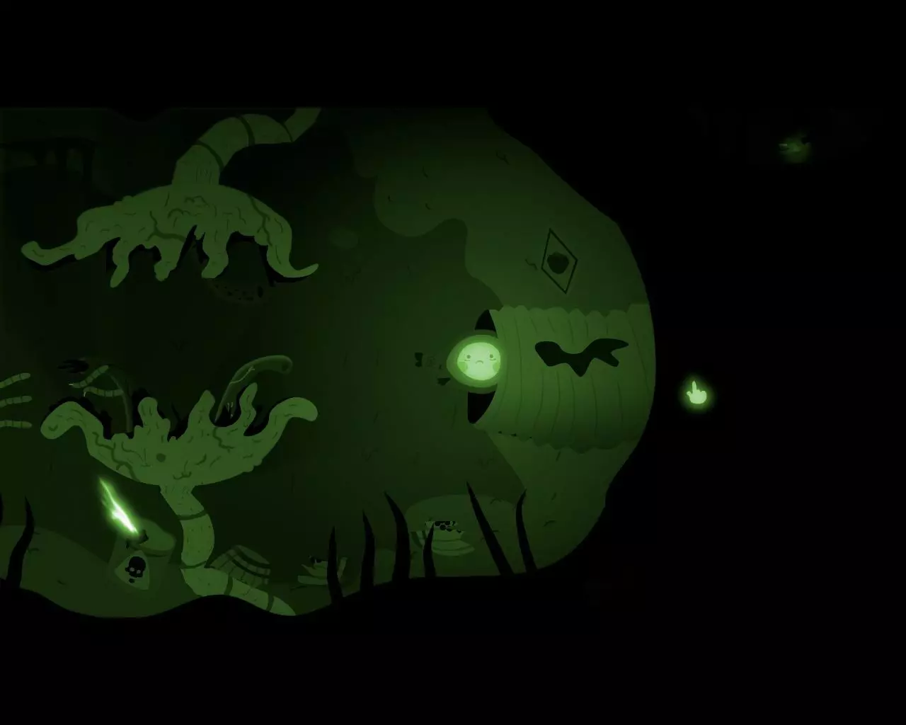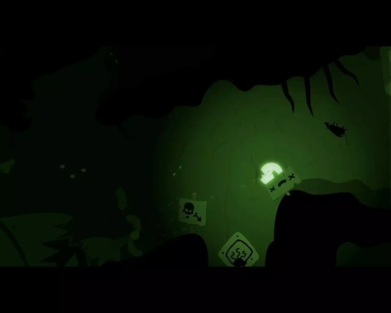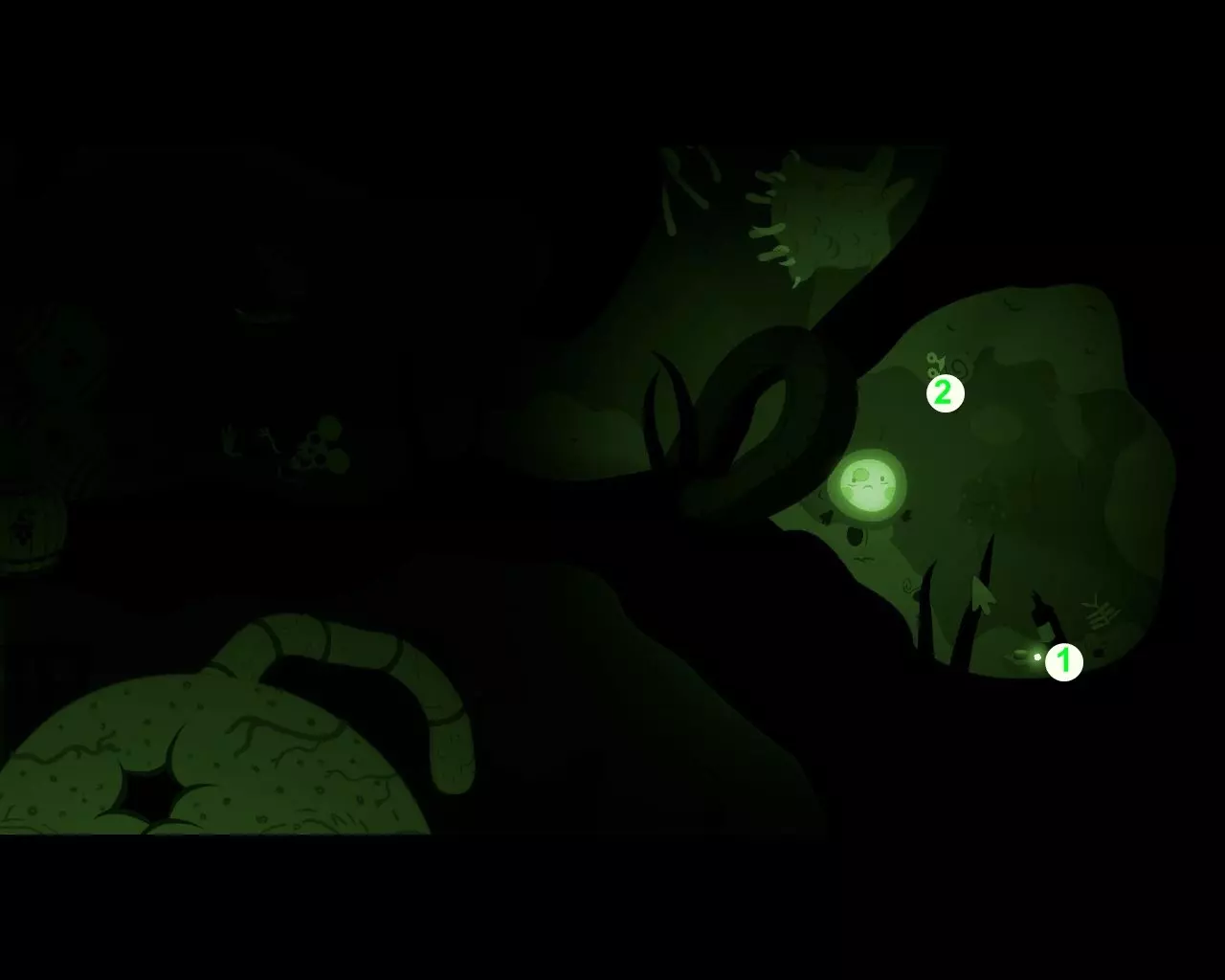 虫群随着男孩的出现而消失,眼前立刻浮现出怪物的躯干。我们从下方的洞口潜入一个房间,那里有一个友善的生物用绳子吊着一枚浮动的地雷。