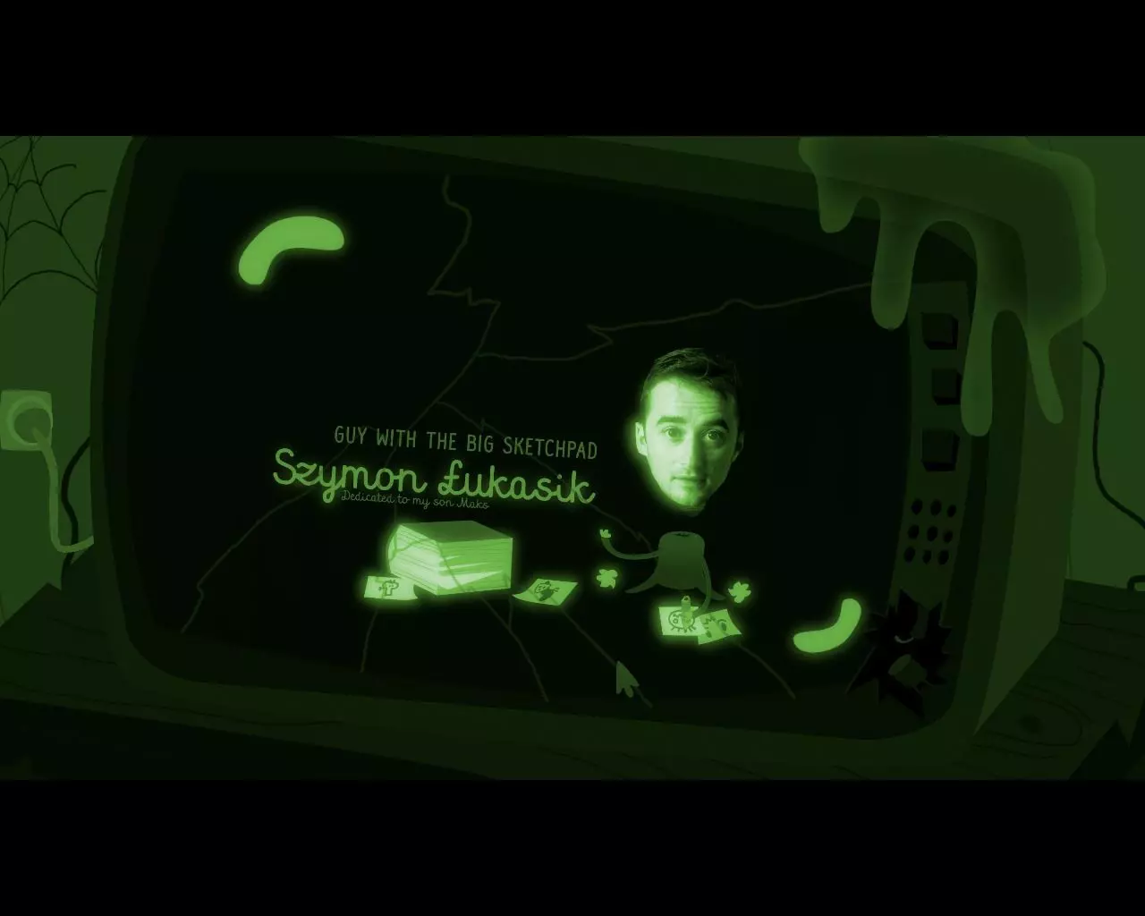 序章 爷爷的房间 顶着灯泡脑袋的男孩正在听爷爷讲述他年轻时的故事——那时他把龙剁成香肠(信息以图片形式呈现)。讲得累了,爷爷张着嘴在沙发上睡着了。男孩也打了个哈欠,打算去睡觉(出现床的图标)。 将光标移到门上,当光标变成手的形状时,点击鼠标左键。
