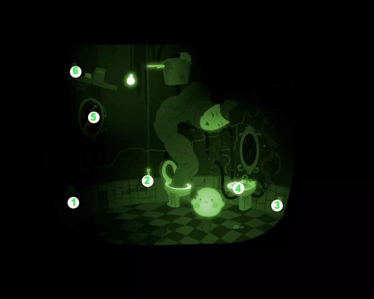 1. 按下空气清新器按钮1。怪物会暂时静止。 2. 拉动冲洗桶的链条2。将光标对准怪物并快速点击鼠标左键,以阻止它咆哮。怪物的身体会布满裂痕。 3. 按下洗手池4右侧的按钮3,启动风扇5。站到风扇5下方。 4. 怪物会转向墙壁,其面部会碎裂。 5. 点击架子上的管道6。快速点击按钮以停止怪物的咆哮。重复上述操作,直到怪物的咆哮使其瘫倒在地。拾取【喇叭】,点击洗手池4次。