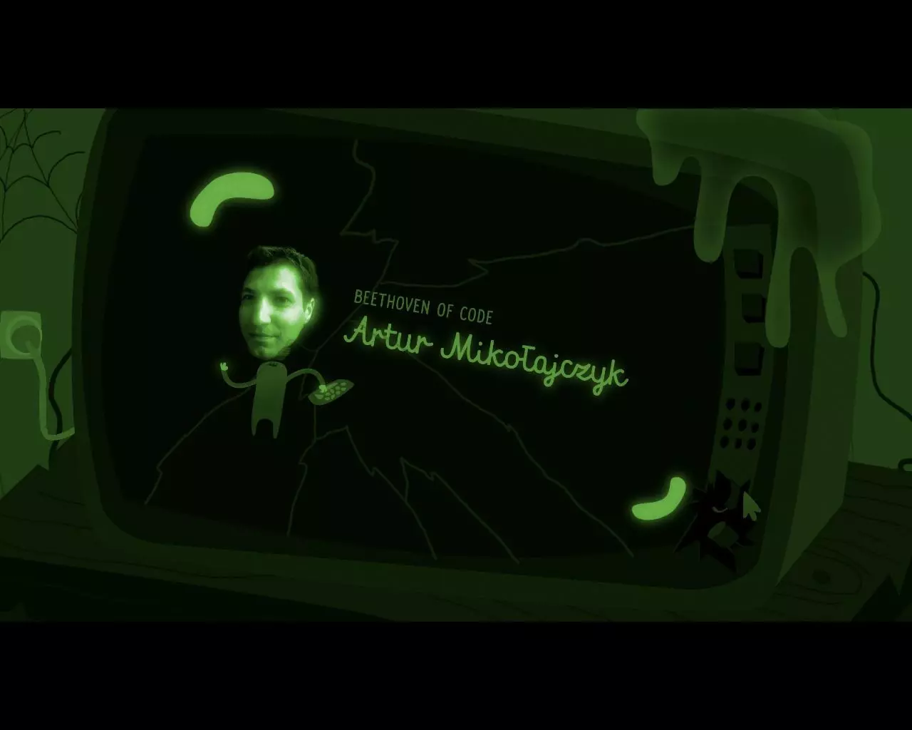 把地雷推上去。吸引一群新的蠕虫跟着自己,游过一排排植物以摆脱节肢动物。游进有酒桶的隔间,把其中一个桶撞下去。 怪物喝下酒,开始用它自己的语言大声唱歌。 游到怪物身边,把地雷推向它。 地雷固定在怪物的额头上。 游到有控制台的角落,按下按钮,怪物被制服。我们下去,解决掉另一群虫子。