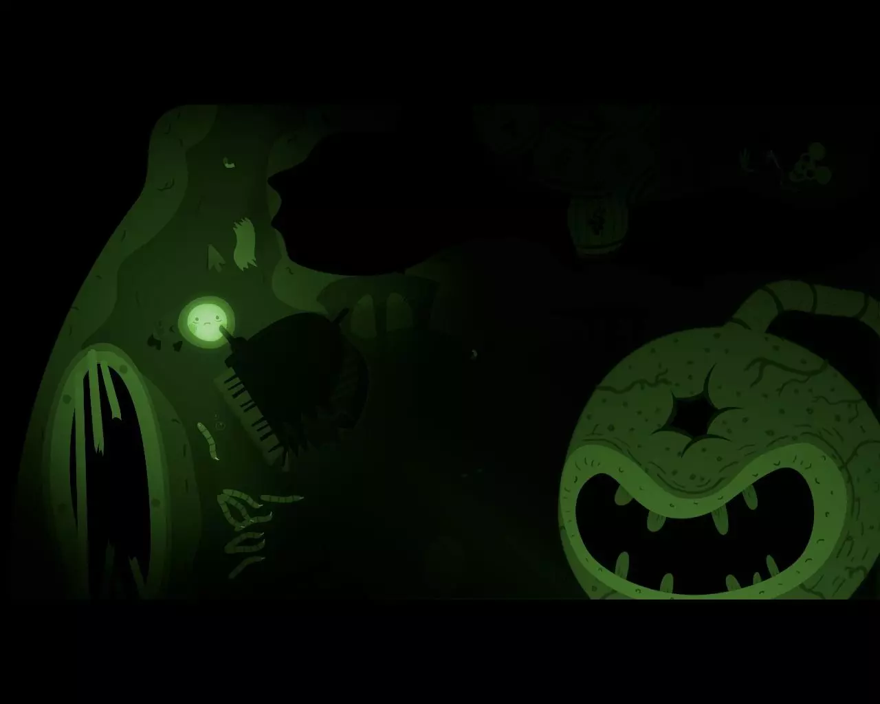 追逐男孩的蠕虫成为了食肉植物的猎物。我们向下走,注意到【骷髅】危险标志。