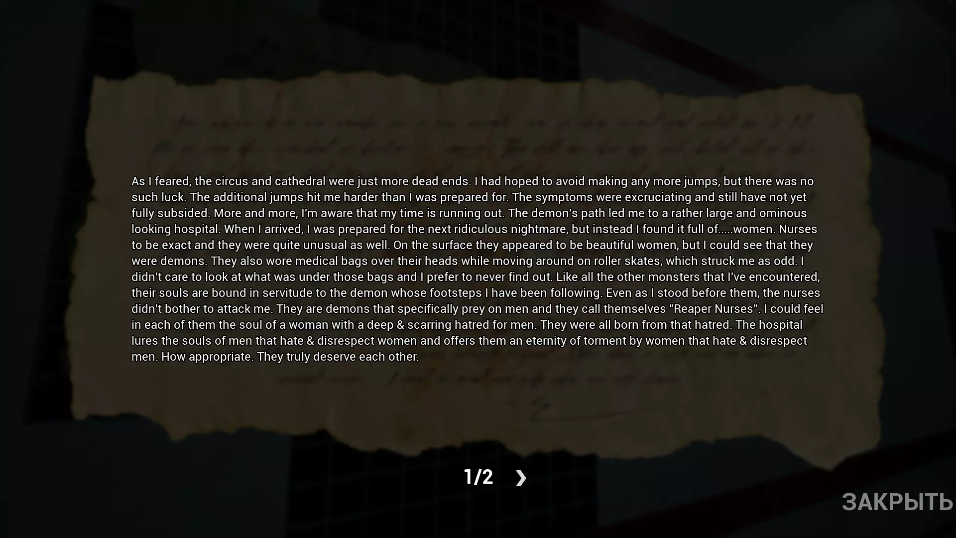 《折磨疗法》 在关卡末尾,当你面前出现3名护士时,不要走向她们,向左走,房间里会有一张纸条。