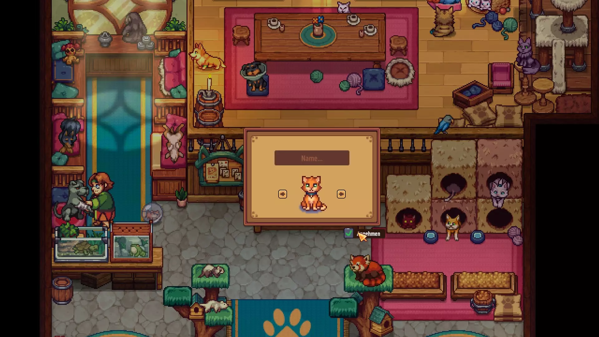 内西会向你表示感谢,并询问你是否愿意照顾一只猫。你可以从几种不同的样式中进行选择,甚至可以现在或之后再次更改她的名字。