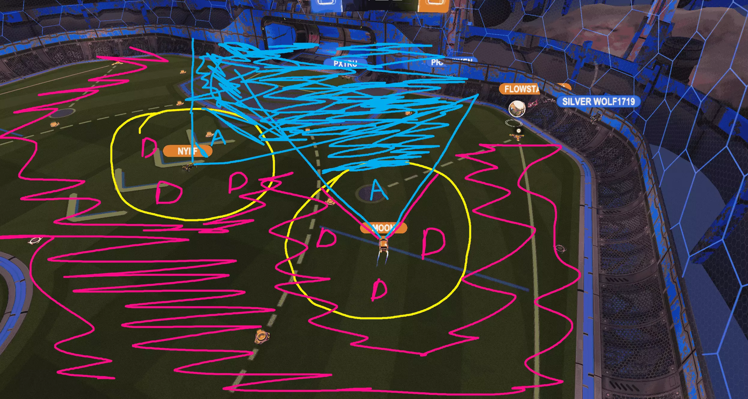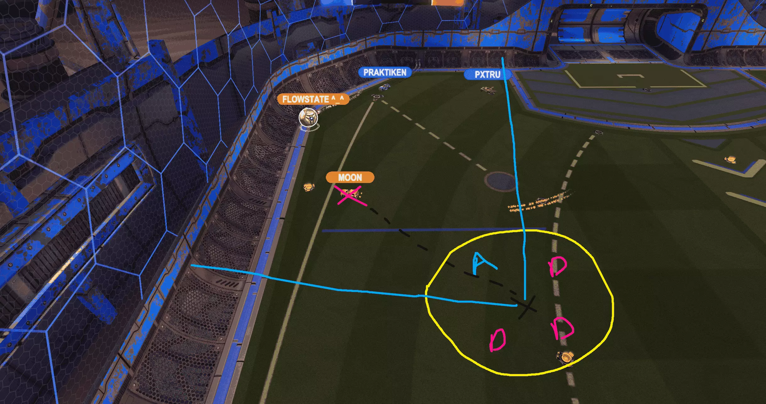Adequate Sleep: Ensure you get enough quality sleep for cognitive function and emotional well-being. Stick to a consistent sleep schedule. Stop the 3am weekended grinds and start going to bed and waking up at the same time. Stress Management: Learn stress-reduction techniques such as deep breathing and progressive muscle relaxation. Break tasks into smaller steps to manage overwhelming situations. 7 games on 15 min break. Take a break!! Stretch your hands drink some water! Continuous Learning: Stimulate your brain with new challenges and activities. (Limit Testing) Read guides, watch videos, or engage in hobbies that expand your knowledge on competitive gaming. Time Management: Prioritize tasks and focus on high-priority activities first. Use tools like calendars and planners to organize and plan your day. Social Connections: Cultivate positive relationships for emotional support. (X or Discord) Share experiences and challenges with friends or family. Visualization Techniques: Use mental imagery to visualize success and positive outcomes. Picture yourself overcoming challenges and achieving your goals. Brain-Boosting Activities: Solve puzzles, play strategy games, or engage in activities that challenge your cognitive abilities. Note - Playing chess boosted my MMR by 50-75. Positive Environment: Surround yourself with positive influences and a supportive environment. (Discord Servers) Minimize exposure to negativity and toxic situations. Seek Professional Support: If needed, consider seeking the guidance of a mental health professional for coping strategies and support. Reflect and Learn: Regularly reflect on your experiences and learn from both successes and setbacks. (Journal) Adjust your strategies based on what works best for you. 1v1 Isolations 1v1 Isolation Isolating the "First" challenge in 1v1, 2v2, and 3v3 is essential to gaining advantage. When you take ball possession the first thing you should do is isolate your first initial challenge. Don't locate the goal or anything else just the pressure. Step 2 - Get the beat. Play the ball around the opponent based off pressure direction. Players love 50's but 50's don't gain advantage and stall time for opponent recovery and unpredictable pinches. Get the beat every time! Creating an optimal situation for 2v1 and 1v0 situations. Isolation will take pressure off of your net by moving the ball downfield. Its okay to take 50's but, take them after the first isolation. Your value will increase because you get 1 beat + 1 50. 1 player for the value of 2. Move the ball quickly do not delay your time! Isolation is the simplest form of gaining a advantage and opportunity in Rocket League its a transition tactic and scoring enhancement. increasing your chances to score on other players is essential in maximizing pressure and mistakes made by high level opponents. Pressure (Defense) Pressuring as 1st Man Pressure in defined by Pressuring opponents and removing angles of operation and possible outcomes from geometric cutoff. Challenging for the teammate behind you making the save easier or even dunking/saving the shot or pass before it reaches the teammate for a counter attack. Look at the triangle of possible Goal Angles. The closer you get to the apex of the triangle to more car coverage you have. Making yourself appear bigger in net. This crash of pressure can be used in the midfield for possession or in net to cut down angle and make it harder to shoot. This is a field hockey example* Preventing Opponent Scoring: The primary goal of playing defense in Rocket League is to prevent the opposing team from scoring. Applying defensive pressure involves challenging the opponent, blocking shots, and disrupting their offensive plays. Forcing Mistakes: High defensive pressure can force opponents to make mistakes. By putting pressure on them, you increase the likelihood of them mishitting the ball, making a poor pass, or losing control, providing your team with opportunities to counterattack. Creating Counterattack Opportunities: Effective defensive pressure can lead to counterattack opportunities. Intercepting the ball or winning challenges in the defensive zone allows your team to quickly transition to offense, catching the opponent off guard and potentially scoring. Maintaining Field Control: By applying defensive pressure, your team can maintain control of the field. This control allows for better positioning, denying the opponent space, and limiting their options for attacking. Building Momentum and Confidence: Successfully defending against opponents builds team momentum and confidence. It can be demoralizing for the opposing team when they consistently face strong defensive pressure, potentially affecting their performance. Possession While possession in traditional sports often refers to controlling a ball or object, possession in Rocket League has a different dynamic due to the continuous nature of play and the unique mechanics of the game. In Rocket League, possession is more fluid and involves maintaining control and influence over the ball. Ball Control: Possession in Rocket League often means having control of the ball. Skilled players can use precise touches, dribbling techniques, and flicks to keep the ball close and navigate the field while denying opponents easy opportunities to intercept. (1v1 Isolation) Maintaining Pressure: Possession isn't solely about having the ball but also about applying pressure on the opponents. By keeping the ball in the opponent's half or making controlled passes, a team can maintain offensive pressure, limiting the opposing team's options and creating scoring opportunities. *Note* ^^^ Stop listening to people tell you stop booming the ball! BOOMING the ball downfield creates pressure. However, play the boom to OPEN SPACE! Booming the ball right back to the opponent does give away possession. Isolate your opponent and boom to opposite side of field or direction. "Make it awkward for them". Team Coordination: 