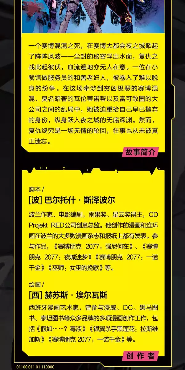 动画《赛博朋克:边缘行者》原案作者巴尔托什·斯泽波尔担任漫画故事脚本。 DC、漫威合作画师赫苏斯·埃尔瓦斯参与绘制。 著名漫画家矩阵@矩阵GTR 绘制中文版封面。