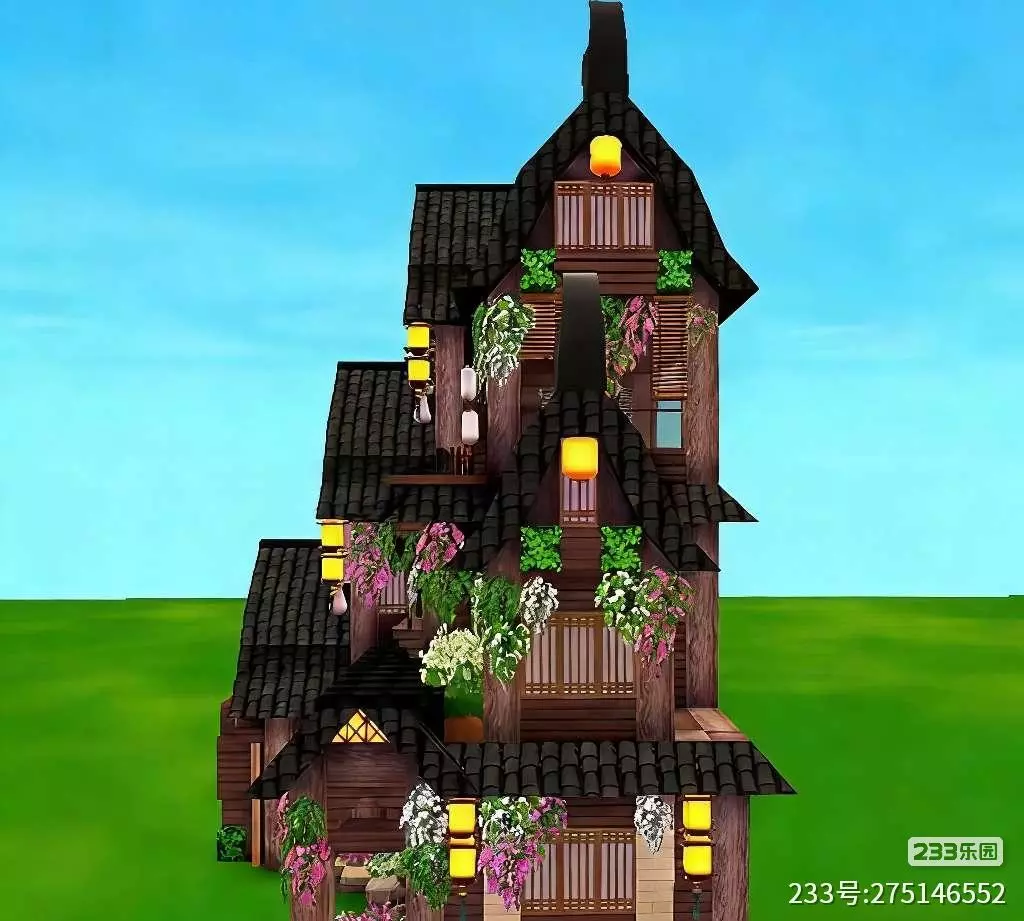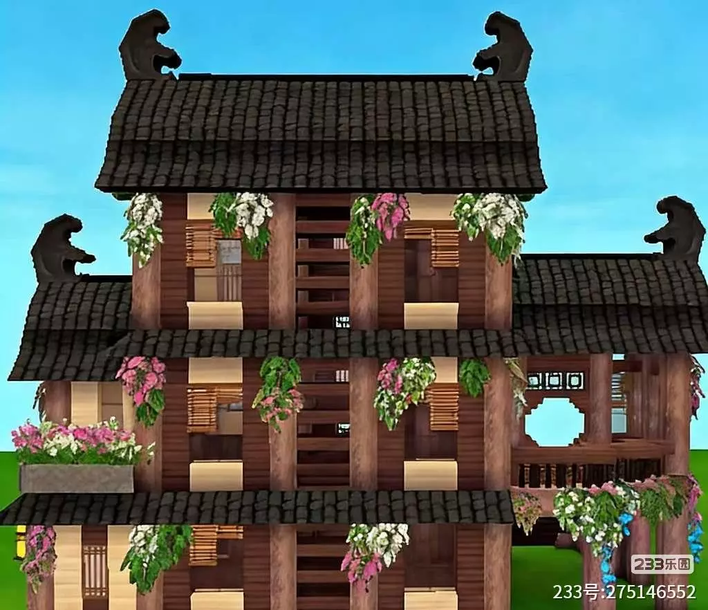 这是《迷你世界》里的中式古风建筑,有着飞翘的屋檐、木质结构,搭配垂挂的花草与暖黄灯笼,尽显“雨打轻舟 水映画楼”的雅致意境,作者申请精华,展现了出色的游戏建筑创作。