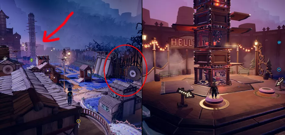 平台跳跃大师 以巨大的门为参考点,从门向左走,你会找到一个名为HELLTOWER的平台。同时激活该平台上的按钮,就会出现一座巨大的塔!当你到达塔顶时(顺便说一下,这非常困难),就能获得成就。 你可以在下方截图中看到该位置和塔本身的样子。