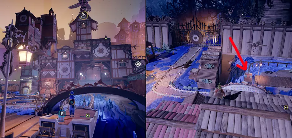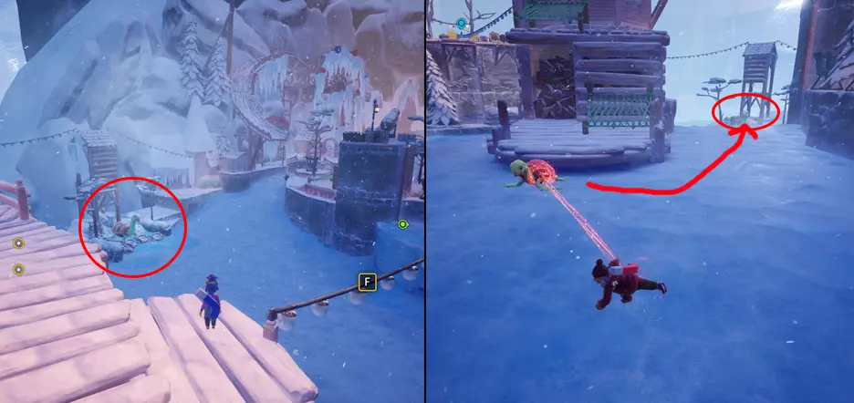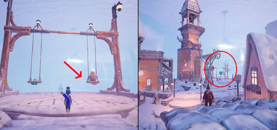 任性的秋千 激活左侧塔楼后,地图边缘将出现秋千。秋千上已经坐着一个可爱的雪人NPC,需要用阳光推动它。它当然会飞走,但过程会很有趣,你也将获得成就。 秋千的位置和外观将在下方截图中显示。