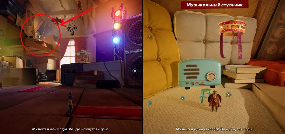 23. 音乐椅子 获取麦克风后,找到国际象棋棋盘!棋盘左侧有一个由书籍搭成的台阶,由此向上。在那里跳上鼓,爬到箱子的最顶部。然后在对面就能看到迷你游戏的隐藏位置。