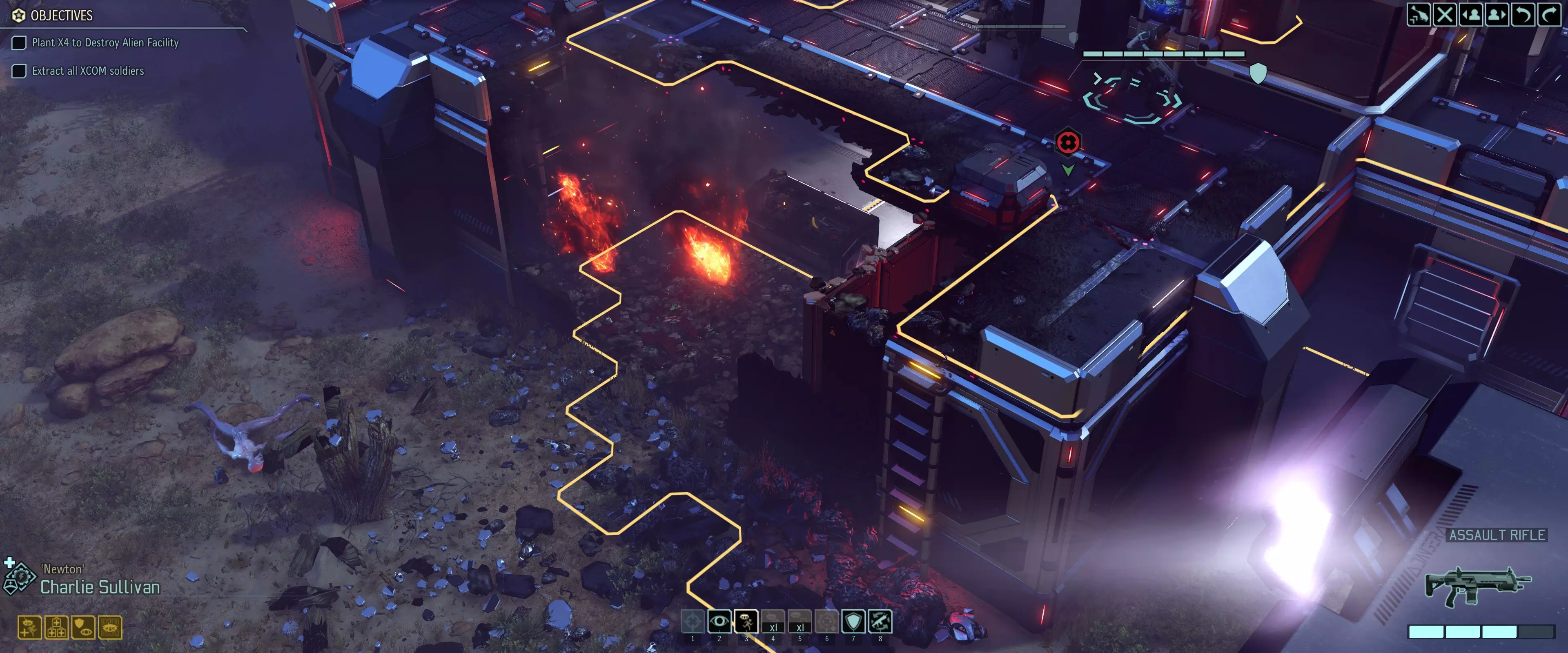 攻击是否致命取决于敌人的强度。 建筑破坏 某些任务(如 Advent 设施)的建筑内驻守着更多的敌人小队。墙壁等障碍物会阻挡视野和弹道,限制更安全的交战选择。