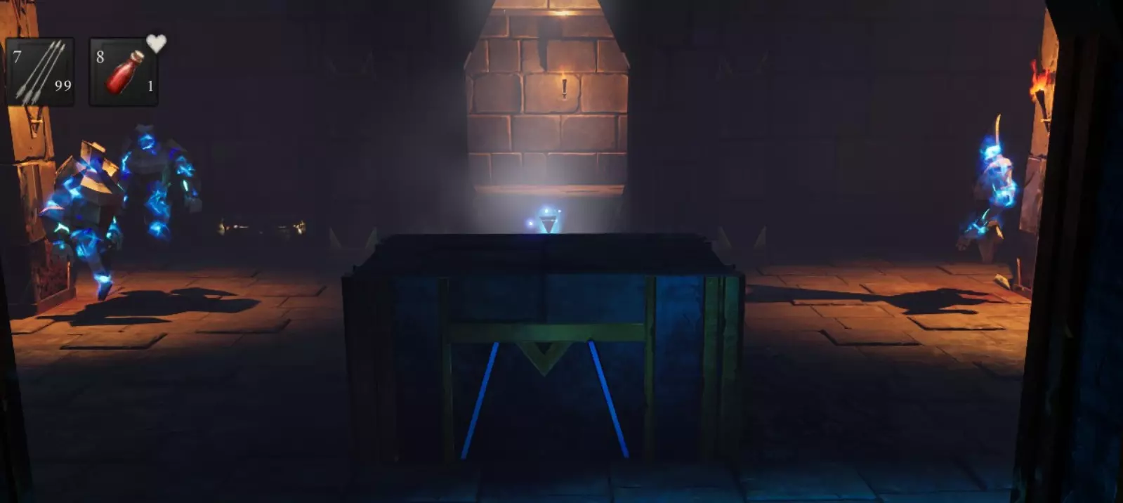 其中两个浩克可以单独拉怪。剩下的一对会一起进入战斗状态并攻击你。你可以把它们拉回有地面陷阱的前一个区域。打开宝箱后继续前进,来到一个三岔路口。