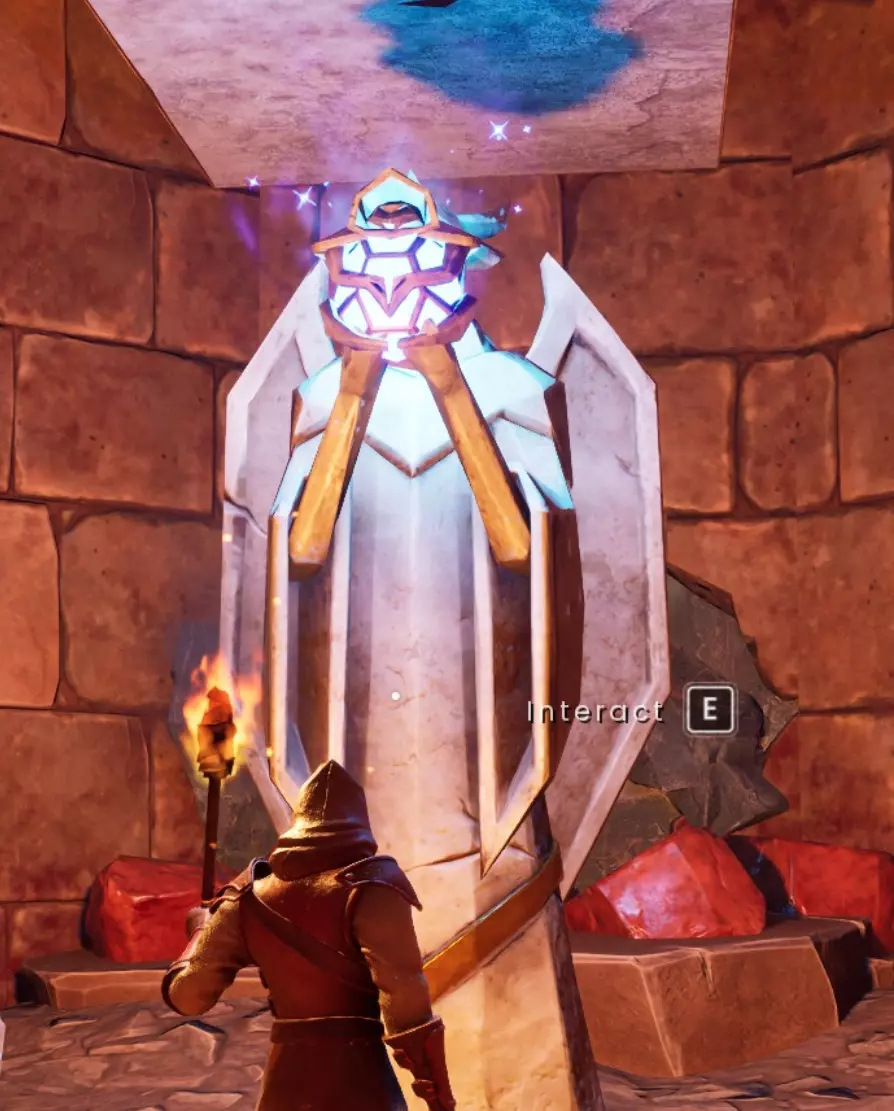 左侧 穿过墙壁陷阱后有一个绿巨人、一个宝箱和一个黏土节点。 右侧 穿过地面陷阱后有一个被两个哨兵守卫的宝库核心。该区域还有2个黏土节点和一只老鼠。与雕像互动可学习【反龙盾牌配方】。