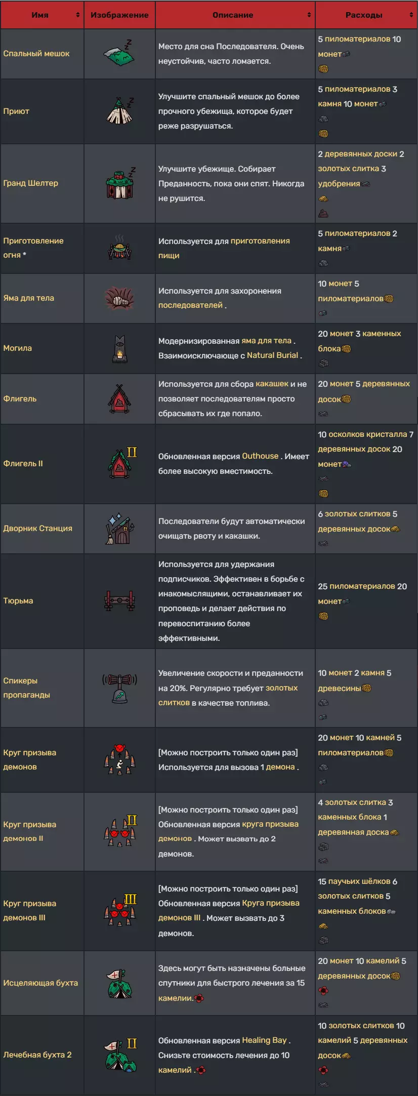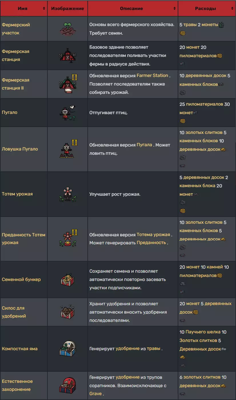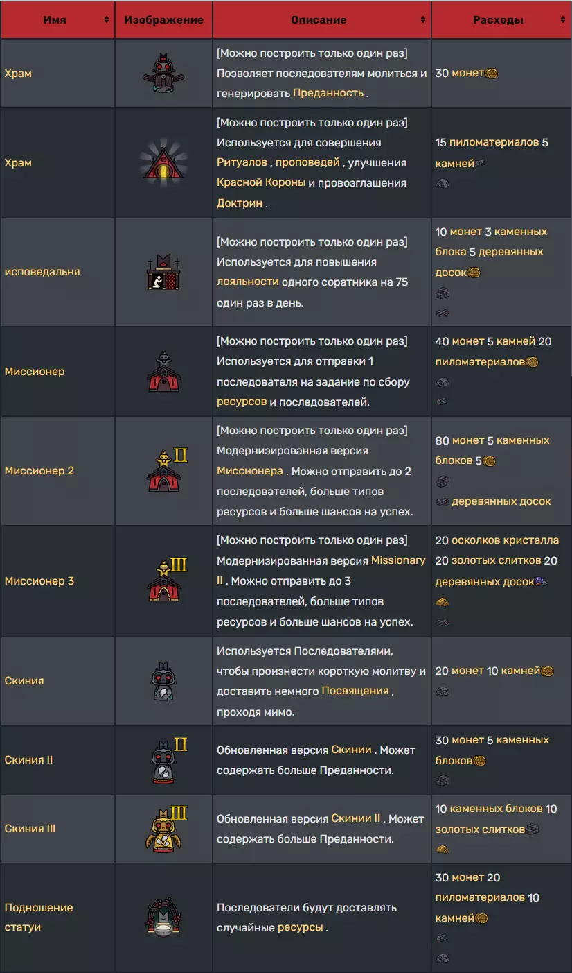 建筑 建筑需建造在教派总部内的任意位置,但中央污秽区域(圣所所在地)除外。建造完成后,信徒可通过建造界面免费自由移动或拆除建筑。 请注意,部分建筑仅可建造一次,且只能进行拆除或移动操作。建筑升级只能在现有较低等级的建筑基础上进行,无法直接建造。 追随者建筑:这些建筑用于支持追随者。 通用