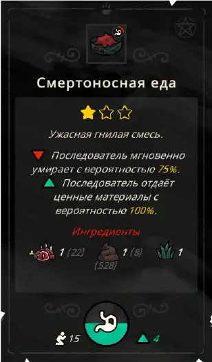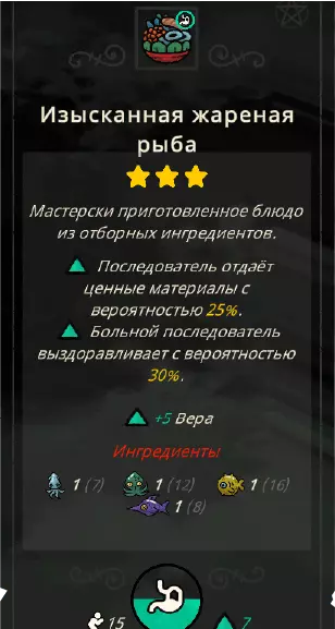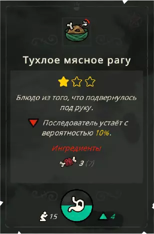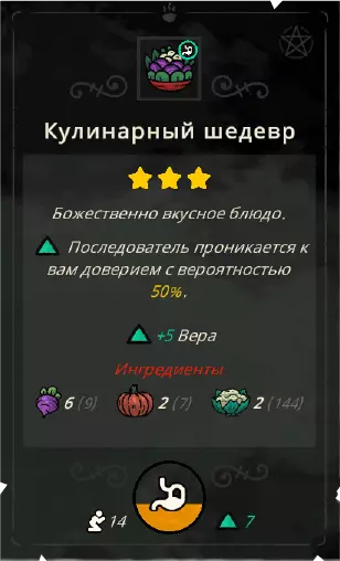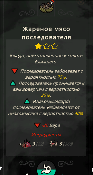 食物 随着新生物群系的开放,你将解锁新的食材,随之而来的还有新的菜肴。例如【蔬菜沙拉】这类菜肴,如果你选择【素食主义】戒律,其属性可能会发生改变。 菜肴分为一星级到三星级。 一星级