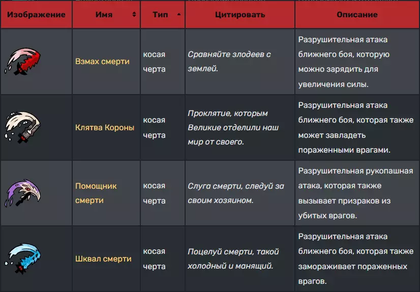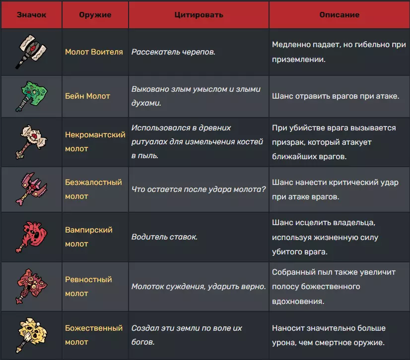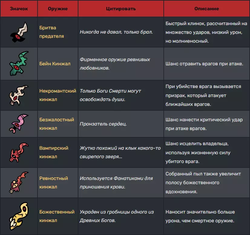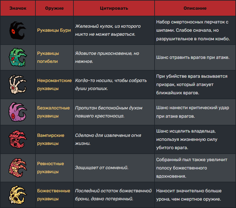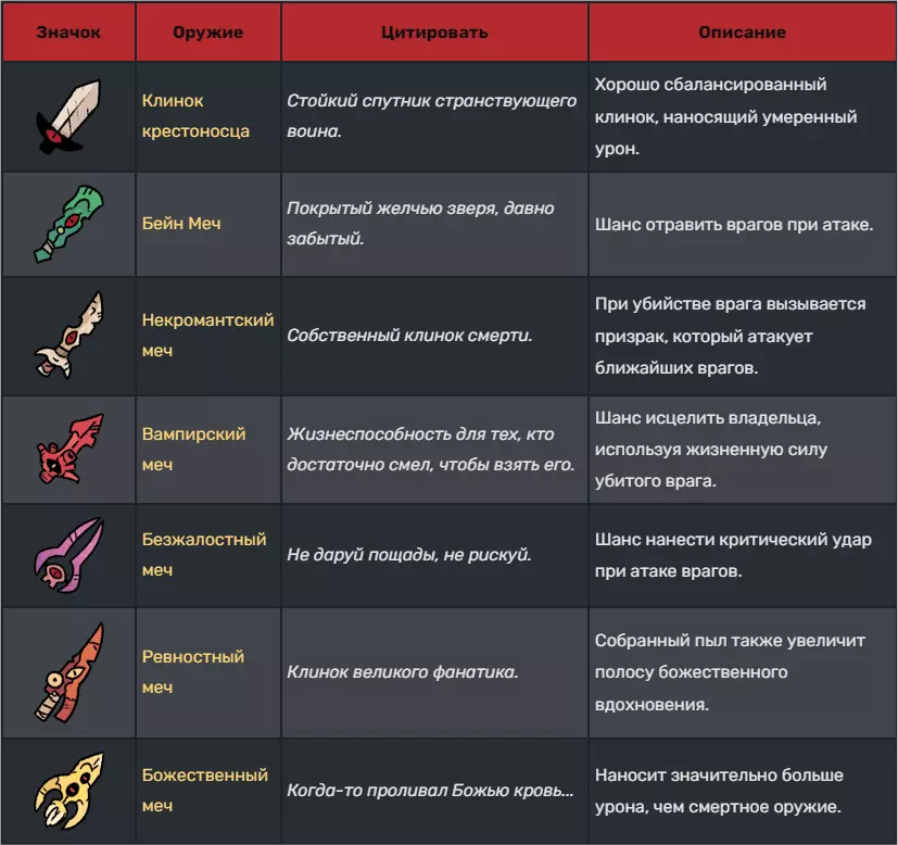 武器 ⚔ 同一种武器的伤害会随等级提升,但其攻击速度和攻击距离保持不变。 武器可通过【教义】解锁,共分为五大类:剑、匕首、斧头、拳套和锤子。 剑:剑在伤害、速度和距离方面较为均衡。