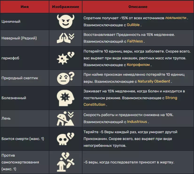 负面特质以红色突出显示。除了【自然怀疑者】仅在招募时生效,之后便无影响外,其他负面特质都会降低追随者的效率。