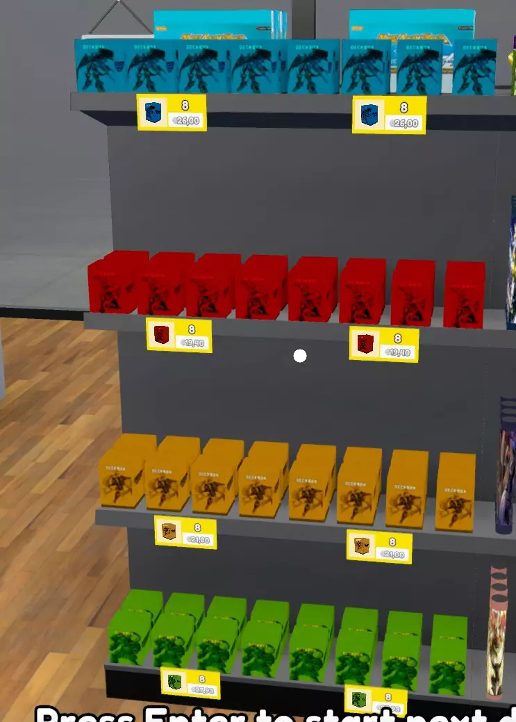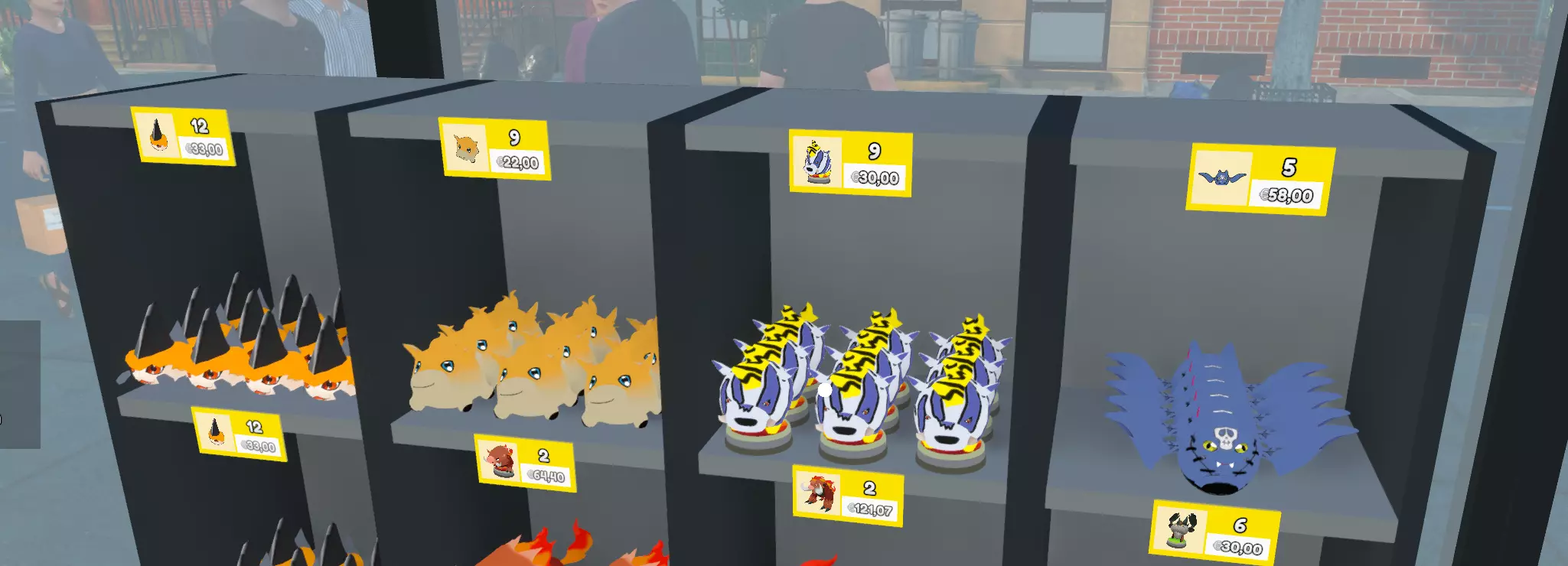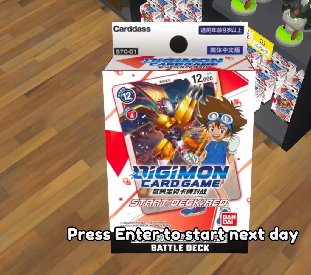 Patch notes v0.36.0 Some cards updated. v0.36.1 Most of the cards and some miscellanea updated. v0.37.0 Updated to work with the new update (v0.37 version). All cards updated. Some misc updated (title, backcards, boxes ...) v0.37.1 Recropped several cards. Added a secret pikachu. v0.37.2 Now the store's players are playing Digimon TCG Resize of several cards. v0.37.3 Added some logos. Changed road signal for Agumon. v0.38.0 Updated to work with the new update (version 0.38). Added card sleeves. Added Playmate icons. Added orange color to the rare pack to avoid confusion. Added one Deck Box (Gallantmon Crimson Mode) Several icons updated. Several images updated/recropped. v0.38.1 Updated images for the Legendary Dragons (Ancient Digimons) Added images to "Ghost" level cards (I forgot these ones on the first version of the mod). Several cards recropped. v0.39.0 Updated to work with the new update (version 0.39). Updated pack icons to match with the 3D-models. Repainted some packs to make them match with their colour. v0.39.1 Added digimon's names to the cards. Tried to make a Patamon plush (I'm not very good with textures, so it looks a little lame, sorry). v0.40.0 Updated to work with the new update (version 0.40). Fixed an issue that avoided the game to load further than 19% (sorry for that). Patamon plush icon ftw v0.40.1 Updated Collection Box Textures Updated Playmats Textures. T-shirts: Now some customers and employees will wear digimon themed tshirts v0.40.2 Updated some missing names. I tried to make a gabumon plush too. Fixed an "error" that gave to almost everyone a angewomon tshirt. (It didn't seem like an error to me). v0.40.3 Added a starmon plush. Updated some pack's icons. Added playmats for the store's tables. v0.40.4 Updated all the pack's icons. Added a new Deck (Megagargomon) Updated Billboard image. v0.41.0 Updated to work with the new update (version 0.41). Updated the tabletop games to be Digimon TGC's Cardbox v0.43.0 Updated to work with the new update (version 0.43). v0.44.0 Updated to work with the new update (version 0.44). v0.44.1 New Deck Boxes New Starter Deck Minor fixes on images. v0.44.1b New Deck Box. Some icons updated. Replaced Falcomon evolution line with Sistermon. v0.45.0 Updated to work with the new update (version 0.45). New Starter Deck Some images and icons updated. v0.45.0b New decks, new cursed plushies and new stuff to sell. v0.45.0c All the decks updated, a new cursed plushie and new games to sell. Corrected the name of several items. v0.46.0 Updated to work with the new update (version 0.46). A new plushie, several cardframes and Ogremon have been added. Some minor fixes on names. v0.46.0b New images for the store's signs, phone wallpaper, Storm Spray, collection book's pages, bulk boxes, ... Digimon's shirts are back!! v0.47.3 New plushie, added some mangas, some minor fixes, added ads. v0.47.3b Some name's errors. All Manga books updated. v0.48.0 Added all the mangas. New card added (Ghost Beelstarmon) All names updated. New playmats added. v0.49.0 Updated to work with the new update (version 0.49). v0.49.2 Updated to work with the new update (version 0.49.2). Added the credit card again (idk when it dissapeared). Added the Stats Icons to the cards. v0.50.1 Updated to work with the new update (version 0.50.1). New cards added. v0.50.2 Updated to work with the new update (version 0.50.2). There are a lot of changes on the texture's size and location, so the new version of the mod is much heavier than expected. v0.50.4 Updated to work with the new update (version 0.50.4). Sorry, I've been really busy these days and was impossible for me to check the status of the game. Merry christmas everyone! v0.51.0 Updated to work with the new update (version 0.51). v0.52.0 Updated with TextureReplacer, this way should work on 0.52 and next versions. Legacy Versions In case you need it, you can access to the old versions of the mod here: https://drive.google.com/drive/folders/1P2nTRy28y7CtARlGrT84OqIfbaVYWAat