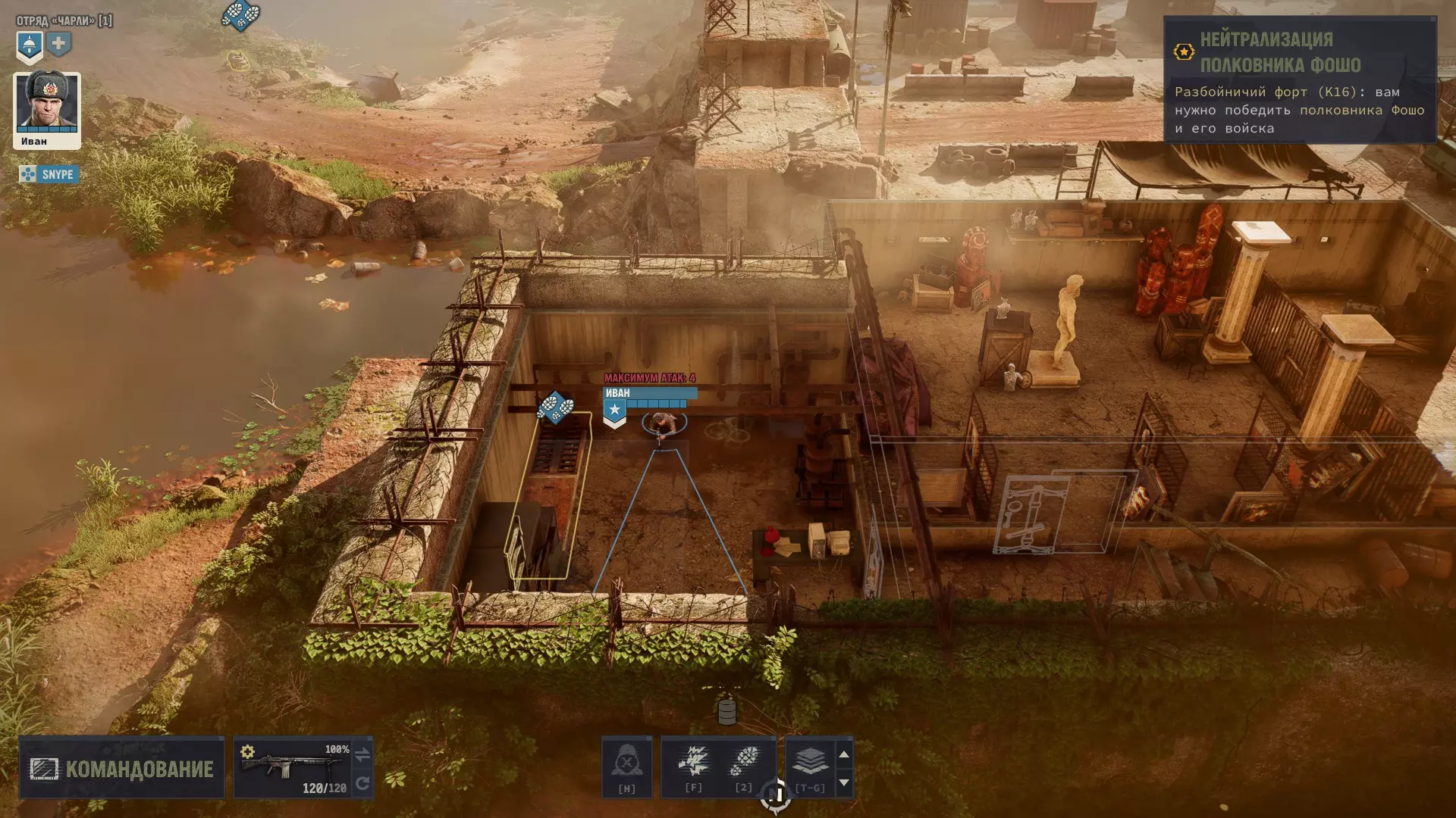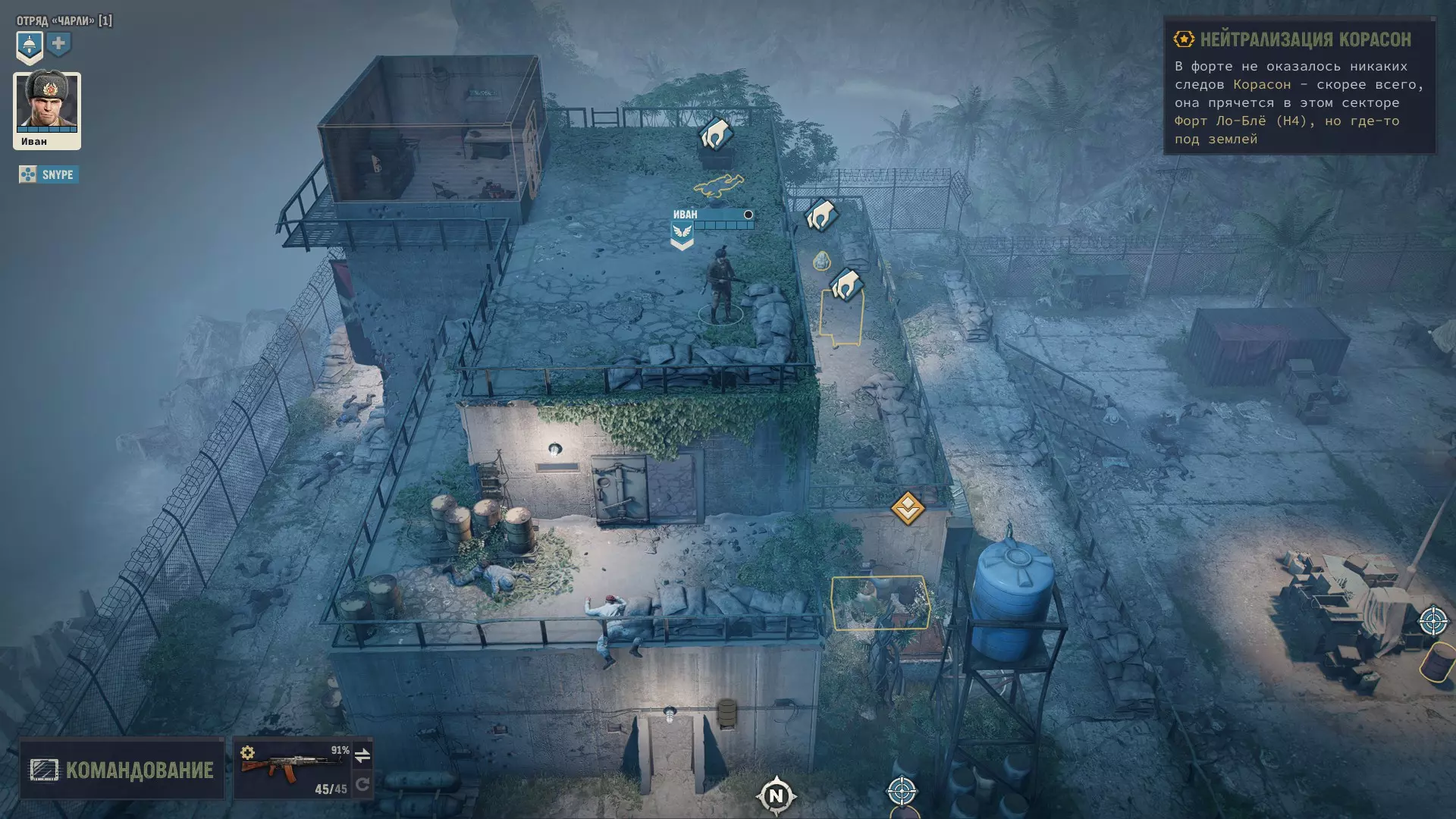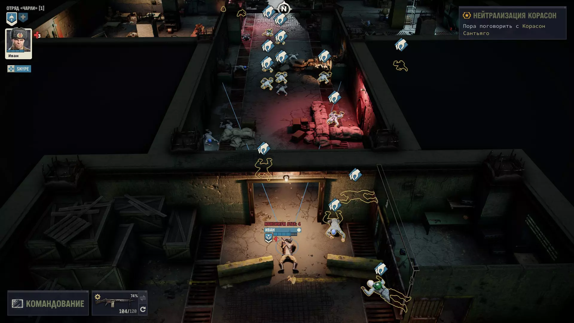 Теперь подробнее, почему именно он, его плюсы и минусы. Плюсы: 1) Главный его плюс, это его уникальная абилка. За каждый килл, он получает 3 ОД. Хмммм, ну 3 ОД и 3 ОД, что же в ней такого имбового. А я вам отвечу: допустим есть такой модифицированный дробовик Auto-5, выстрел из которого стоит 3 ОД, а еще дробовики хорошо любят критовать. Смекаете да, выстрел 3 ОД, за убийство Иван получает обратно 3 ОД и так можно косить просто толпы народу, за 0 ОД. 2) Вторая его абилка, уже не так имбует, но также хороша. Она снижает штраф к точности, при стрельбе очередями. 3) Все его боевые статы уже прокачены. Вам не нужно заморачиваться с прокачкой, с самого старта игры, он уже готовая машина для аннигиляции врагов в промышленных масштабах. Минусы: Главный и основной его минус, это слабые показатели медицины и механики. Иван не сможет лечить свои раны (но это нам будет даже на руку) и не сможет ремонтировать снаряжение. Вообще... НИКАК! Любое оружие имея ниже 70% прочности имеет шанс клина при выстреле и это выглядит серьезной проблемой. Но, и это решаемо. И да, забегая вперед, иногда(крайне редко) придется сейвскамить после клина. Тут уж никуда не деться. Прокачка Ивана Иван стартует на 4 уровне и 3 абилки уже взяты, 2 из них пригодятся, а вот Атака во фланг, увы - бесполезна. Ведь вы играете в одиночку, а значит ситуаций когда эта абилка будет работать, просто не будет. Ну это вообще не критично. Не обязательно брать абилки именно в таком порядке, вы можете вообще качаться по другому, но я выбирал так: Разгон с толчком (свободное перемещение работает на большее расстояние, если вы начинаете свой ход в укрытии). Каждый ход нужно заканчивать в укрытии, это аксиома. Эта абилка даст вам больше маневренности. Зачистка местности (бросок гранаты или выстрел дробовика дает свободное перемещение). Перед боем с Майором, нужно взять или эту абилку, или Штурм, я выбрал эту. Штурм (30% шанс на доп. крит, если вы находитесь в режиме стрельбы в упор). Эту абилку взял уже после Майора, но дробовик нам понадобится еще не раз. Ярость (10% урона за каждое ранение). До Майора эту абилку точно брать не стоит, ибо серьезных боев до него, просто не будет. Там негде будет получать ранения, да и без надобности, ибо все будет вычищаться без напряга. Снайпер (5% крита за каждое прицеливание). Можно брать и раньше, но я выбрал маневренность. Урона Ивану и так хватает. Киллер Получил уже в самом конце почти под финальные титры, когда было уже все равно. Берите, что хотите. Алгоритм боя с такой прокачкой примерно такой: чистите максимум кого можете по стелсу, далее агрите оставшиеся народ. На вас выбегает несколько противников, вы убиваете парочку, а от остальных, на свободном перемещении, просто убегаете. В итоге противник пытается до вас добежать, тратя все ОД и не стреляет. Либо он делает неск.шагов и все-таки решает выстрелить с черти какого расстояния и конечно же мажет. Получается, такой Иван хрен попадешь! В самых сложных боях (обычно с обильным применением дробовика), тактика меняется, но уже более подробно, я буду расписывать в прохождении. Прохождение Версия игры, на которой было прохождение 1.5.1. Ставим легкую сложность (на самом деле, можно любую. Я проходил и на максималке, и на легкой, и не сказать, чтобы особо заметил разницу. Но лучше, ничего себе не усложнять). Из дополнительных модификаторов, я ставил только "A.I.M все