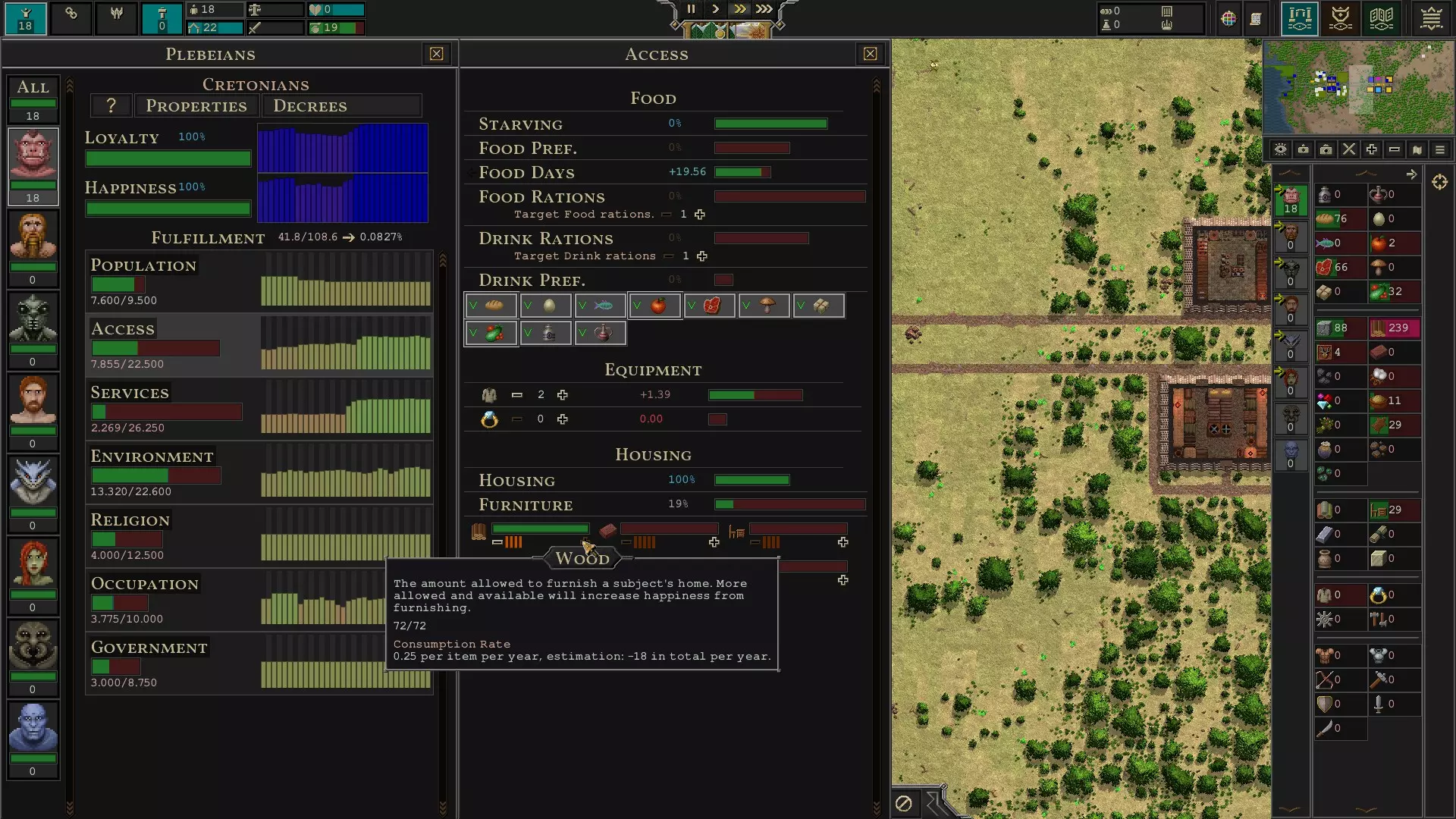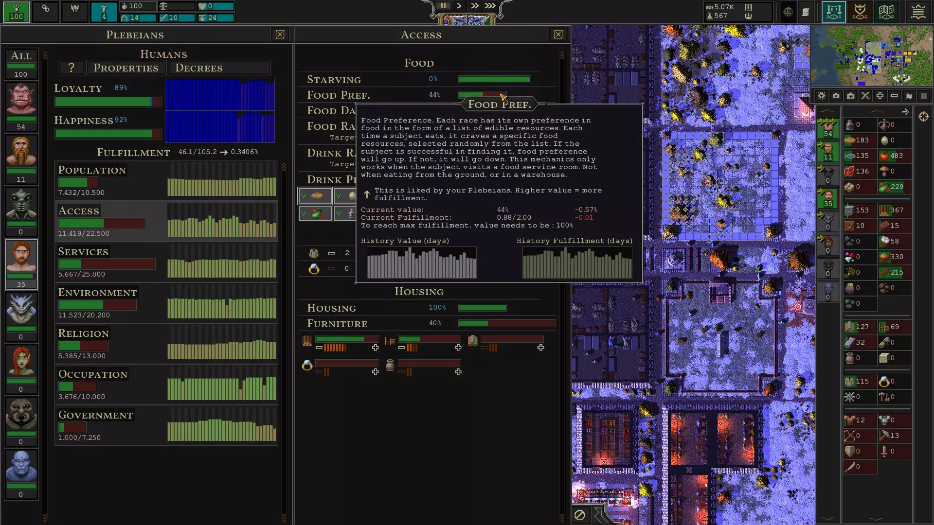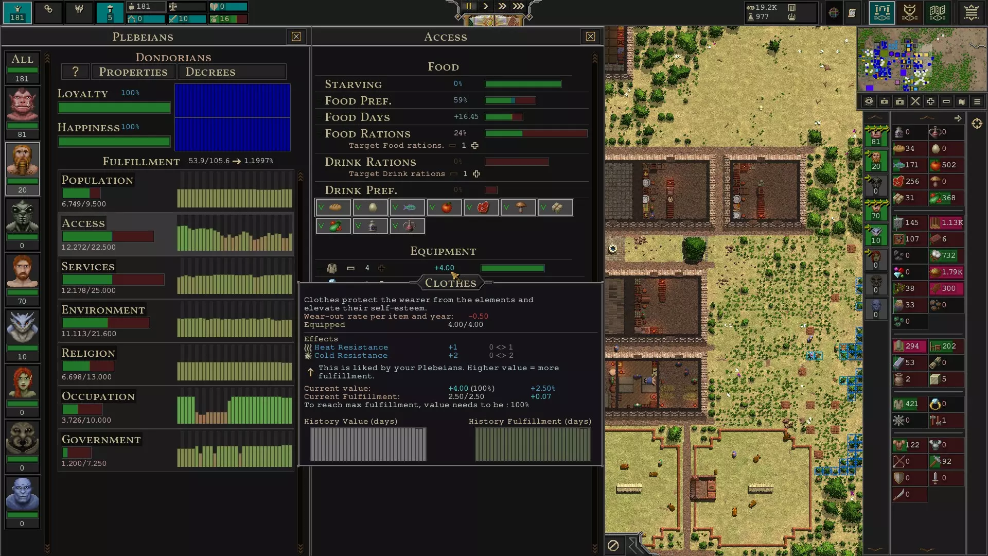 制作清洁工 到目前为止,你的建筑和道路可能看起来有些破旧。清洁工可以修理建筑和道路,防止它们的效率下降。 如果你想停止维护某些区域,可以进入底部的设置菜单,禁用道路或建筑的维护功能。 服装 拥有足够的衣物是保持居民幸福感的关键,如果居民突然变得不开心,很可能是衣物不足导致的。要查看居民拥有的衣物数量,你需要进入任意种族的访问菜单,如下方截图所示。进入访问菜单的方法是:右键点击右侧的某个种族,然后左键点击“满足度”下的“访问”选项。居民期望拥有的默认衣物数量为2件。我想这包括夏季服装和冬季服装。