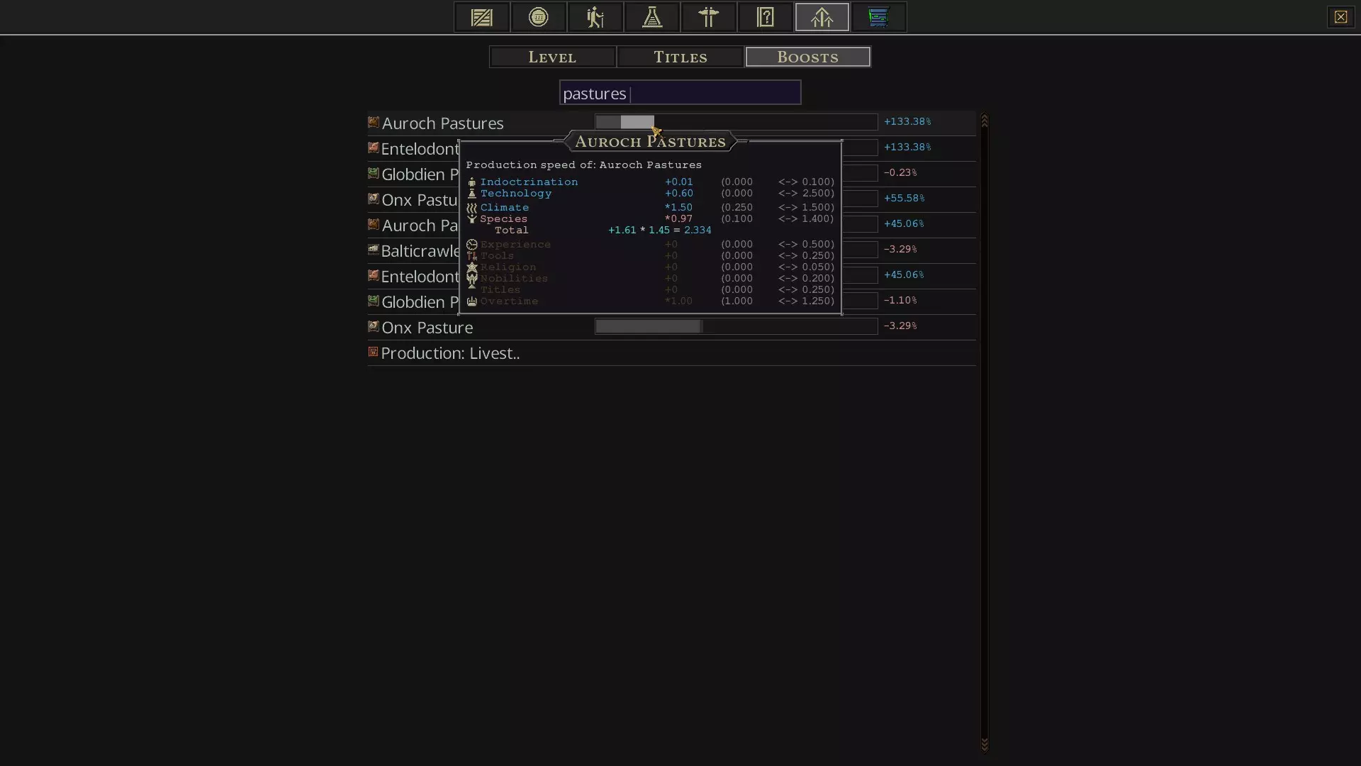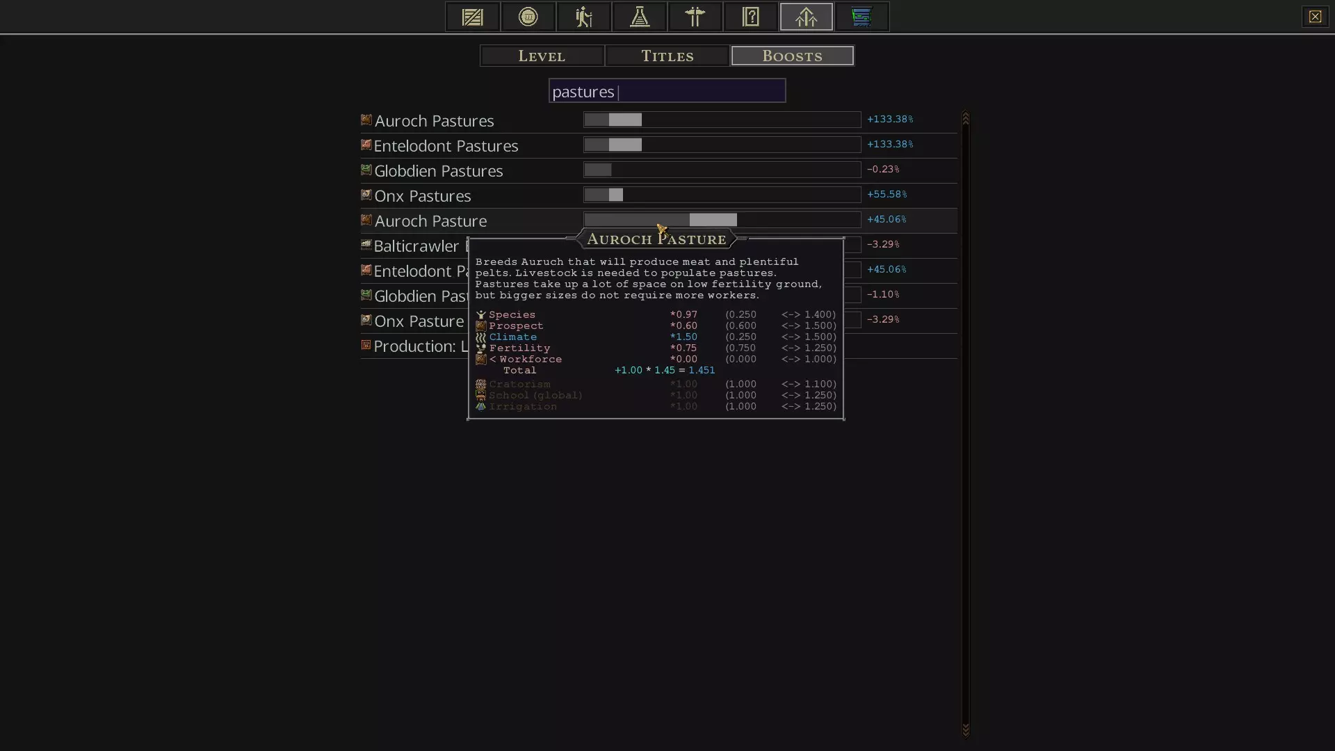 如你在这张截图中所见,我给我的【东多里安人】穿了4件衣服,这样他们就不会那么抱怨了。 要开始制作衣服,你需要木匠制作家具,这样才能建造裁缝铺。你还需要一到两个【野牛围栏】来获取皮革。最后,还需要裁缝铺本身来制作衣服。 如果你靠近地图边缘,可以建造猎人建筑,并将他们的制作配方改为皮革,这样就能直接获取皮革,而无需先建造野牛围栏来起步。不过,最终你还是需要野牛围栏来获取足够的皮革,用于制作衣服或皮甲。或者,你也可以积累足够的科技点来解锁织布技术,从而利用棉花农场或【安克斯牧场】来获取棉花。如果你处于温带地区,那么相比布料法,野牛法不仅更容易设置,而且产出的皮革很可能足够制作衣物。 另外,我推荐野牛和完齿猪的原因是,它们在温带地区都能获得50%的产量加成。你可以通过点击王座,再点击加成,然后在加成下方的框中输入“pastures”来查看此信息。查看加成部分的两个野牛条目截图。我认为第一个条目是牧场生产商品的速度,第二个是产量。不过描述不是很清晰。