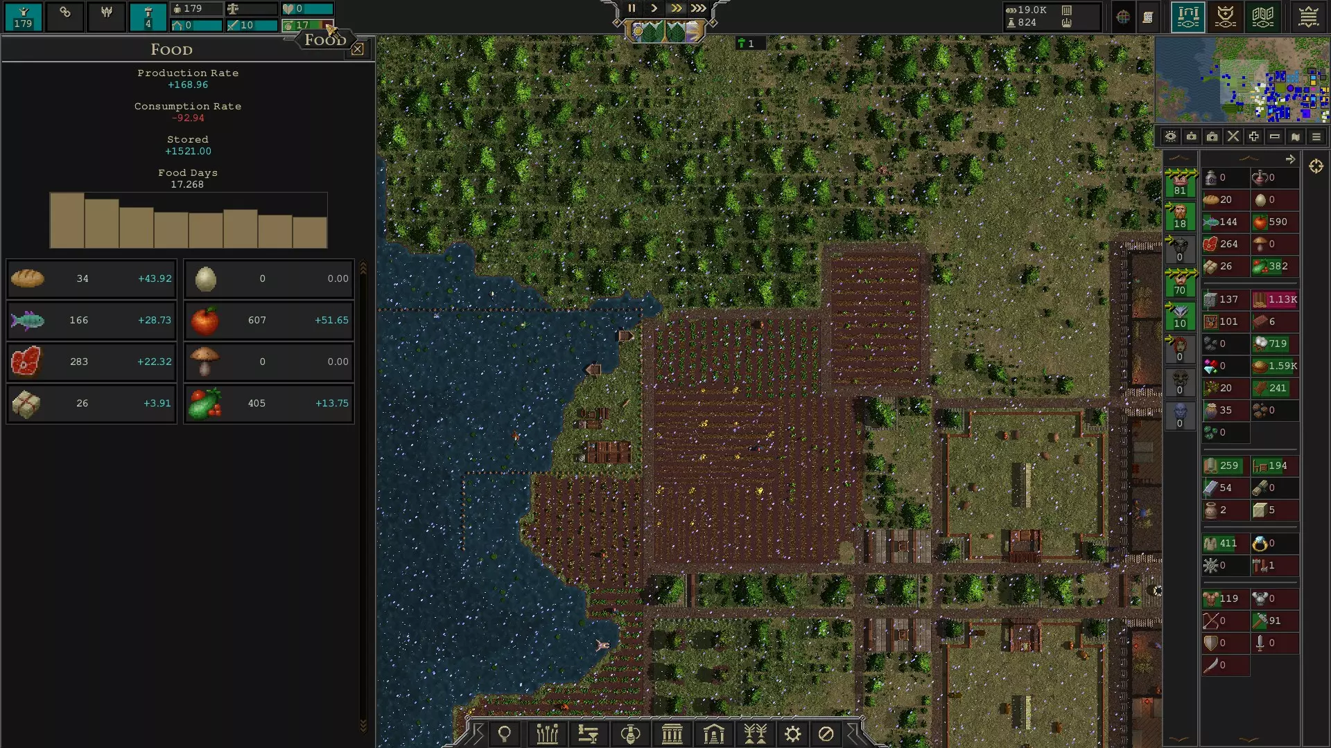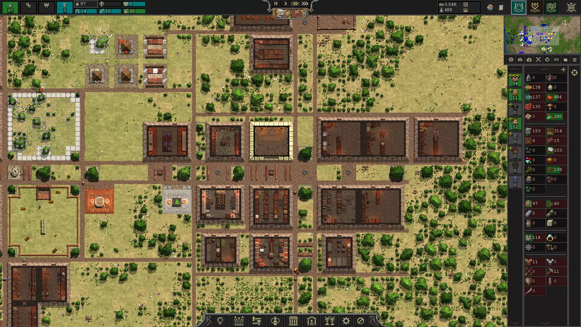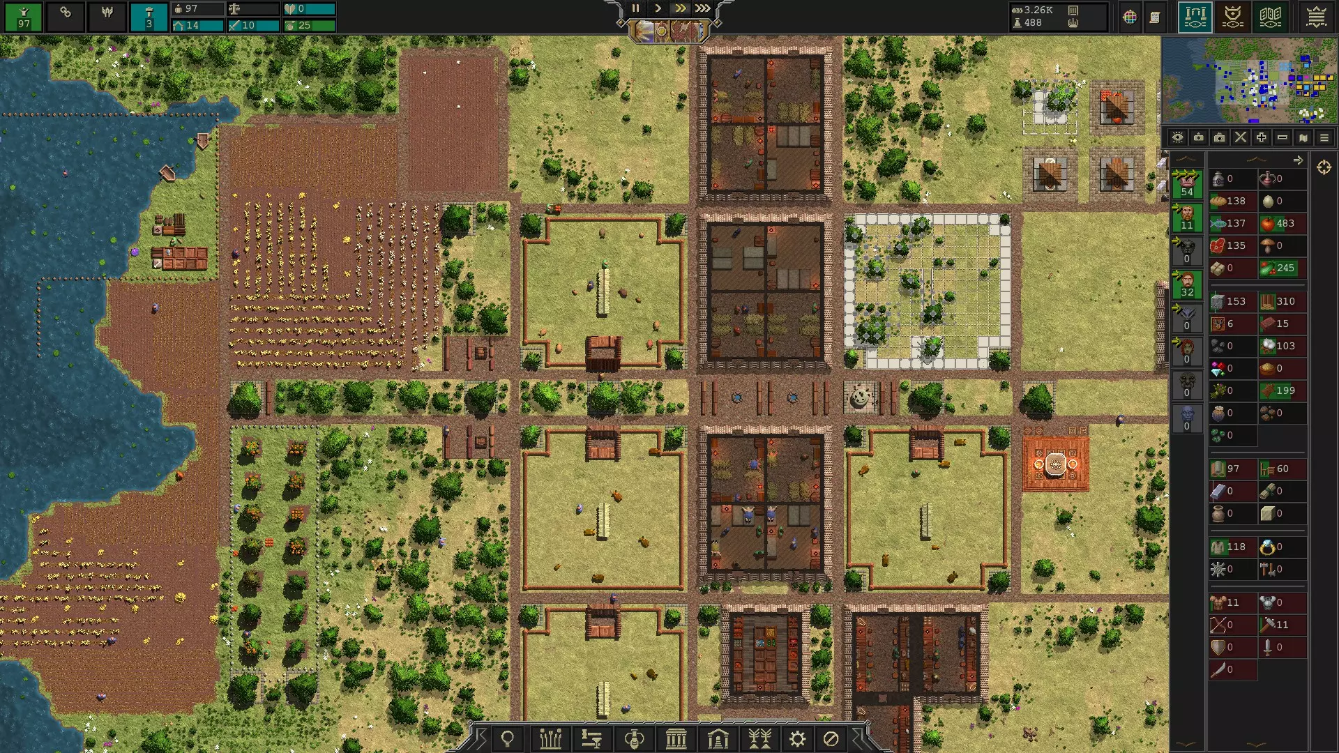 适用于0.66.48版本。 一份关于应该建造什么以及何时建造以避免饿死的指南。 速度设置 在此提及这部分控制选项,因为玩家可能不知道额外的速度设置或如何启用它们。 1 - 暂停。 2 - 1倍速。(再次按下为1/4倍速) 3 - 3倍速。 4 - 25倍速。(再次按下为250倍速) 布局技巧 我喜欢将农场建在 waterfront 附近,因为那里的土地肥力更高。 我会在农场和工业中心之间建造住房、牧场和用于储存食物的仓库。你可以考虑将牧场建在离住房更远的地方,说实话,牧场和住房的布局是后来才考虑的。我还会建造3x3的水井、5x3的壁炉、3x3的树木,以及位于从农场通往工业中心的两条道路中间的3x1长椅。我将支路设计为单格宽的道路,而不是像主路那样宽。 对于工业中心,我将仓库作为该区域的核心。我让工业中心的仓库从居民区仓库调取谷物,这样谷物就能更靠近位于工业区的面包房。我最终建造了以下所有建筑: - 一个最多可容纳10名工人的清洁工小屋 - 一个最多可容纳6名工人的面包房 - 一个最多可容纳6名工人的织布坊 - 一个可容纳5名工人制作家具的木匠铺 - 一个可容纳5名工人制作战锤的木匠铺 - 一个可容纳5名工人将皮革制成衣服的裁缝铺 - 一个可容纳5名工人将布料制成衣服的裁缝铺 - 一个可容纳5名工人将皮革制成皮甲的裁缝铺 制作武器的木匠铺,大约每10个装备战锤的军事单位只需要1名工人。根据生产数量以及每10人作战单位最多消耗80把战锤但仅消耗40件皮甲的情况,制作皮甲的裁缝或许能支持的作战单位数量是制作战锤的木匠的两倍。 你的工业中心的建筑构成可能因你拥有的可用资源而异。我选择了一个肥力高、树木多但自然资源较少的区域。因此,我正在用多余的食物、皮甲、家具、衣物和牲畜来交换金属及其他物资,以升级我的建筑。 你可能注意到我摧毁了地图上生成的那些无人维护的土路。在游戏的早期版本中,清洁工(janitors)会维护这些道路,而这些道路会让清洁工的工作量大幅增加。即使我已下令停止维护道路,但在加载存档后,有时部分道路还是会被重新维护。因此,尽管在当前版本中道路默认被标记为无需维护,我还是将它们拆除了。