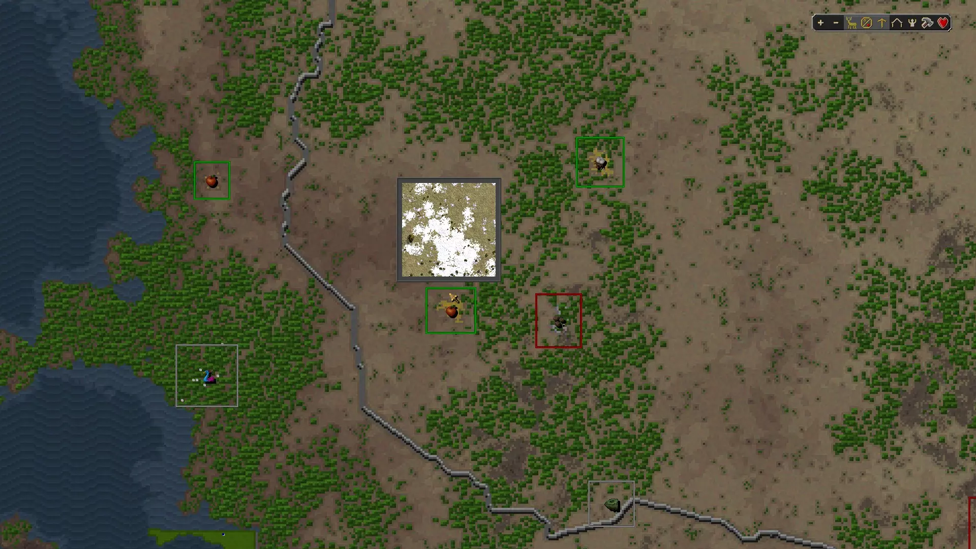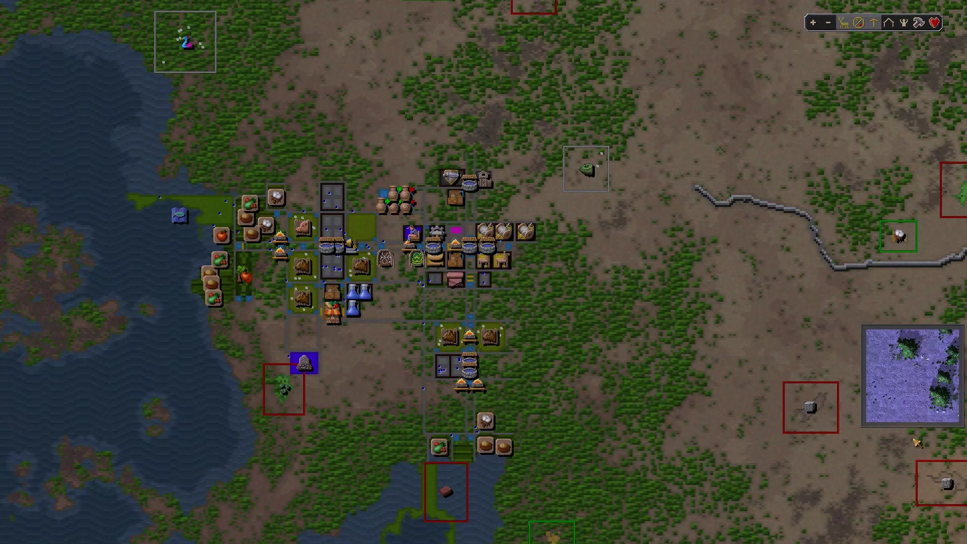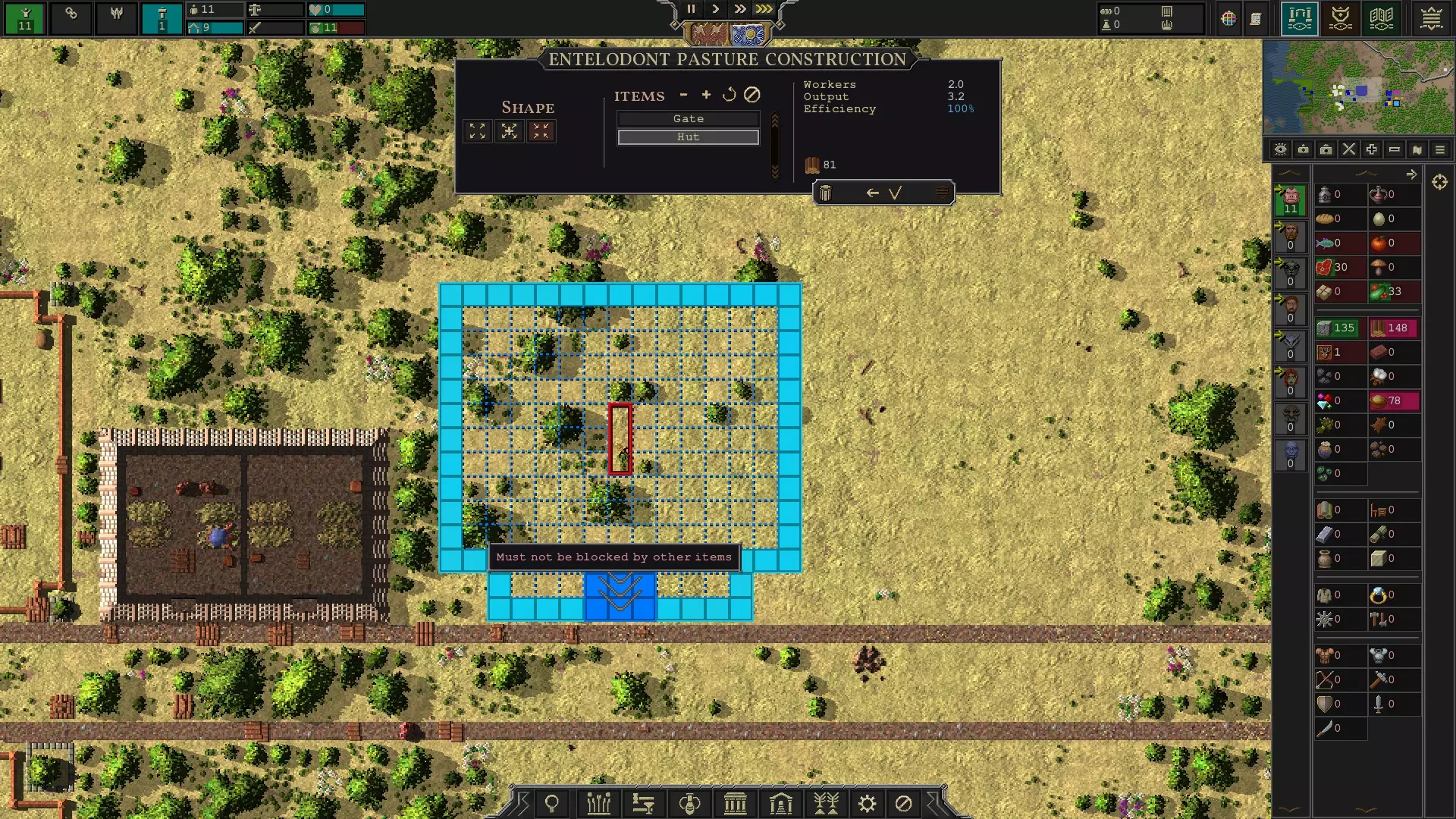 城市中心工业区的景象。我在喧闹的工作场所附近安置了一些住房,供多恩人居住。 开始游戏 首先,为了避免冻死,要建造一个壁炉。如果离水源较远,建造一口井,让村民可以在那里降温并清洁身体。你还需要一个仓库来储存货物,这样货物变质的速度会慢一些。你需要在仓库中为鱼类、肉类、谷物、水果、蔬菜、口粮、石头、木材和牲畜各分配一个箱子,用来存放生成在王座旁的资源以及你将生产的资源。 牲畜是优先需要储存的,因为它们在仓库外每年会变质50%,而在仓库内每年变质25%。等待太久建造牧场的问题在于,牲畜可能会腐坏至0,导致你不得不通过交易来获取更多。我在本指南的牧场部分详细介绍了如何进行交易。 在初始资源被搬运完成前,你应该为仓库分配1名工人。然而,在初始资源搬运完成后,除非你的城镇规模扩大,否则无需继续为仓库分配工人,因为杂役在没有其他工作时会负责将物品搬运到仓库。当没有货物需要搬运时,你的仓库工人应该像杂工一样工作,但如果仓库里有哪怕1件木头可以存放,或者车间里有木头,他们会先去做仓库的工作,然后再做杂活(如果我对他们行为的观察是正确的话)。我喜欢随时保留几个杂工,因为他们可以建造东西、搬运东西,还可以打猎(前提是你告诉他们要猎什么)。要记住,专职仓库工人并非完全没用。在没有投入物流研究的情况下,他们最多可以携带10个单位的资源,而杂工只能携带4个。 牧场和贸易 如果你从温带气候开始游戏,建造一个完齿兽牧场。这么快就建造它的原因是,如果你不把16头牲畜存放在仓库里,一年内它们就会变成8头,而且牧场里的每只动物都需要从仓库中消耗1头牲畜。只要牧场里有动物,并且有足够的工人完成日常照料,牧场就会繁殖出更多的动物。但我还是尽量避免长时间忘记它们。 我建议建造一个15x15的牧场,并从中切割出两到四个2x2的区域,这样你就可以种植树木,从而提升周围的和谐度。我不建议只放置刚好让蓝图模式显示需要2名工人的方块数量,因为一旦建造完成,它会默认需要3名工人,这会导致第三名工人效率低下,并且似乎会让工人的工作量在过多和过少之间不断交替。你需要多放置几个方块,使所需工人数量低于2名的阈值。如果你不确定我的意思,那就放置足够的牧场方块,使其显示需要1.9名工人。同时要记住,土地的肥力(我将在下一部分介绍肥力)会影响所需的工人数量,因此对于符合上述尺寸的牧场,你可能需要更多或更少的工人。这也可能导致你需要更大的小屋,从而需要更多的木材。请记住,牧场中1x4的小屋需要60木材,而2x2的小屋则需要200木材。