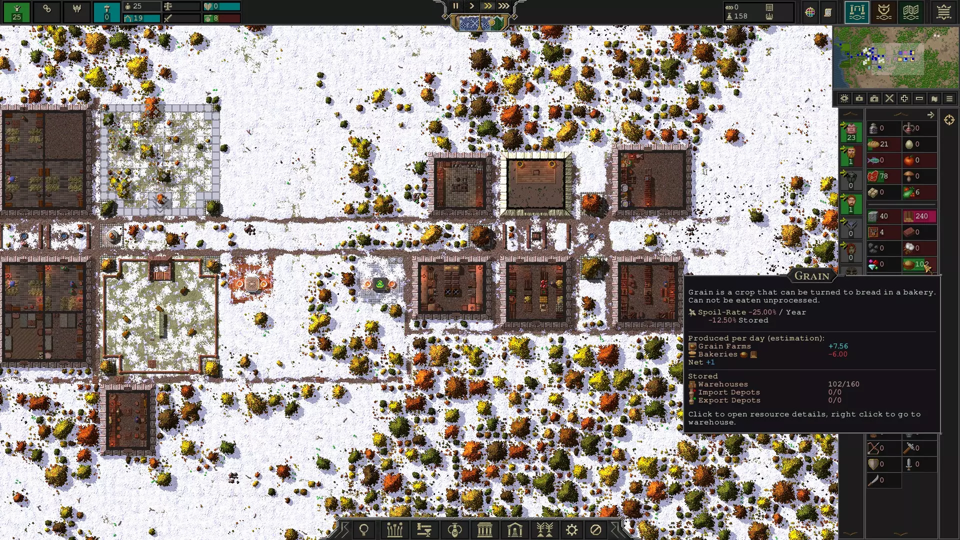 面包房布局。 建造完成后,如果你有1个谷物农场,可能只需要1名面包师,因此在面包房建成后,请移除额外分配的工人。 如果你想查看谷物的年度生产和消耗情况,有两个地方可以查看这些信息。要查看生产量,点击谷物农场,在左上角查看年度生产量。要查看消耗量,点击面包房,在左上角查看年度消耗量。这两项数据可以帮助你了解需要多少名面包师。但请注意,这些信息仅显示当前年度的谷物产量。